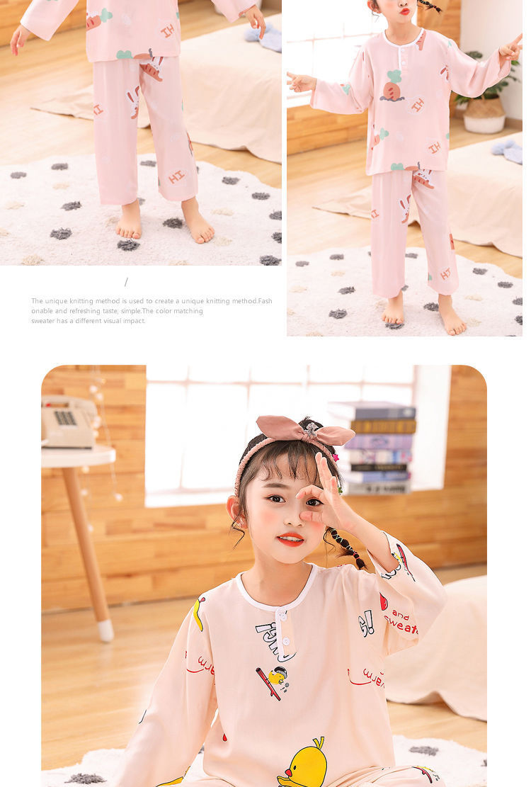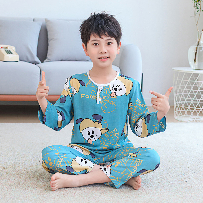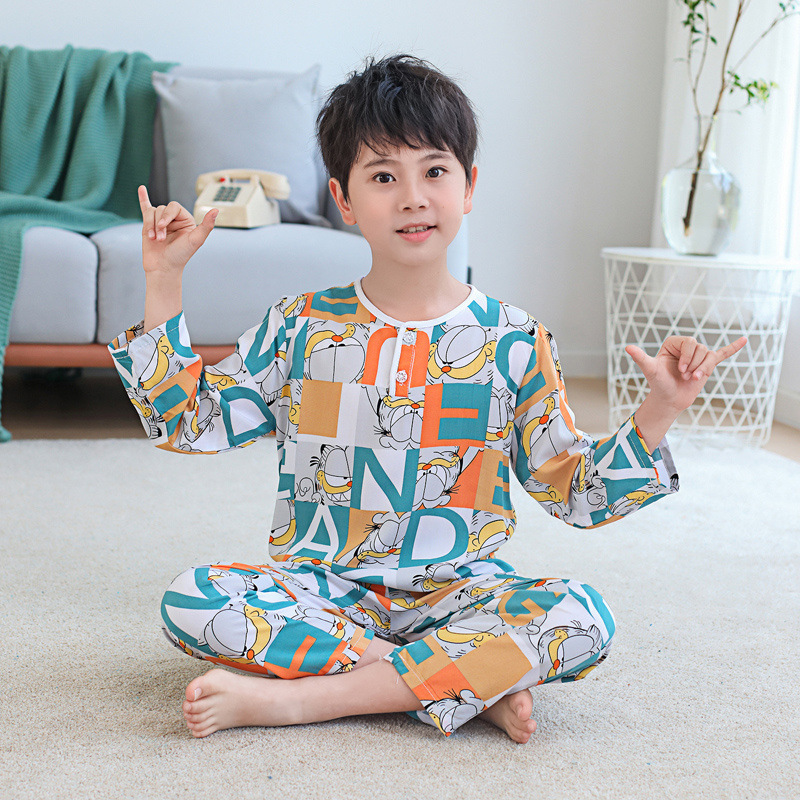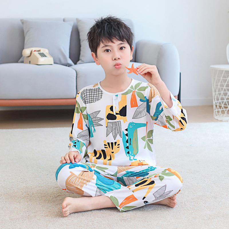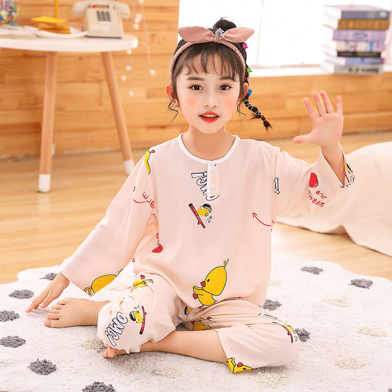 소년과 소녀를위한 여름 어린이 면화 실크 잠옷, 중대형 어린이 얇은 면화 실크 아기 에어컨 가정 의류 긴팔 양복