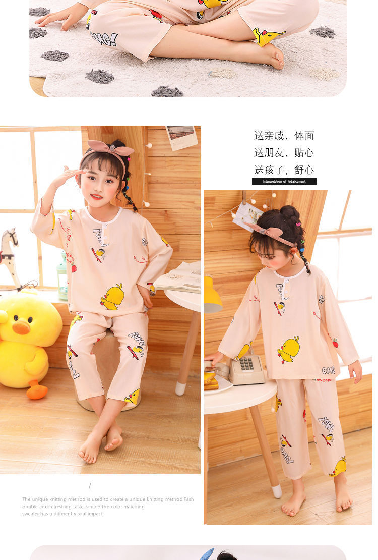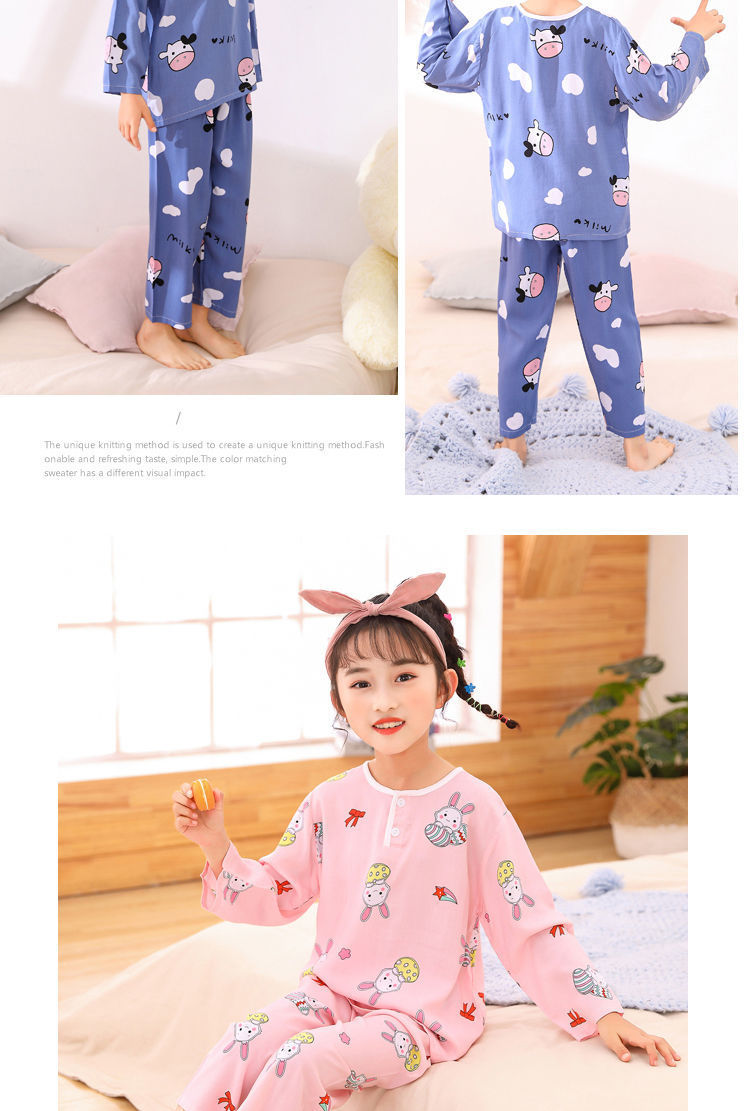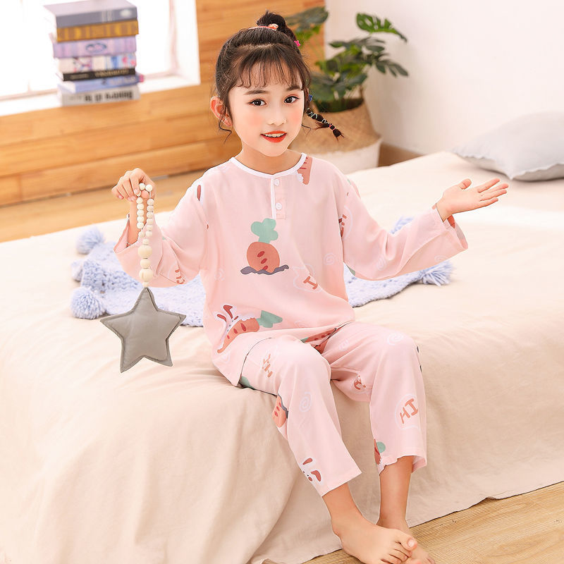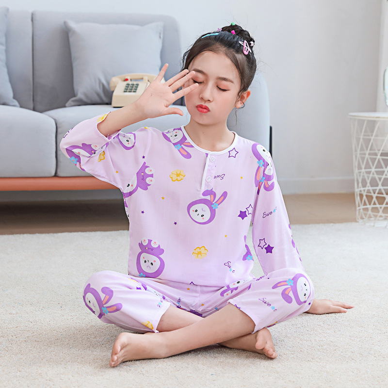 소년과 소녀를위한 여름 어린이 면화 실크 잠옷, 중대형 어린이 얇은 면화 실크 아기 에어컨 가정 의류 긴팔 양복