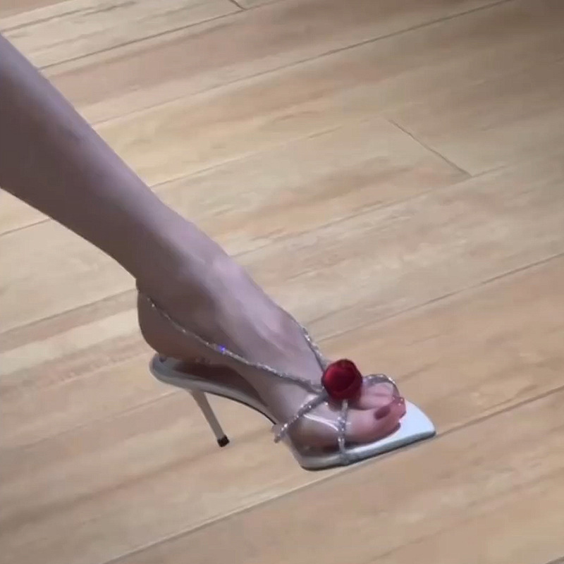 여름 새로운 Peep Toe 포인팅 특허 가죽 라인스톤 플라워 화이트 여성용 섹시한 외모 스틸레토 힐 하이힐