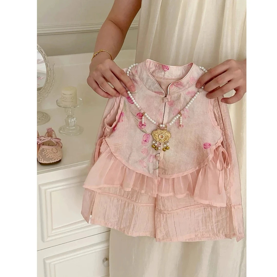 복숭아 죽음! 소녀 새로운 중국 스타일 세트 여름 새로운 국가 스타일 cheongsam 조끼 넓은 다리 바지 투피스 500519