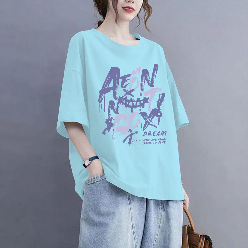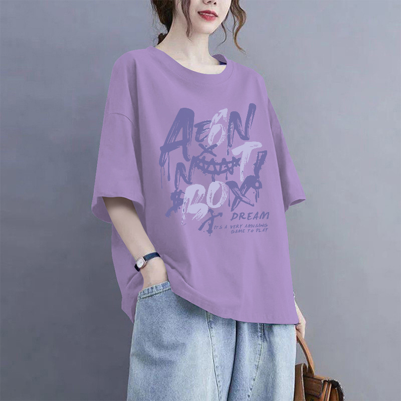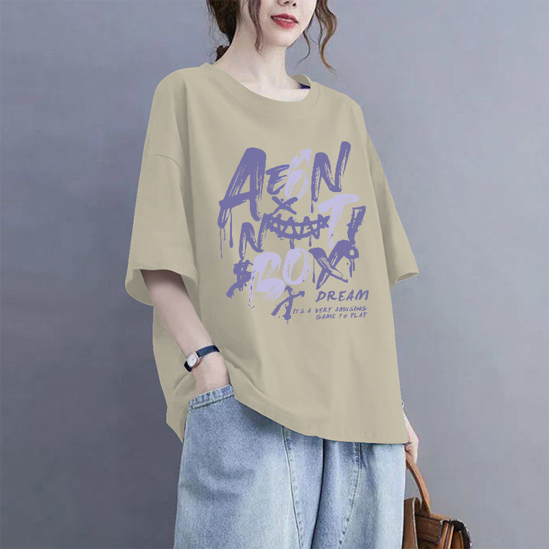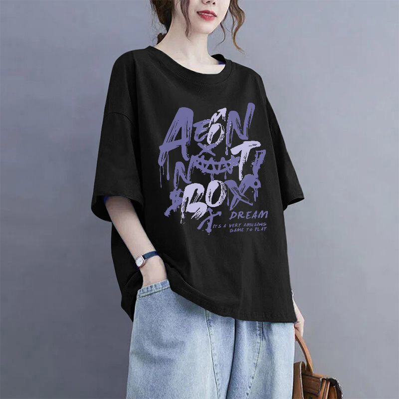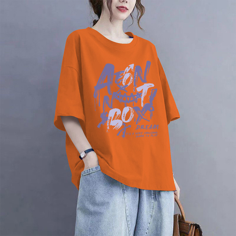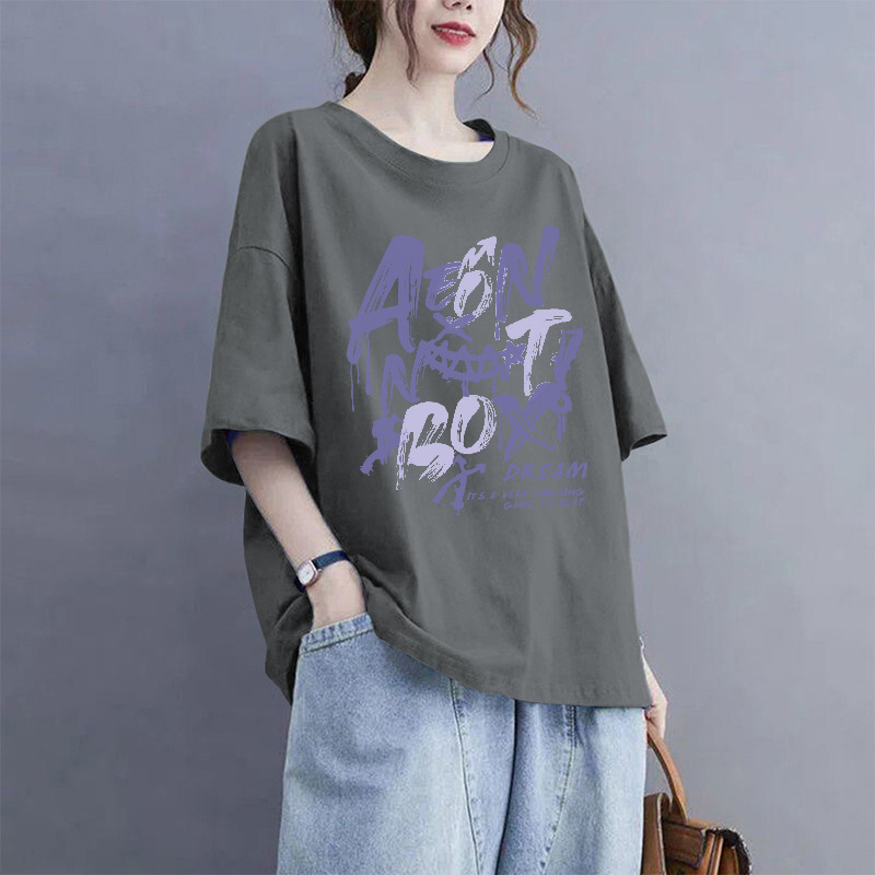 여름 100kg 플러스 사이즈 코튼 티셔츠 반팔 루즈 배 커버 티셔츠 반팔 슬리밍 커버 프린트 탑 여성용스토어 가기