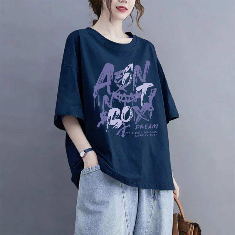 여름 100kg 플러스 사이즈 코튼 티셔츠 반팔 루즈 배 커버 티셔츠 반팔 슬리밍 커버 프린트 탑 여성용