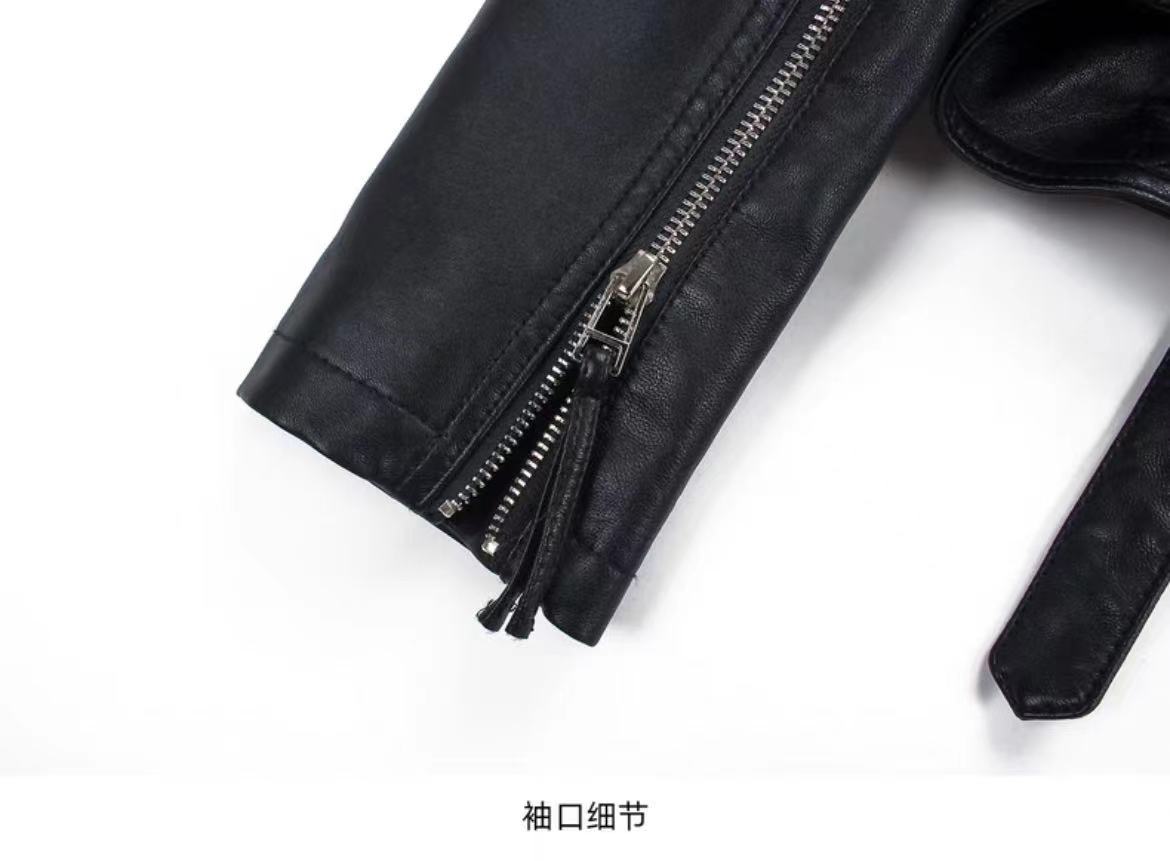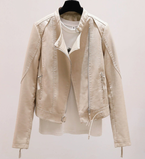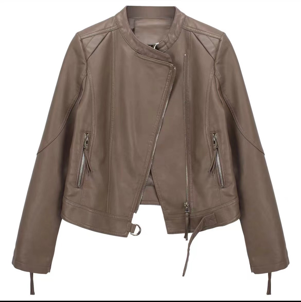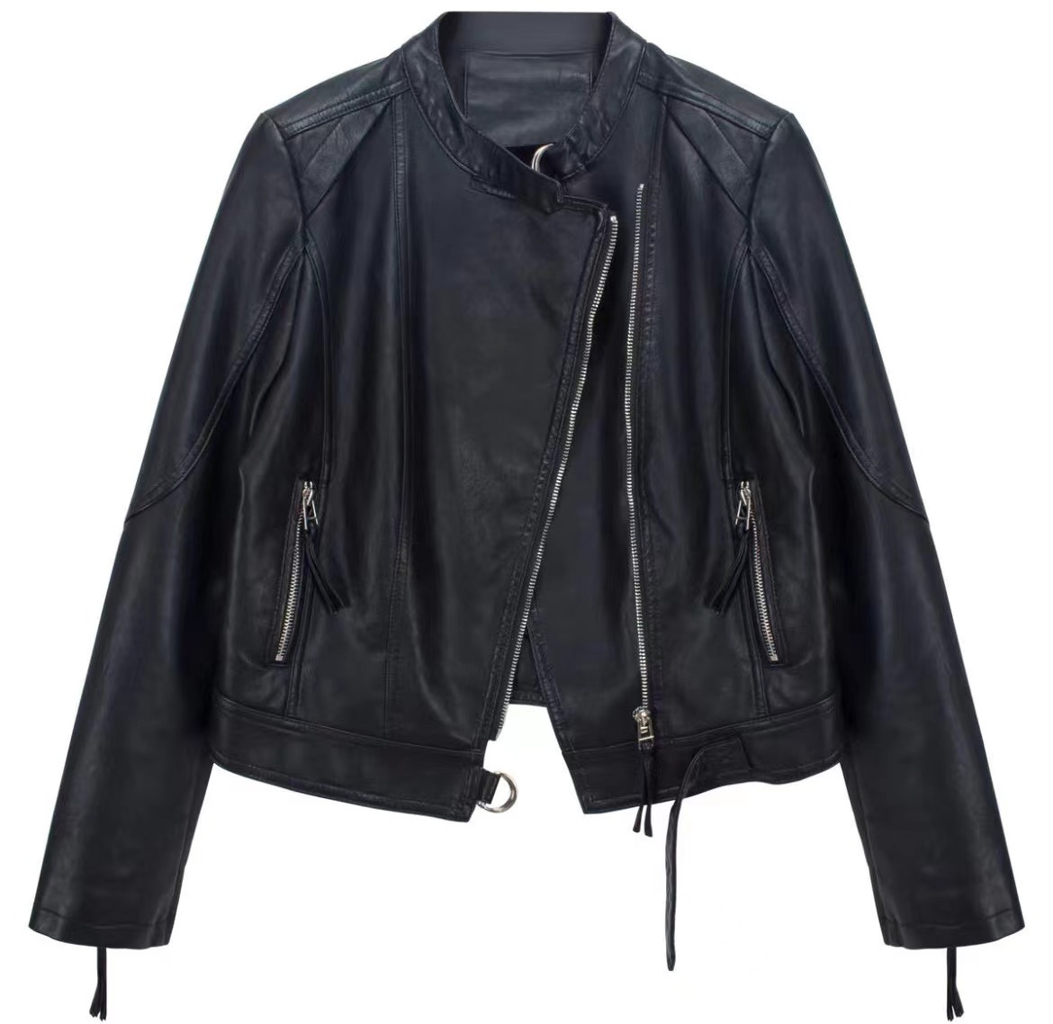 봄 의류 2023 새로운 스탠드 칼라 짧은 PU 가죽 자켓 여성용 금속 버클 한국 스타일 오토바이 슬림 가죽 자켓스토어 가기