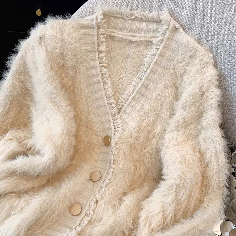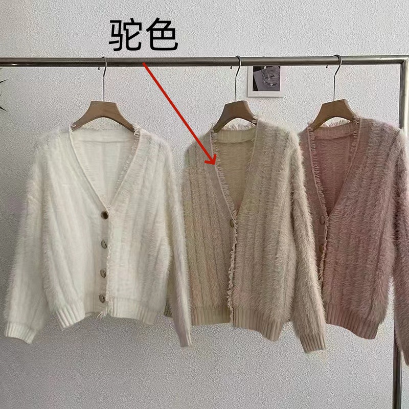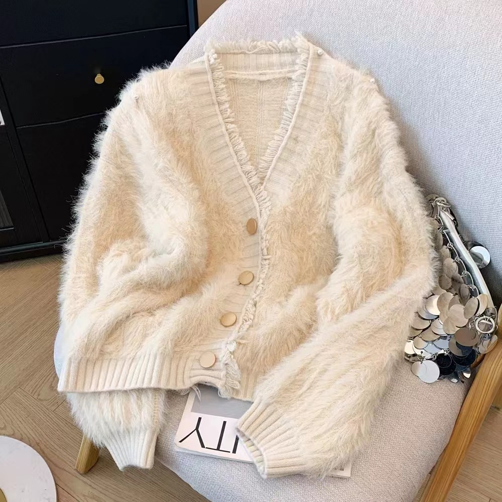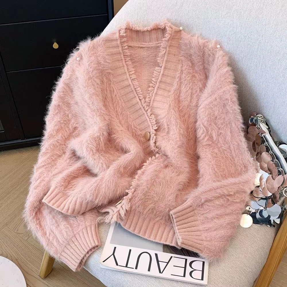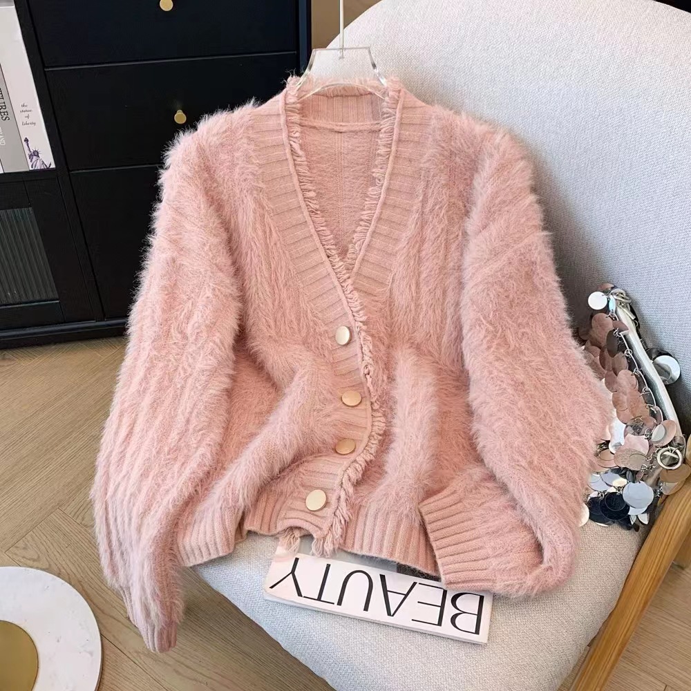 여성을위한 작은 신선한 프린지 v 넥 스웨터 재킷 가을, 겨울 두꺼운 따뜻한 부드러운 fufu 모조 밍크 벨벳 니트 카디건 탑