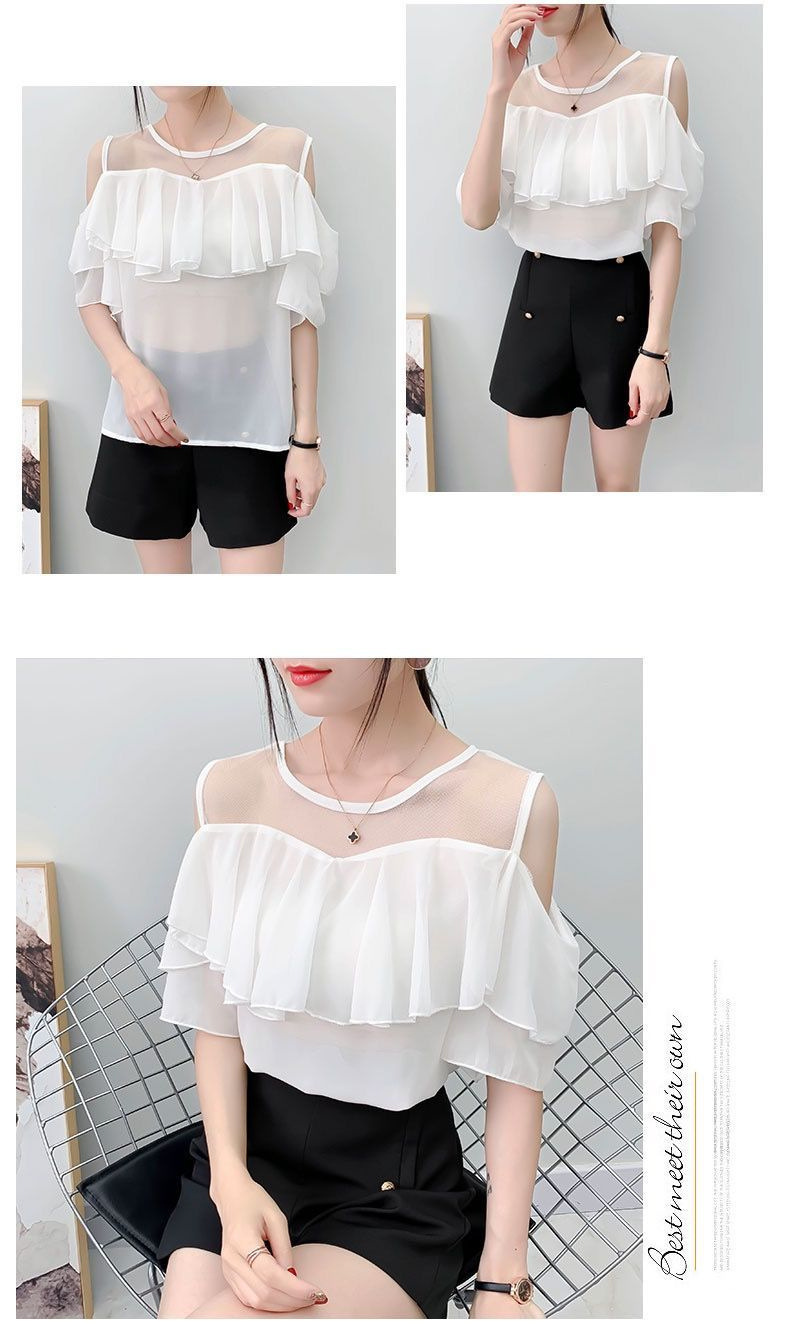 여름 슈퍼 요정 반팔 주름 스위트 탑 여성용 루즈한 배 커버 러플 오프 숄더 레이스 쉬폰 셔츠