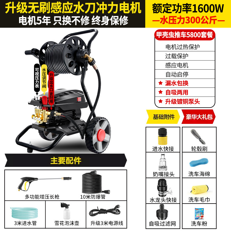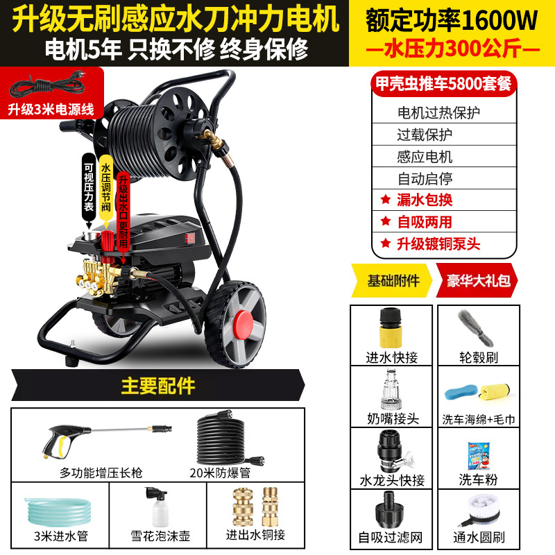 • 카트 버전 [브러시리스 유도 순동 코어 모터 5800] 10m 방폭 물 배출 파이프 + 슈퍼차지 롱 건 + 이중 구리 연결 + 물 원형 브러시 액세서리 세차 선물 팩 [압력계]