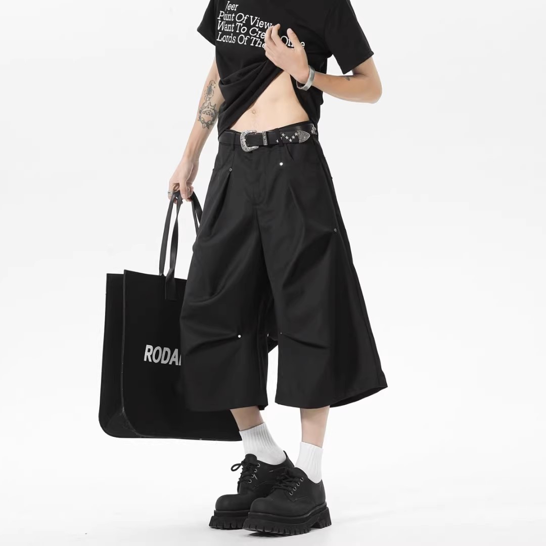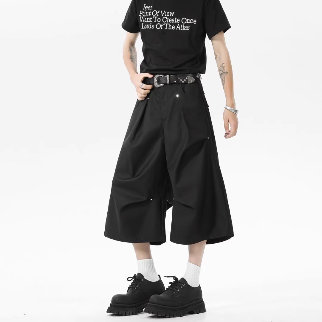 블랙 리벳 플리츠 채플린 반바지 남성 여름 루즈하고 시원한 낙하산 바지 클린핏 와이드 레그 크롭 팬츠