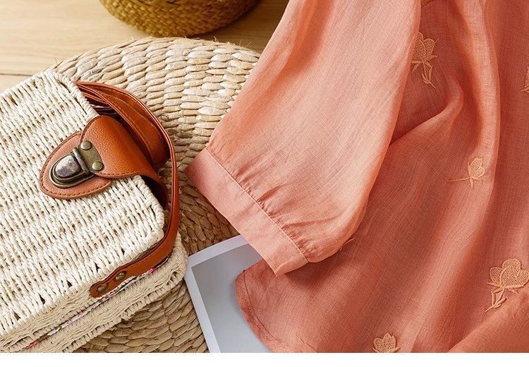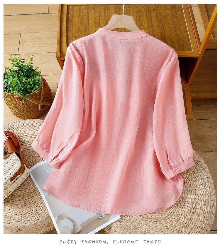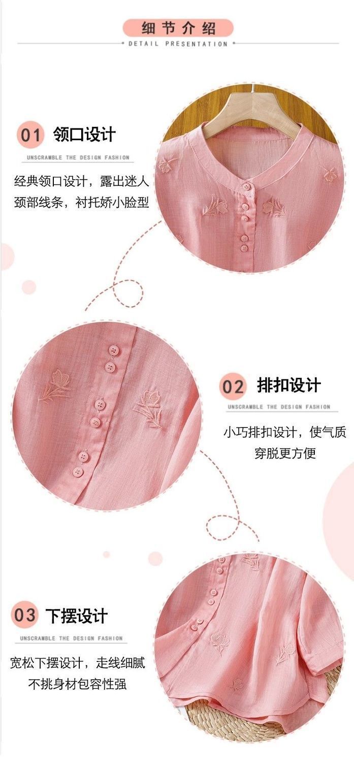 여름 여성을 위한 한국식 복고풍 스탠드 칼라 자수 면 및 린넨 셔츠 새로운 스타일의 나이를 줄여주는 루즈하고 패셔너블한 5부 소매 셔츠스토어 가기