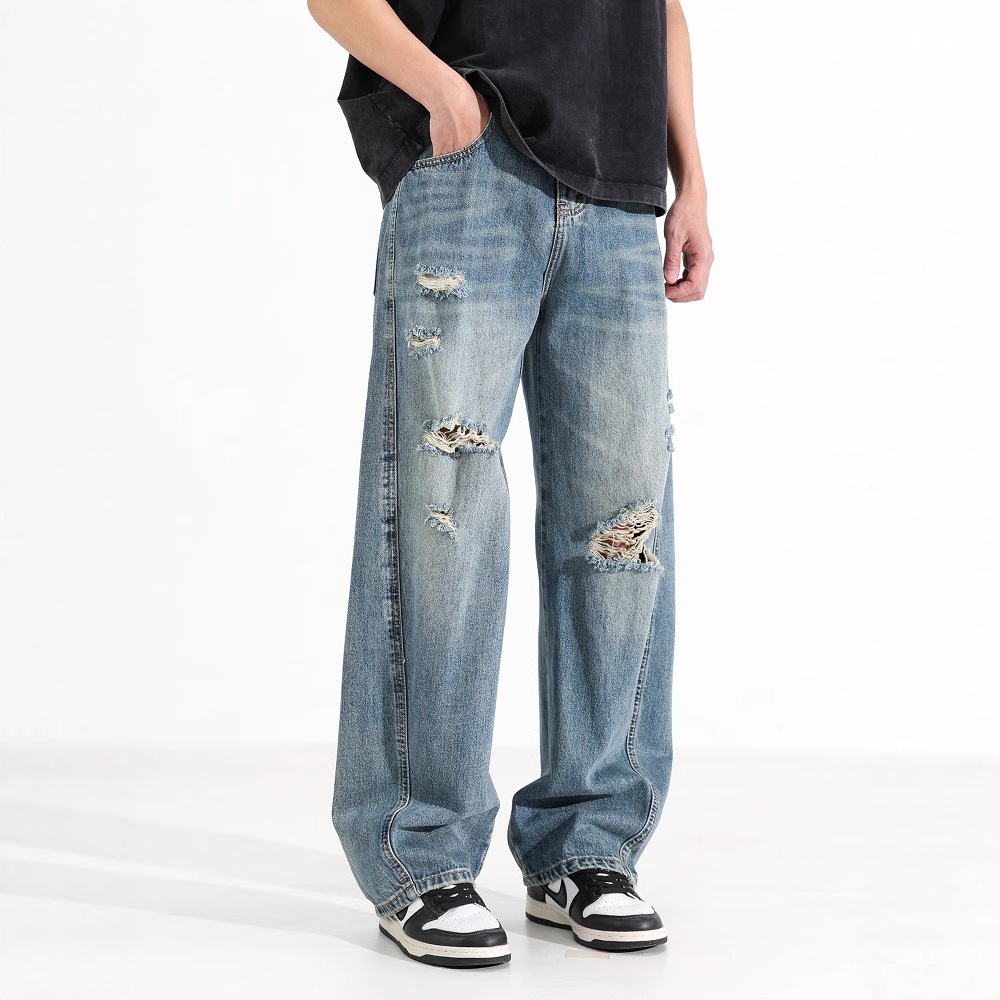 여름 신작 아메리칸 레트로 빈티지 헤비 워싱 찢어진 청바지 남성용 루즈 와이드 레그 세이버 팬츠스토어 가기