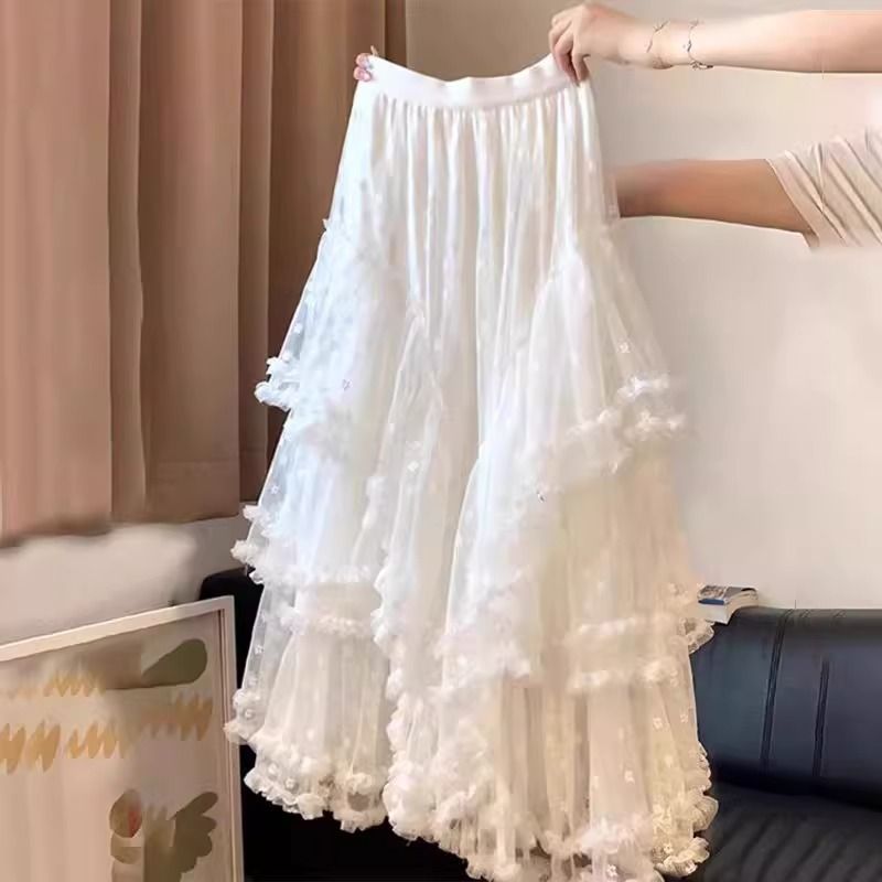 고품질 오리지널 대량 재고 소녀의 흰색 달빛 거즈 스커트 2025 봄 흰색 심플 스위트 레이스 스커트