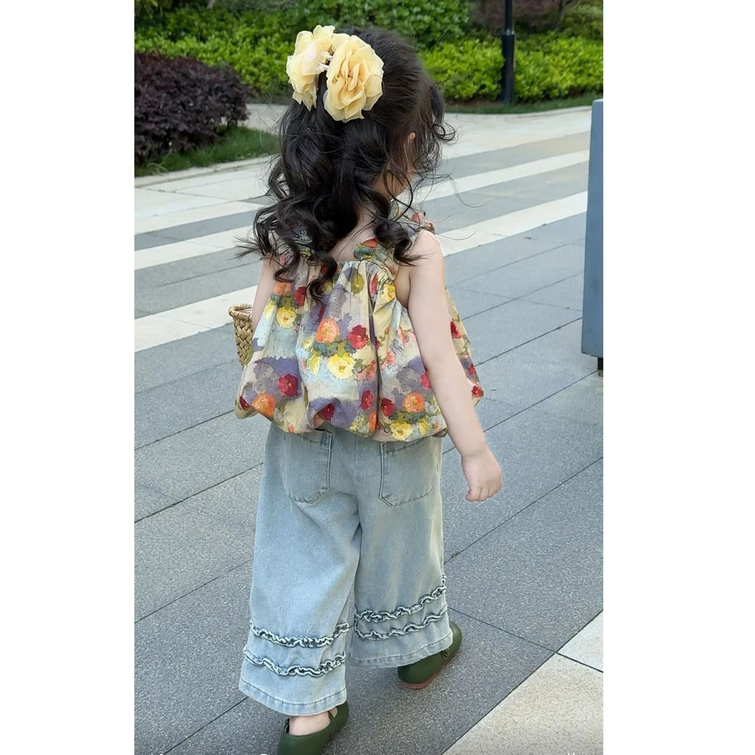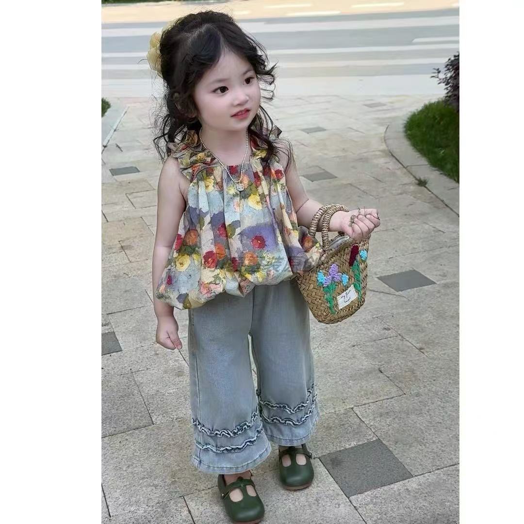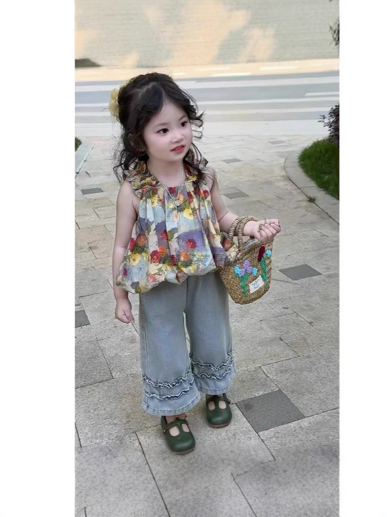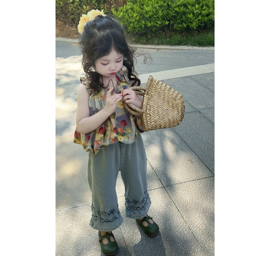 여아 정장 한국 스타일 꽃무늬 꽃봉오리 캐미솔 여아 다용도 레이스 스트레이트 청바지 500381
