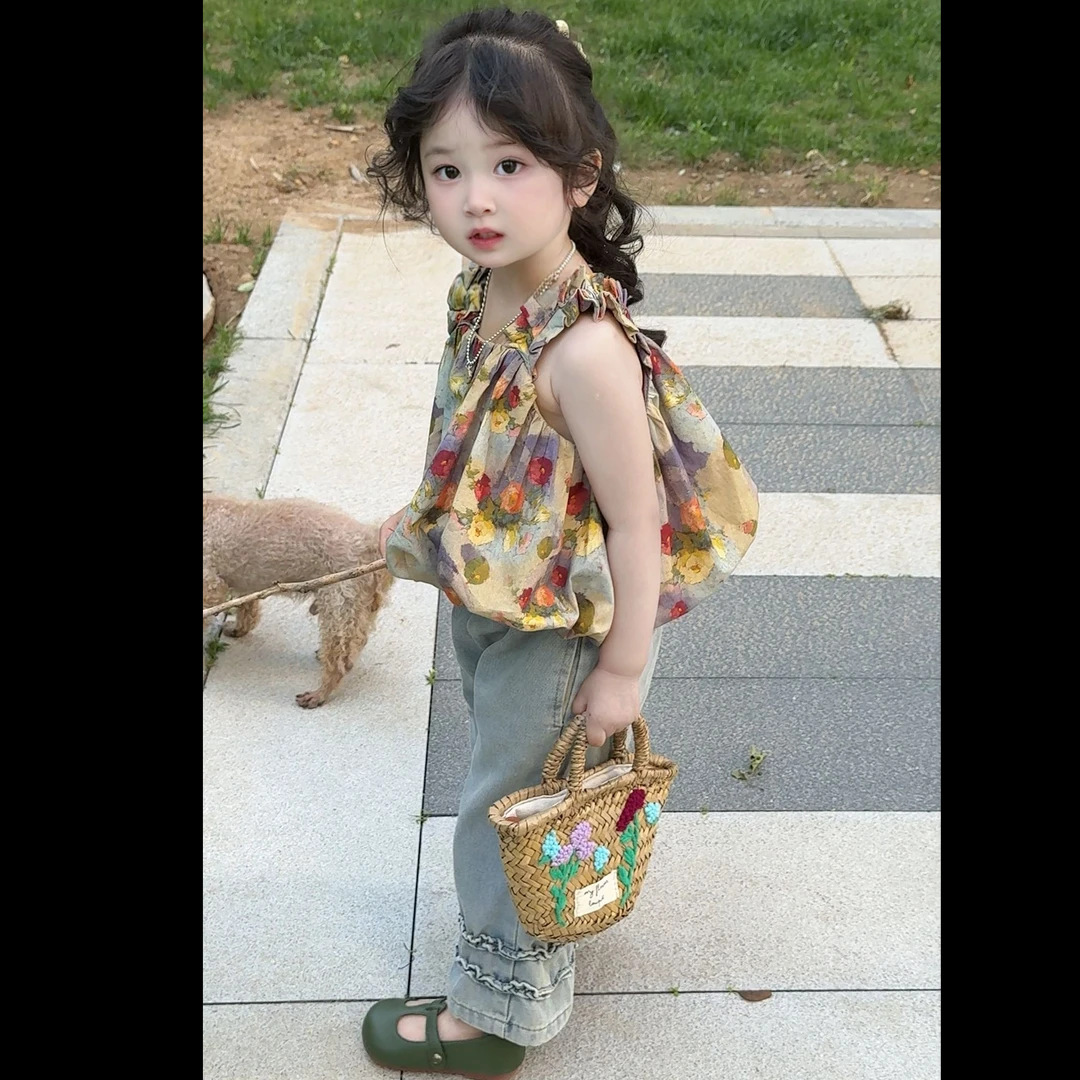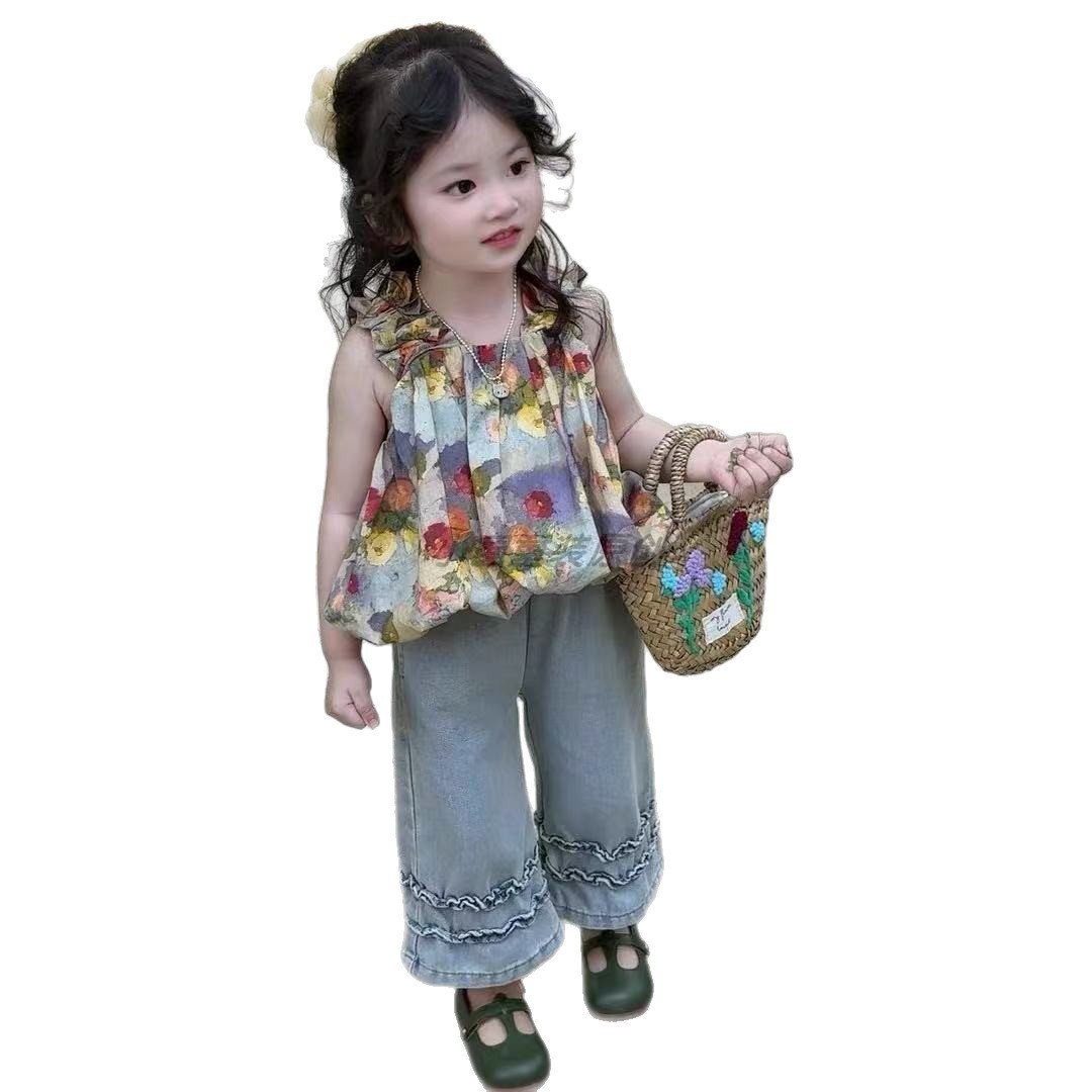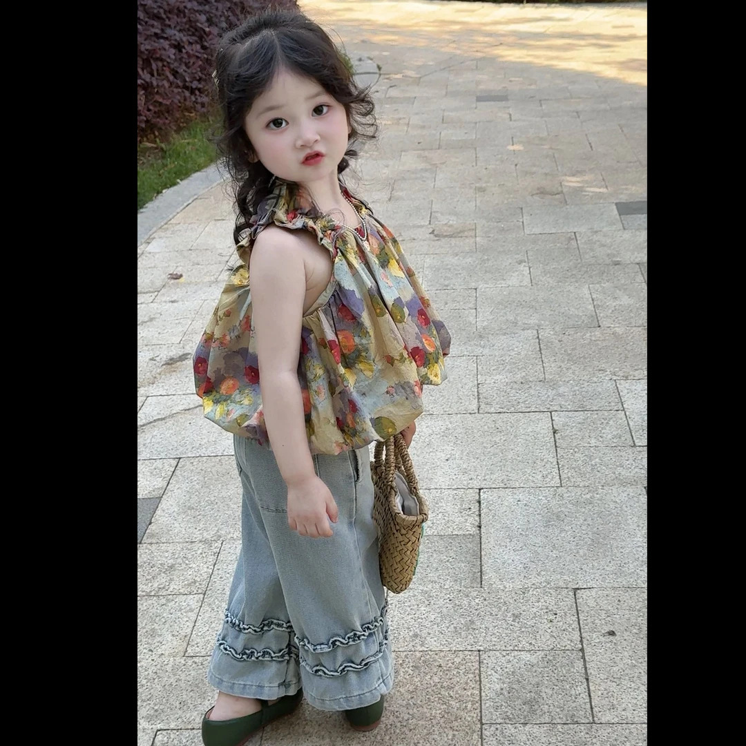 여아 정장 한국 스타일 꽃무늬 꽃봉오리 캐미솔 여아 다용도 레이스 스트레이트 청바지 500381스토어 가기