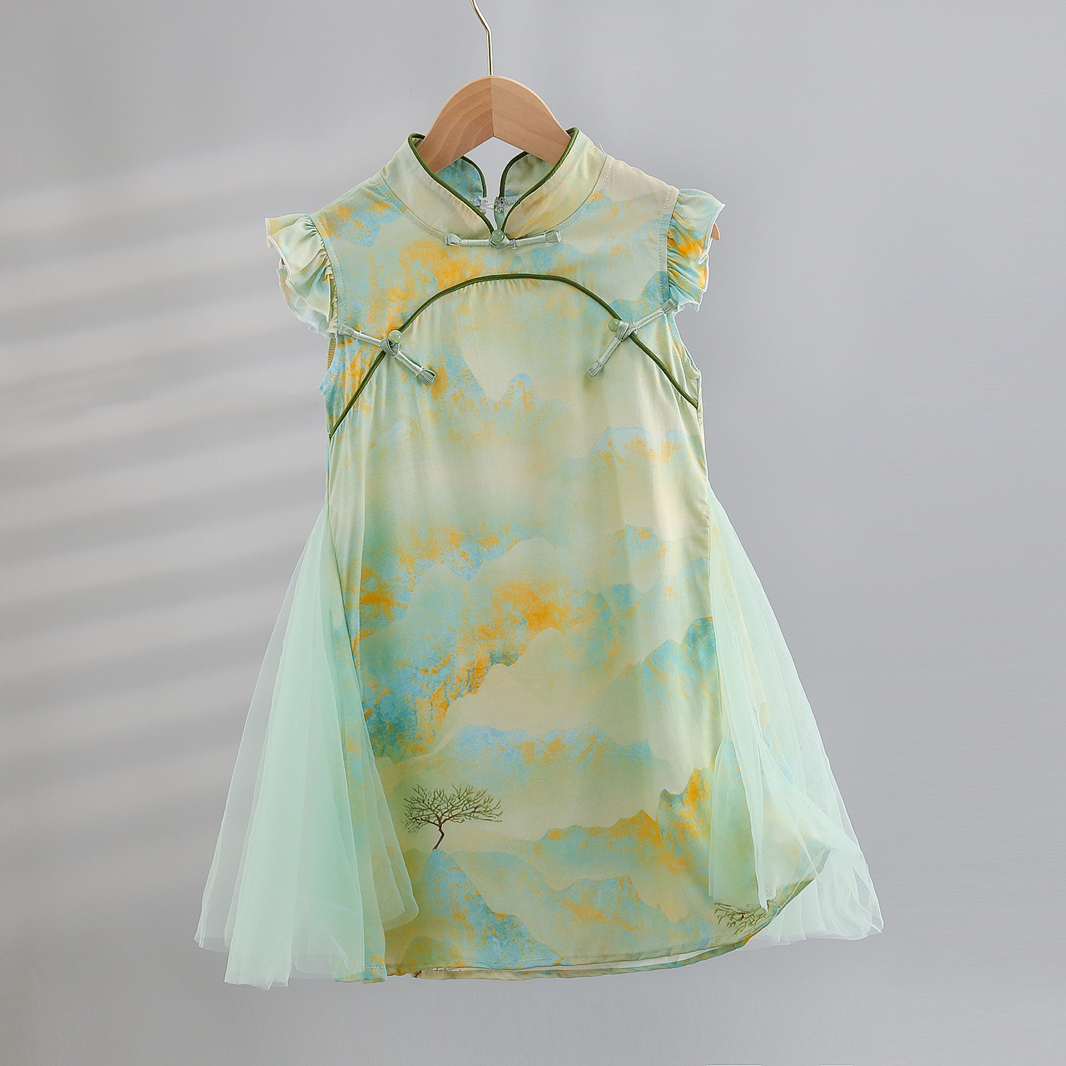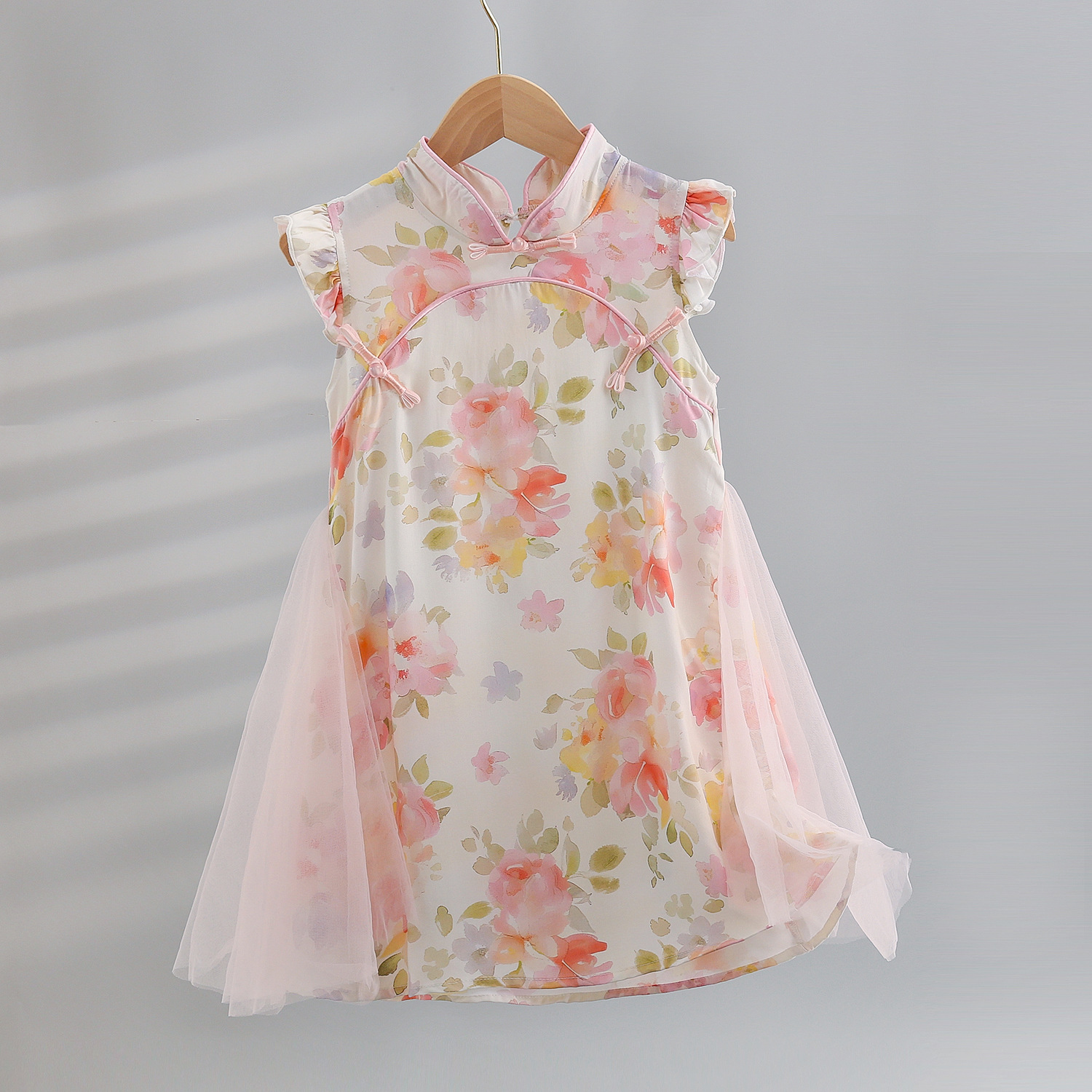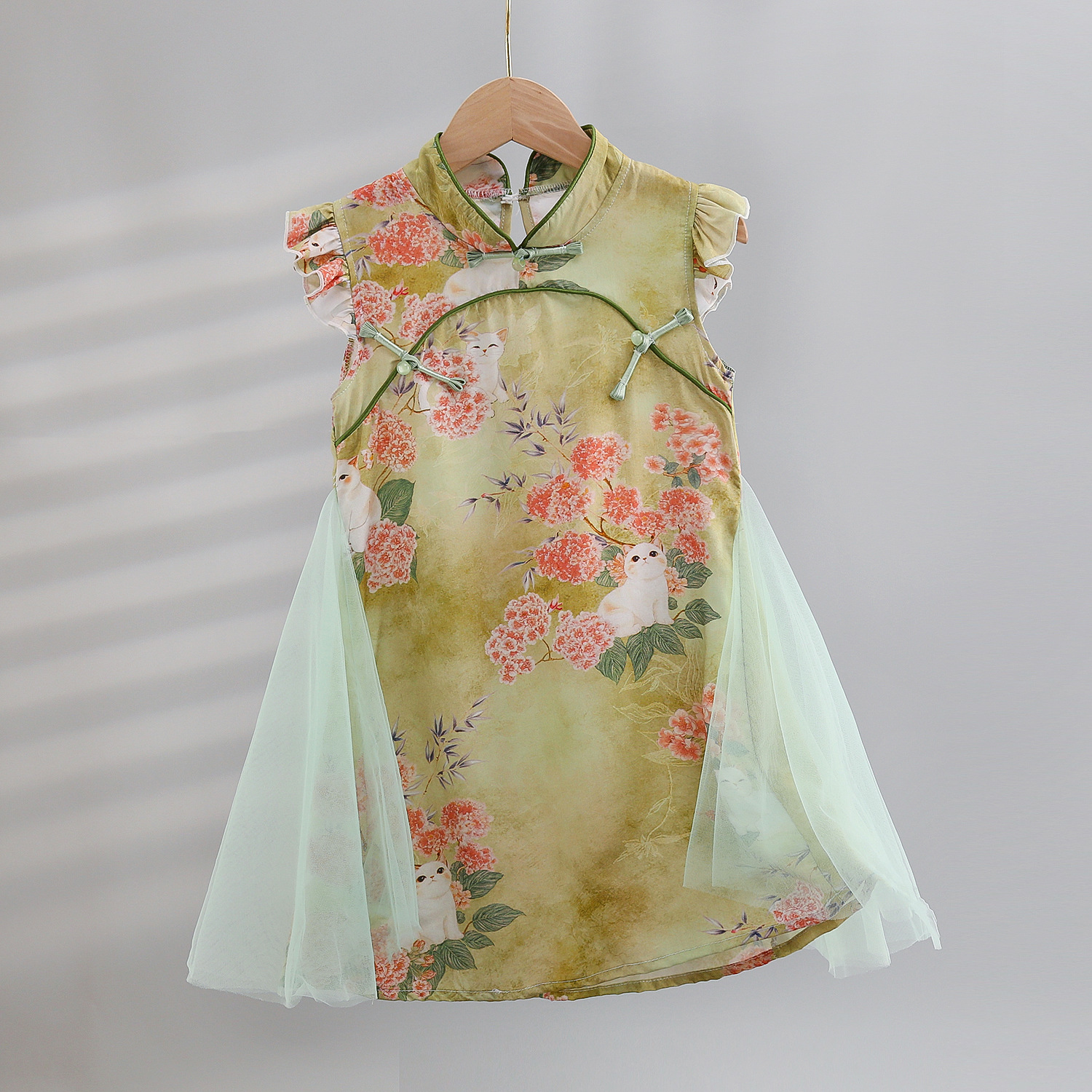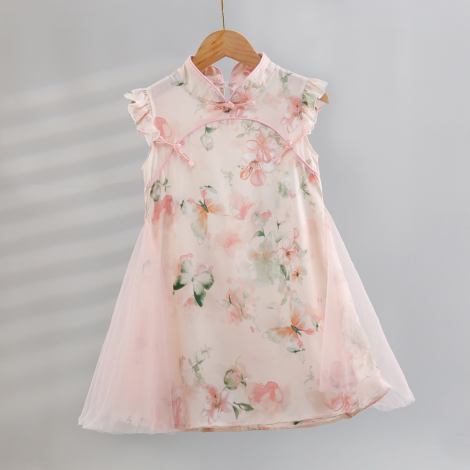 여름 소녀 면화 실크 드레스 얇은 어린이 인공 면화 메쉬 공주 드레스 어린 소녀 중국 스타일 치파오 Hanfu