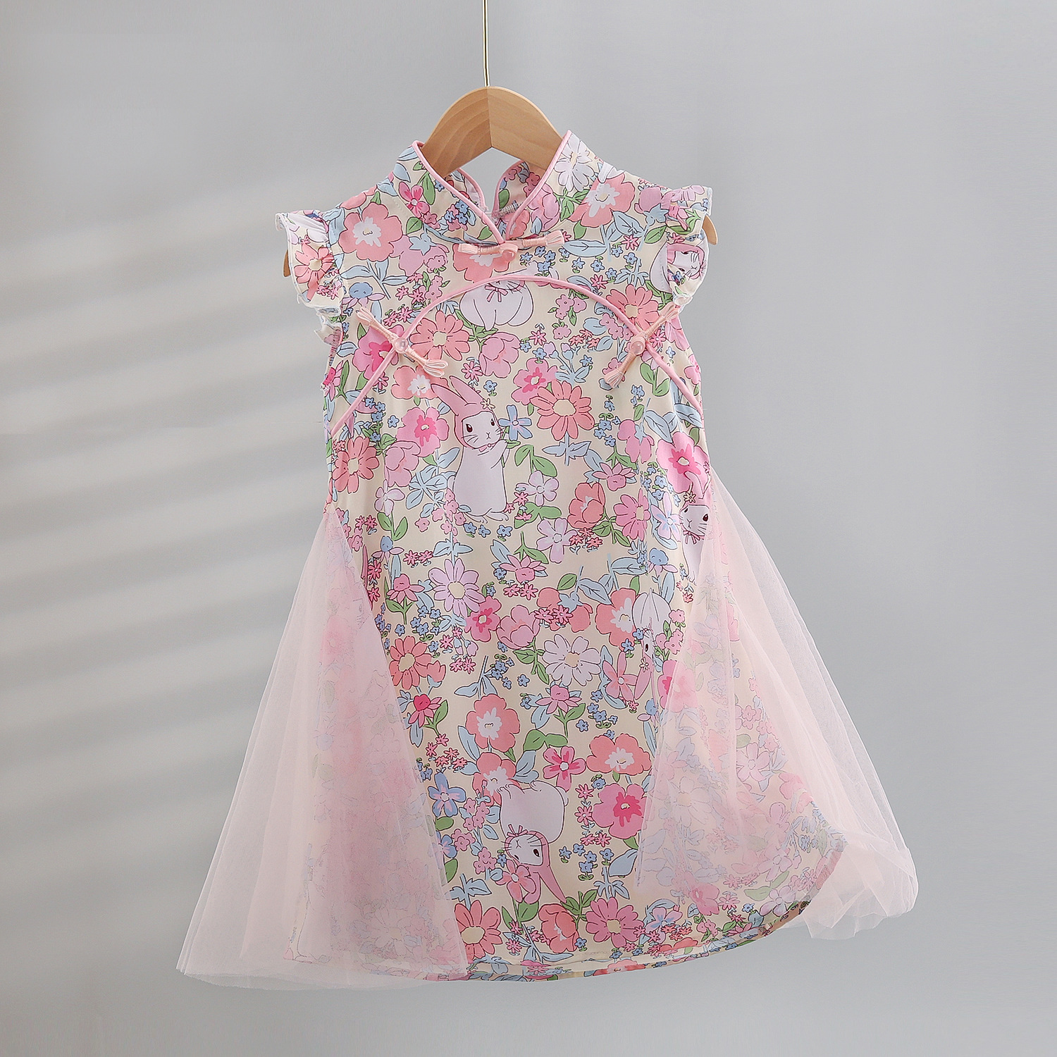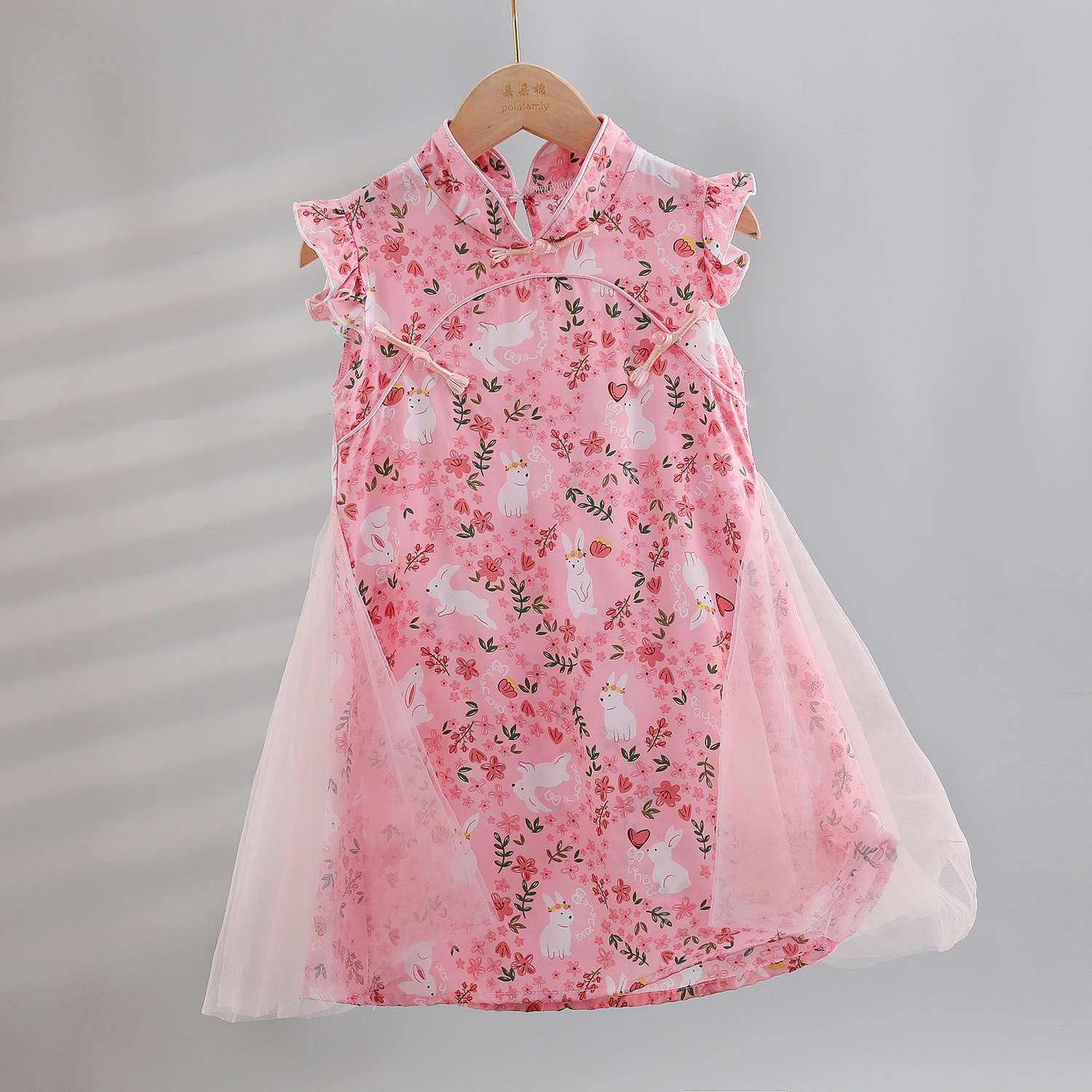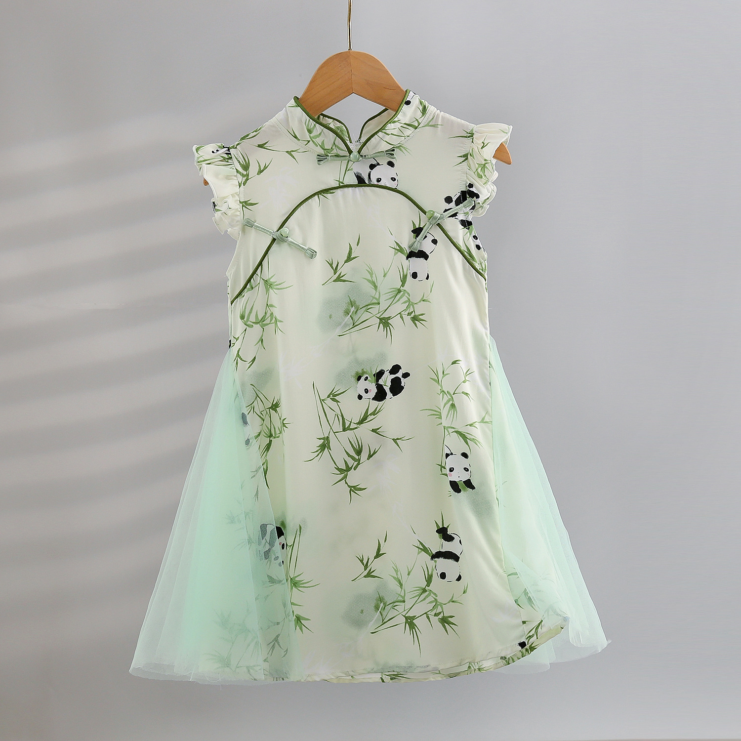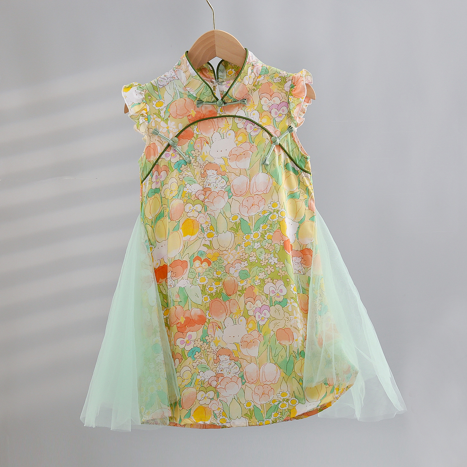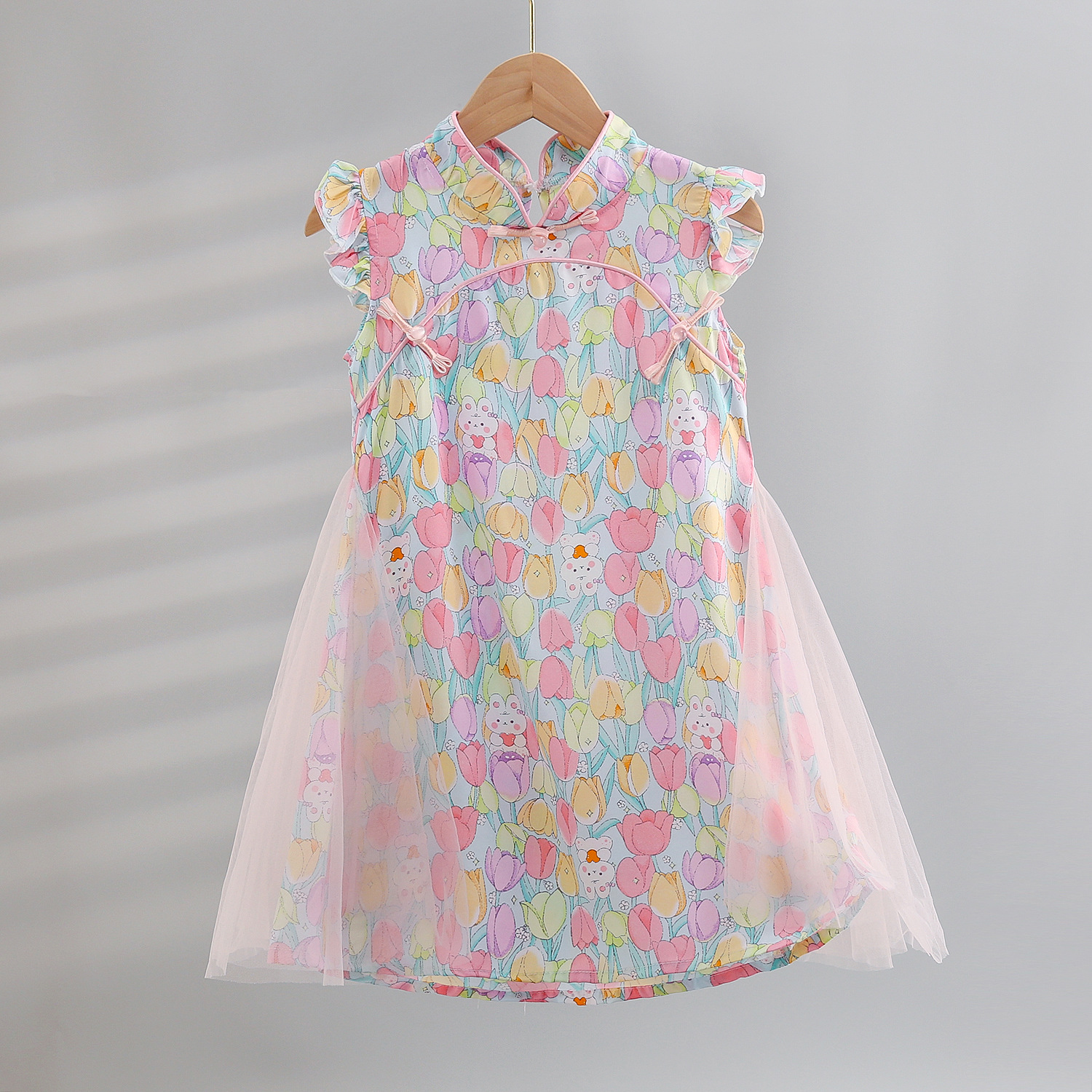 여름 소녀 면화 실크 드레스 얇은 어린이 인공 면화 메쉬 공주 드레스 어린 소녀 중국 스타일 치파오 Hanfu