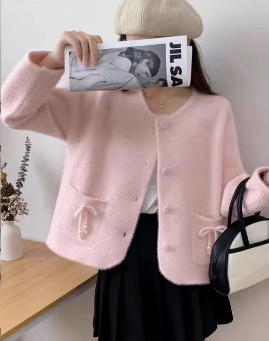 Xiaoxiangfeng 라운드 넥 카디건 모조 밍크 벨벳 자켓 여성 2025 가을, 겨울 새로운 스타일 하이 엔드 연령 감소 스위트 탑