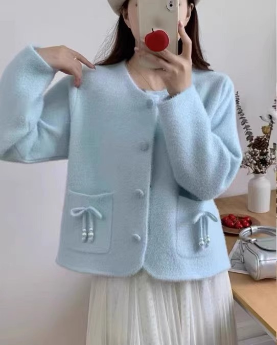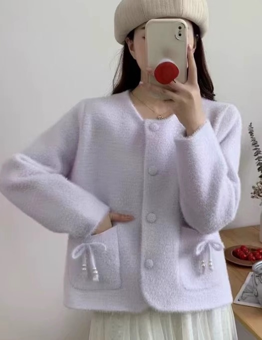 Xiaoxiangfeng 라운드 넥 카디건 모조 밍크 벨벳 자켓 여성 2025 가을, 겨울 새로운 스타일 하이 엔드 연령 감소 스위트 탑스토어 가기