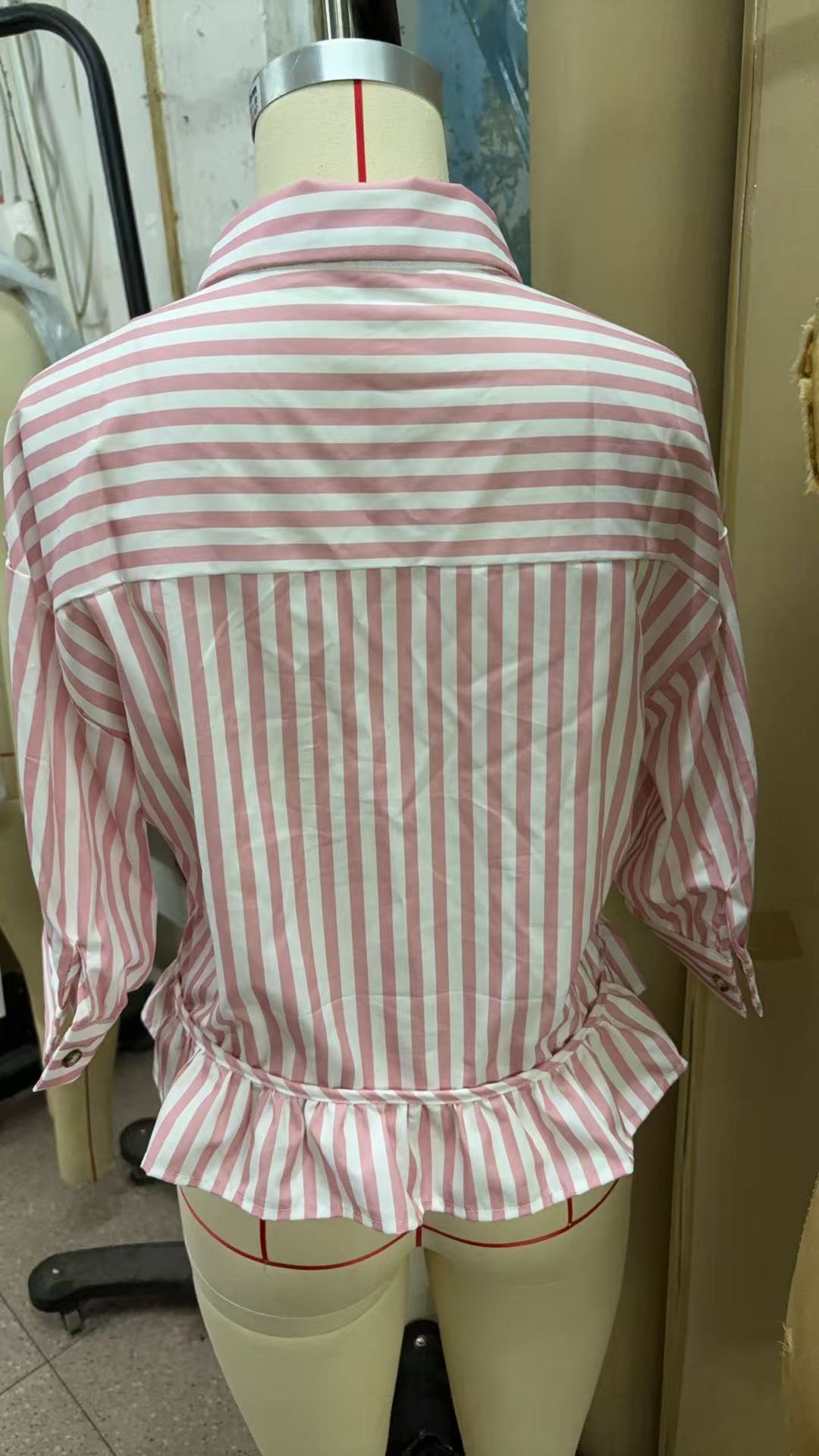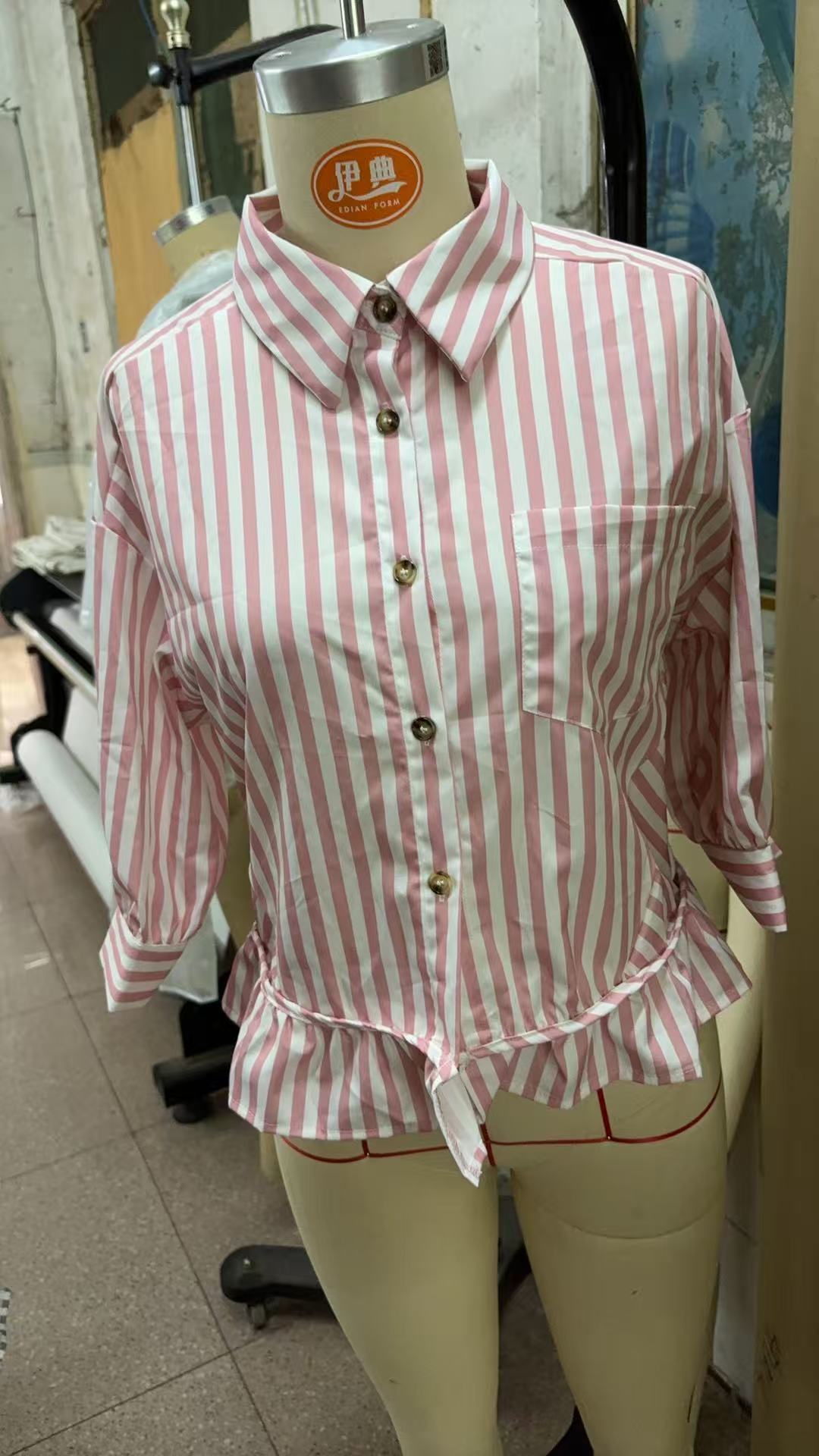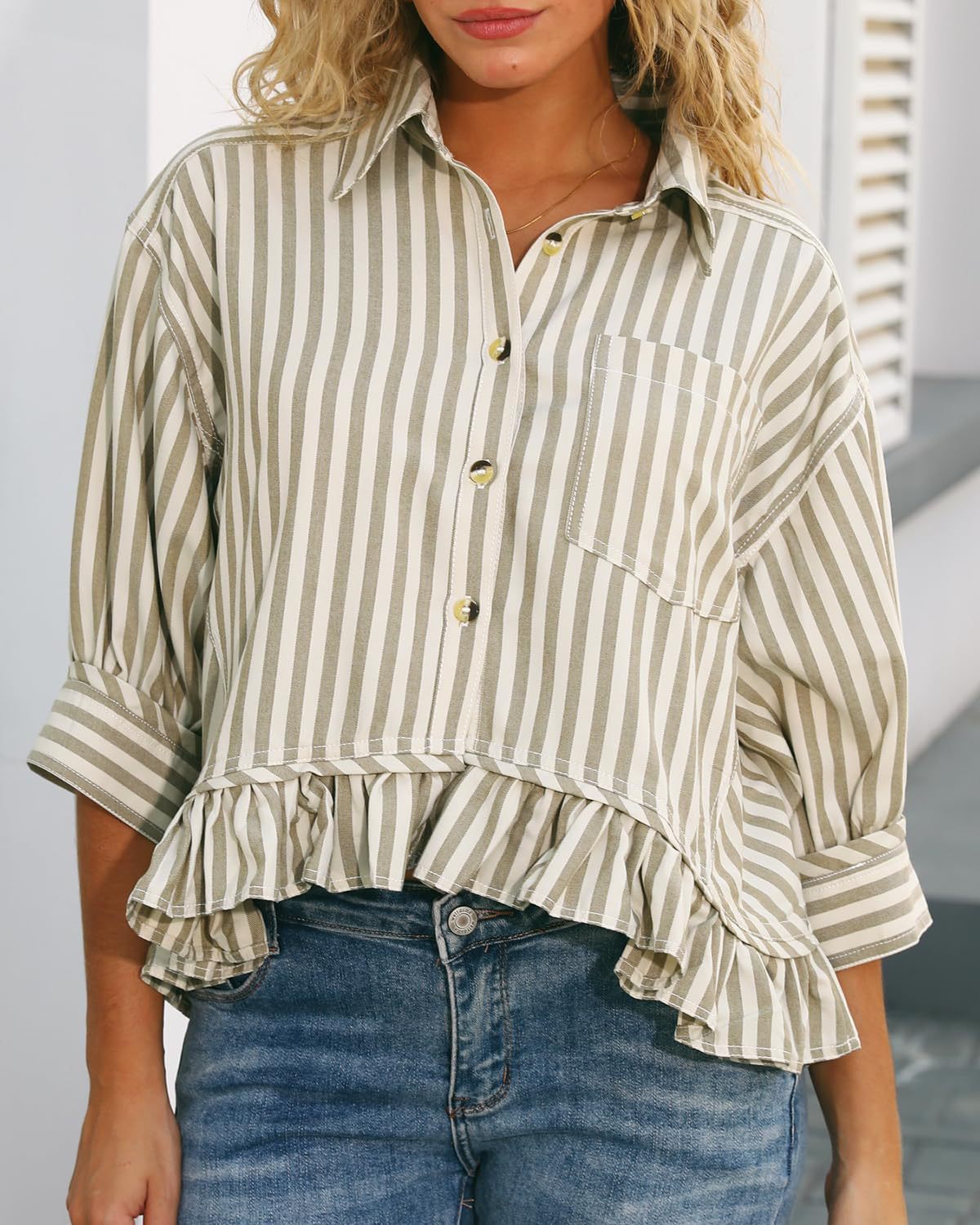 유럽과 미국의 국경 간 대외 무역 아마존 여성 패션 통근 스트라이프 레이스 밑단 루즈 셔츠 5부 소매 셔츠