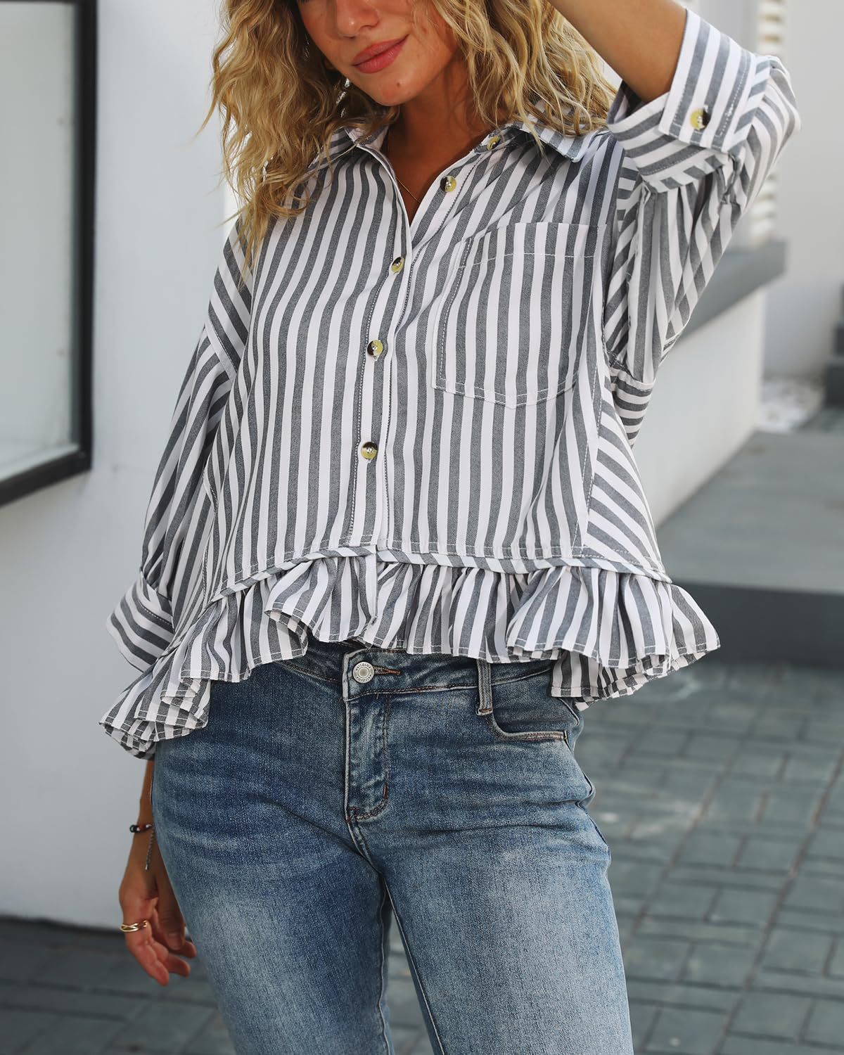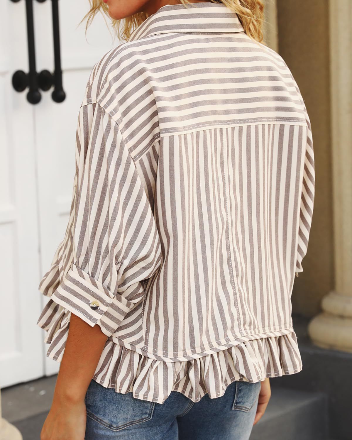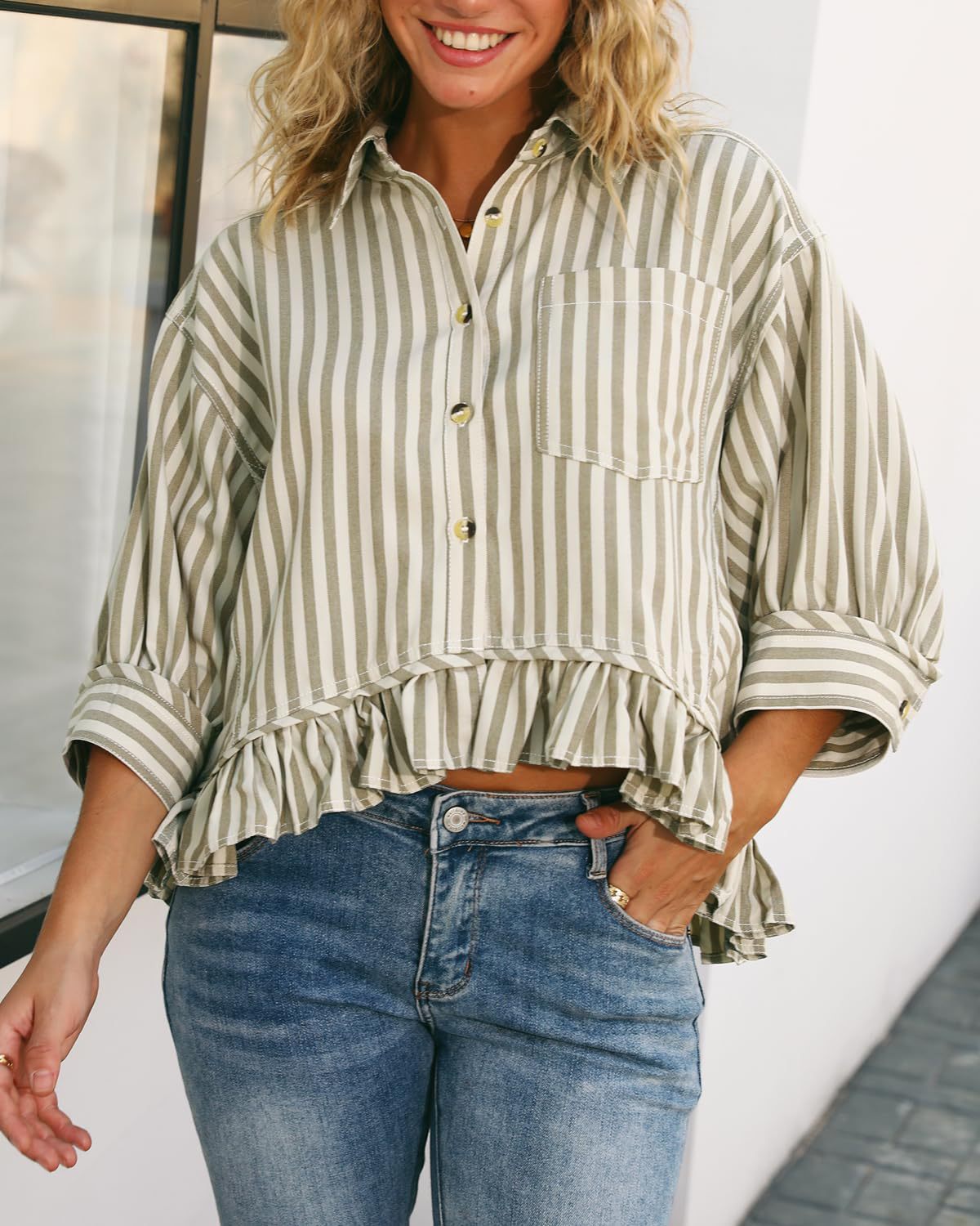 유럽과 미국의 국경 간 대외 무역 아마존 여성 패션 통근 스트라이프 레이스 밑단 루즈 셔츠 5부 소매 셔츠