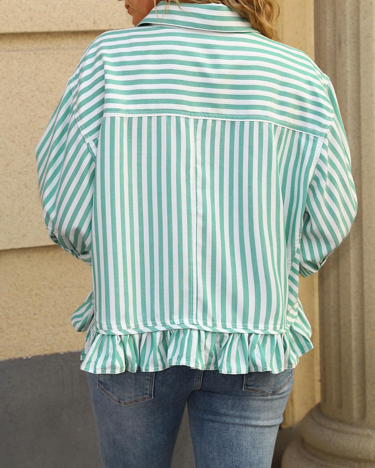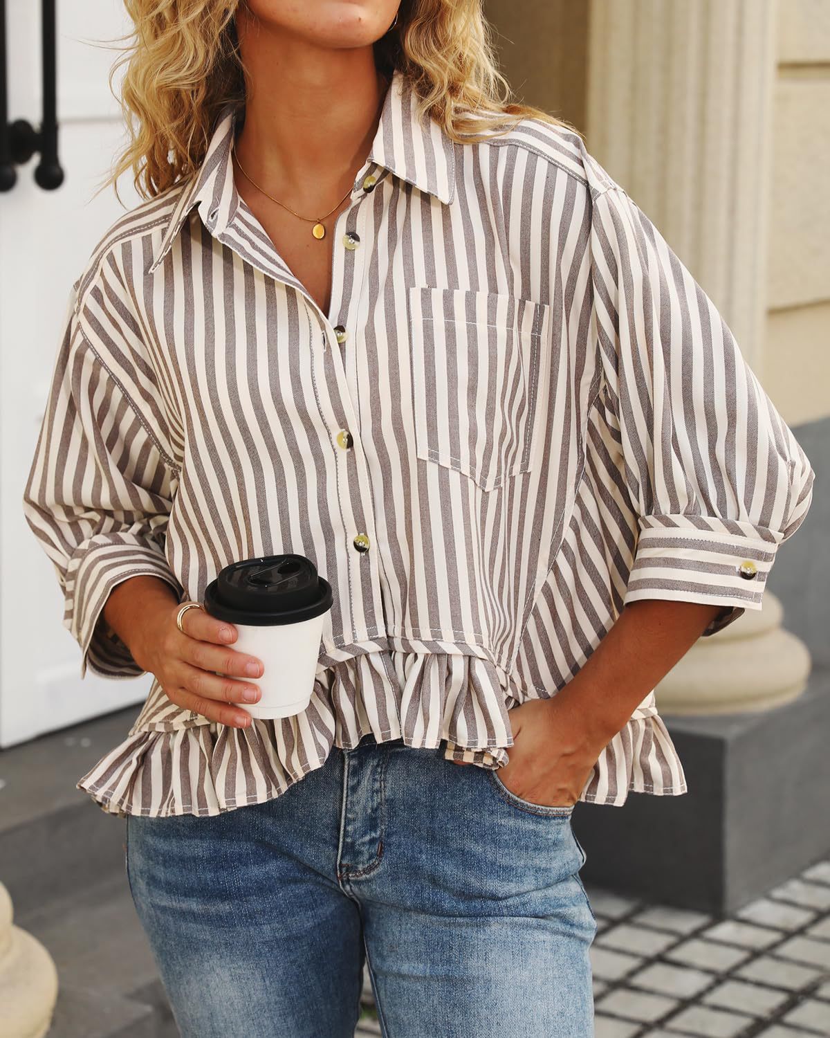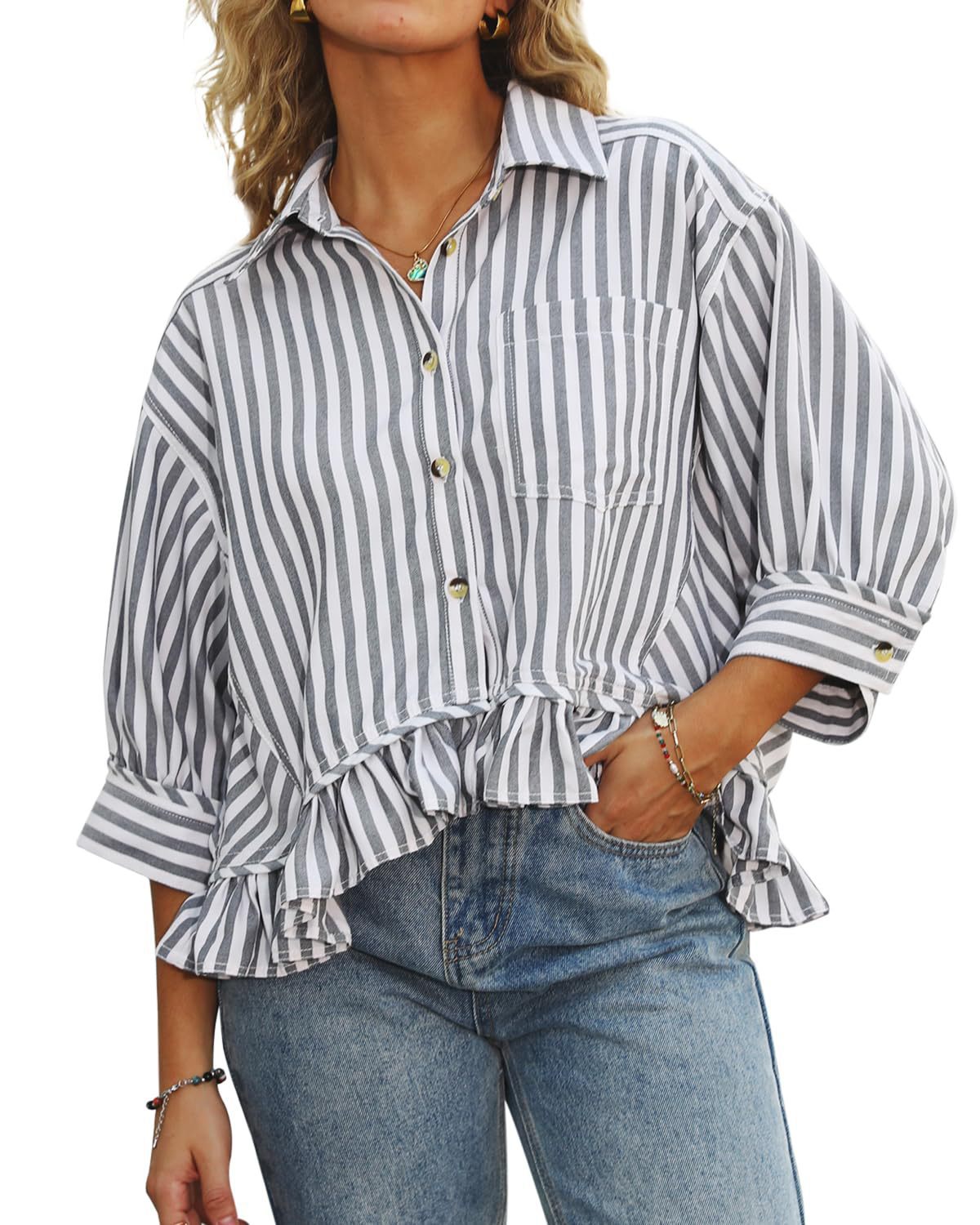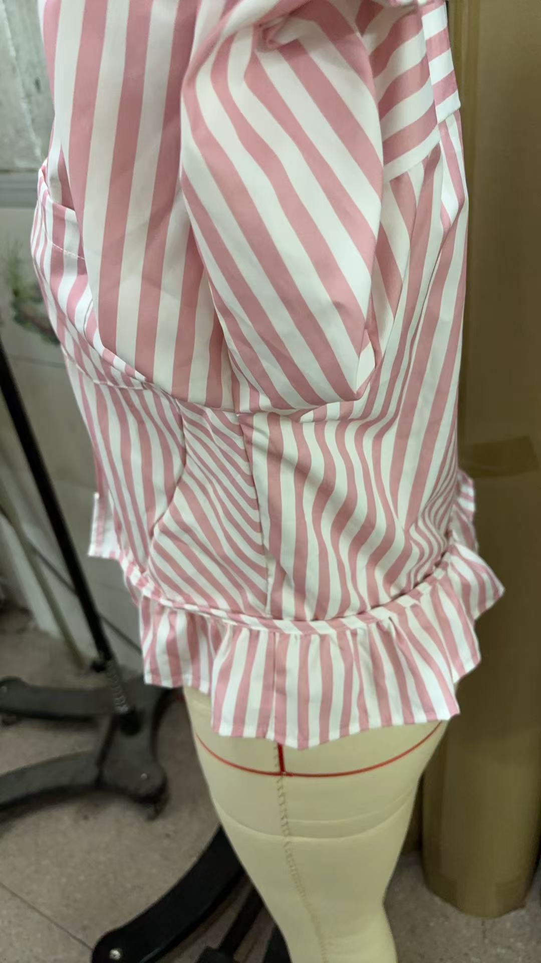 유럽과 미국의 국경 간 대외 무역 아마존 여성 패션 통근 스트라이프 레이스 밑단 루즈 셔츠 5부 소매 셔츠스토어 가기