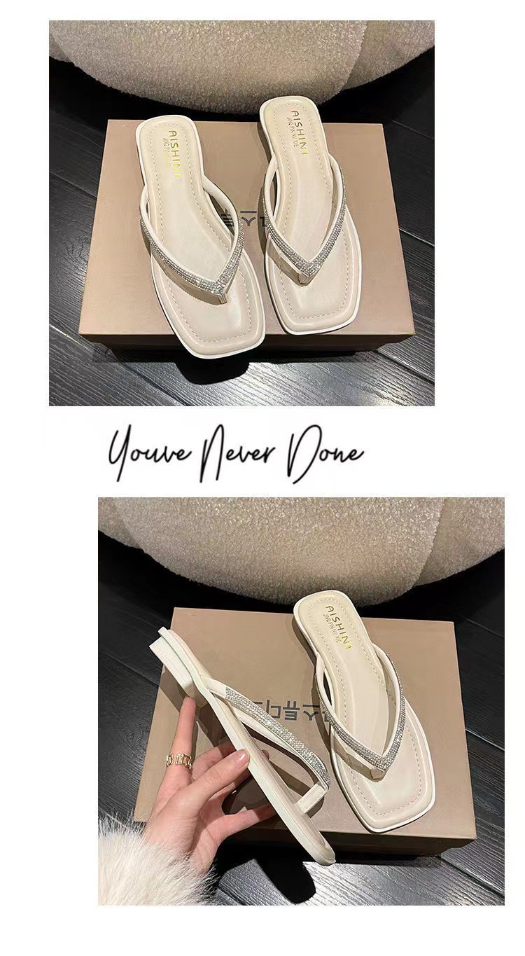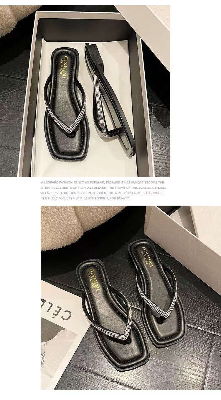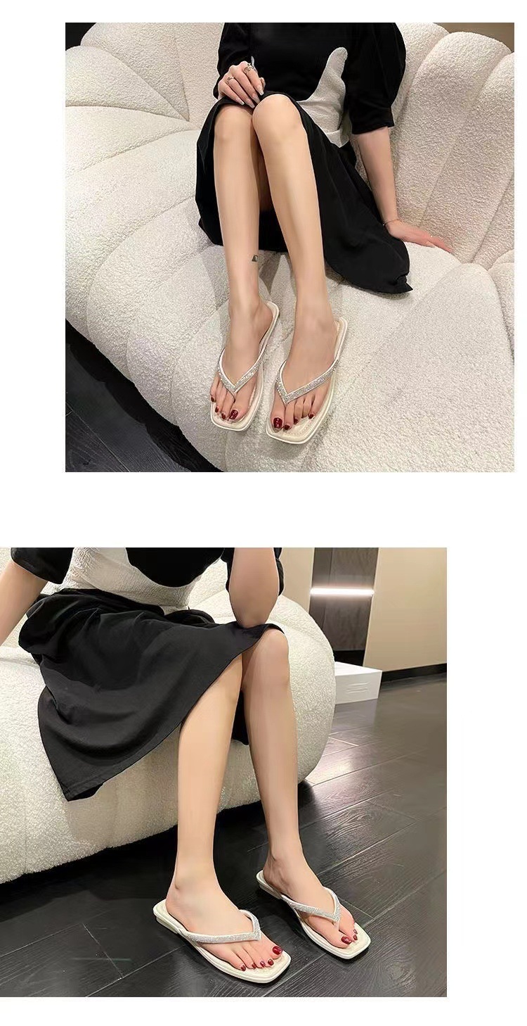 여성용 여름 아우터 슬리퍼 2025 새로운 요정 스타일 인터넷 연예인 라인스톤 스퀘어 토 비치 두꺼운 굽 슬리퍼