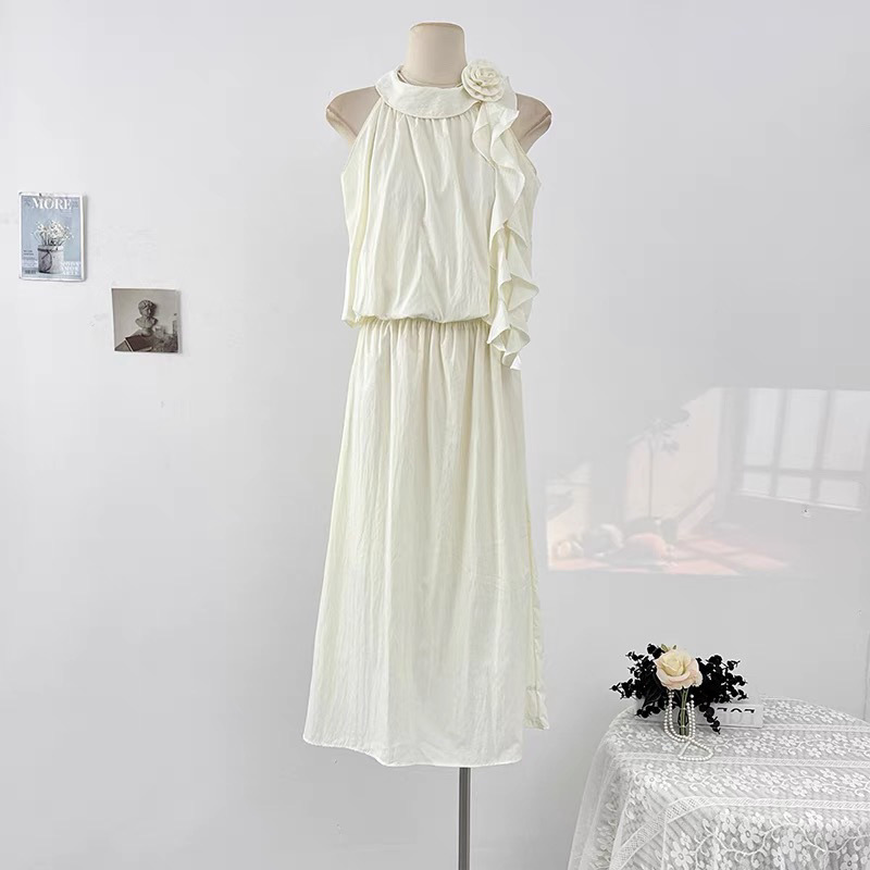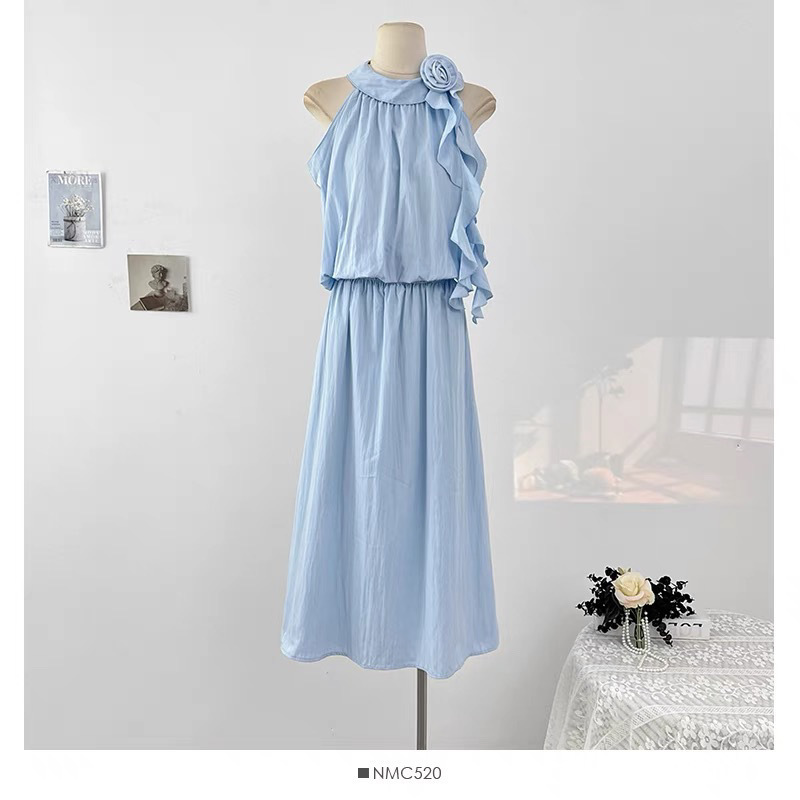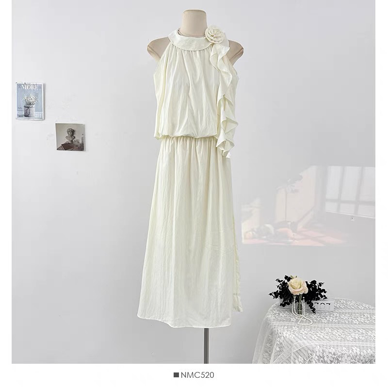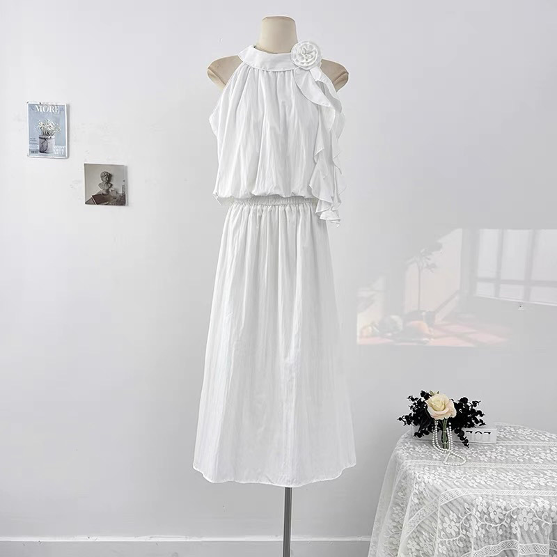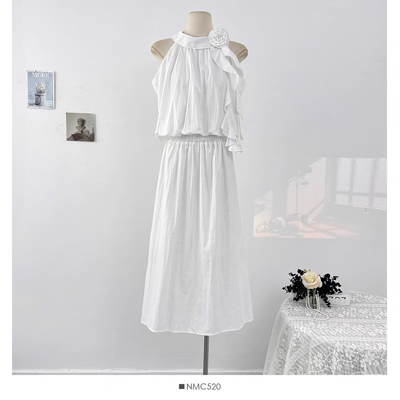 不规则立体花朵飘带挂脖露肩花苞衬衫女夏季高腰显瘦A字裙两件套