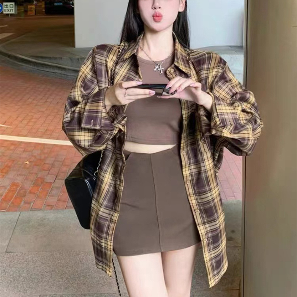 격자 무늬 셔츠 여성상의 봄과 여름 한국 스타일 느슨한 게으른 스타일 복고풍 긴팔 셔츠 카디건 재킷 도매스토어 가기