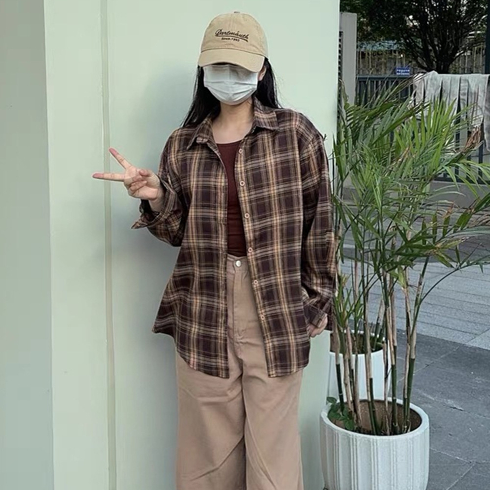 격자 무늬 셔츠 여성상의 봄과 여름 한국 스타일 느슨한 게으른 스타일 복고풍 긴팔 셔츠 카디건 재킷 도매