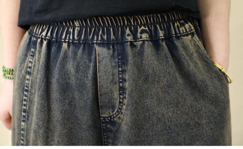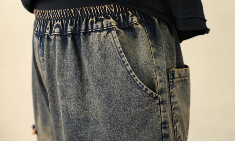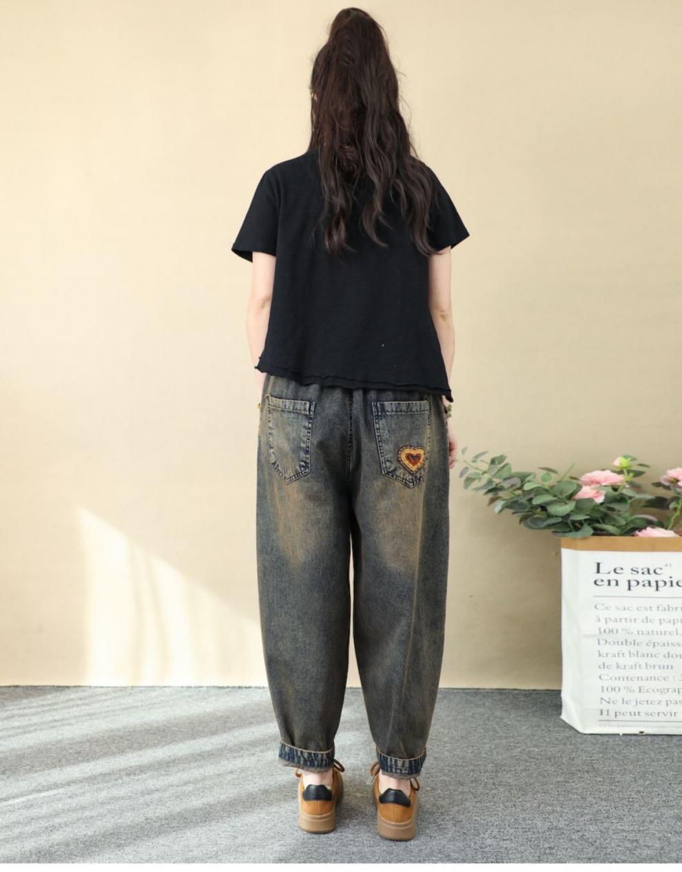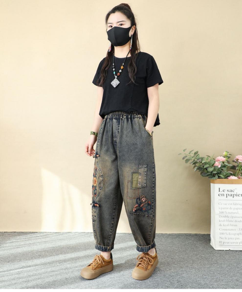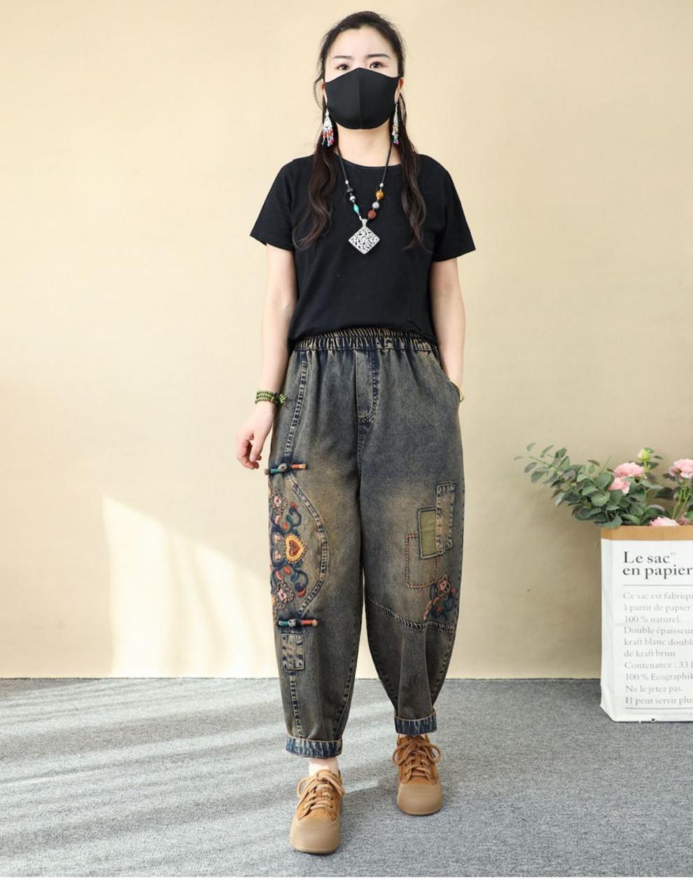 문학적 복고풍 컬러 버튼 자수 2025 봄 청바지 여성 루즈한 대형 자수 9부 하렘 팬츠