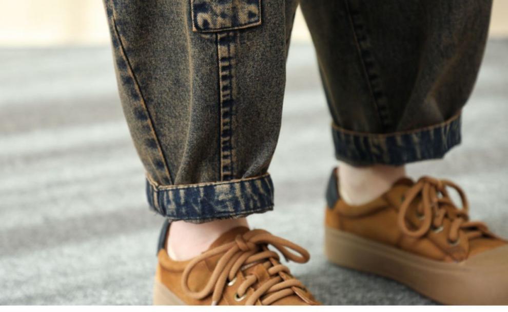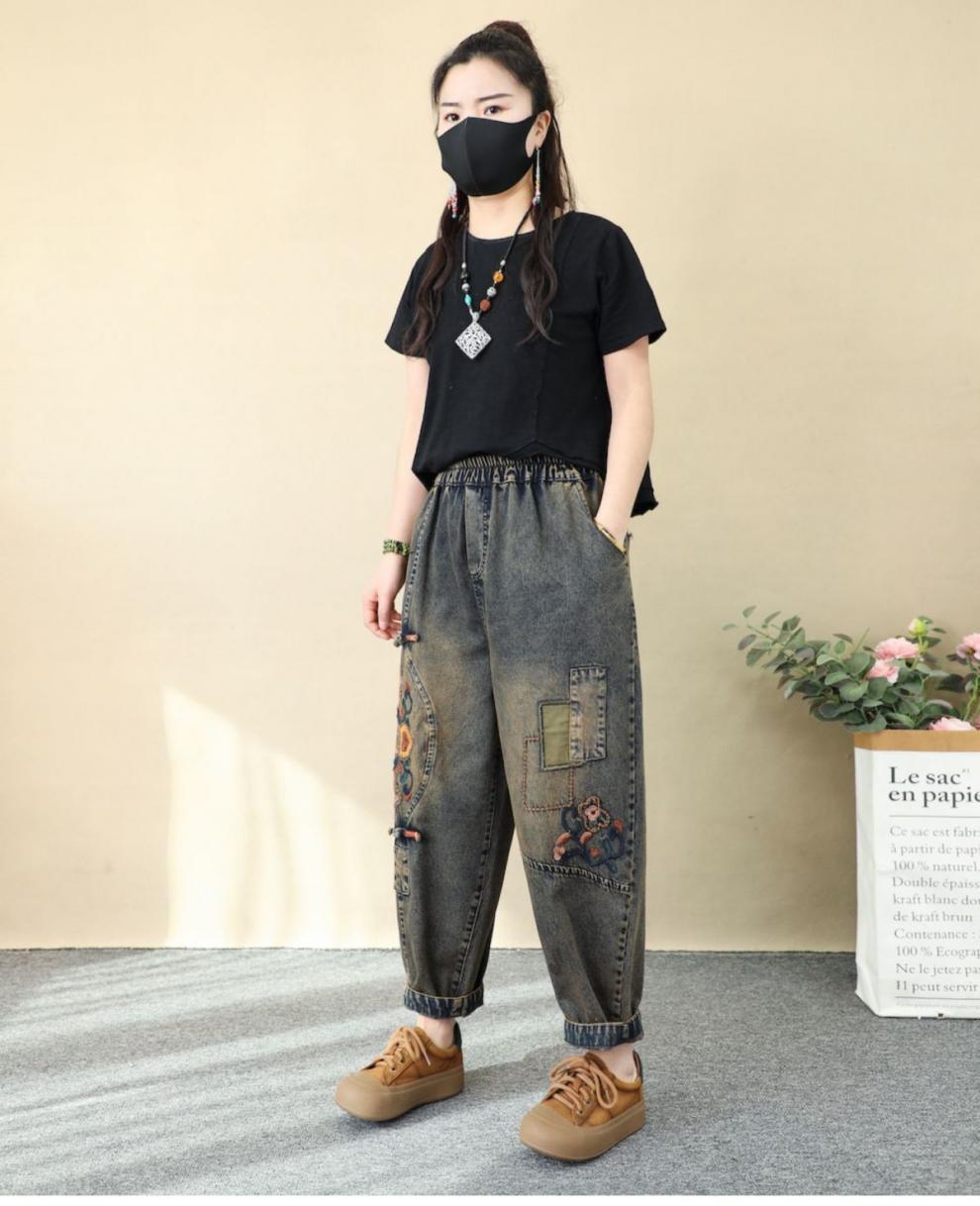 문학적 복고풍 컬러 버튼 자수 2025 봄 청바지 여성 루즈한 대형 자수 9부 하렘 팬츠스토어 가기