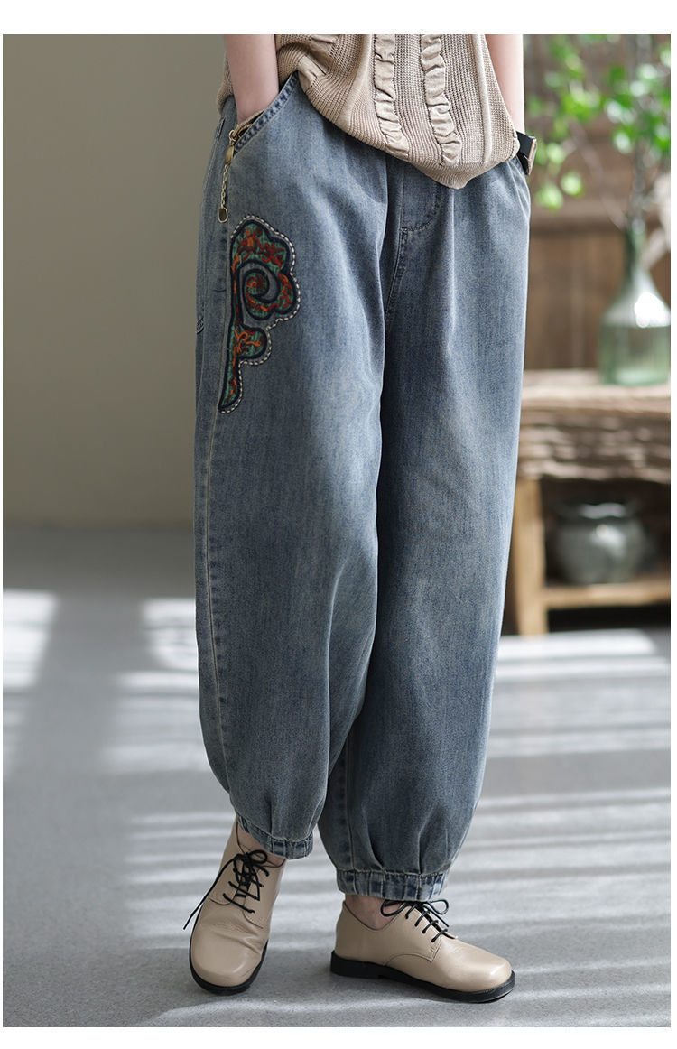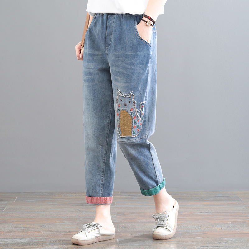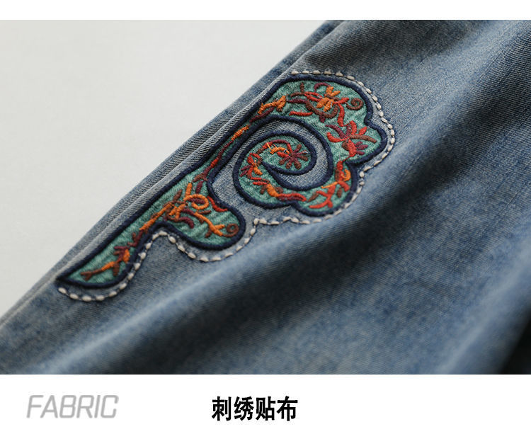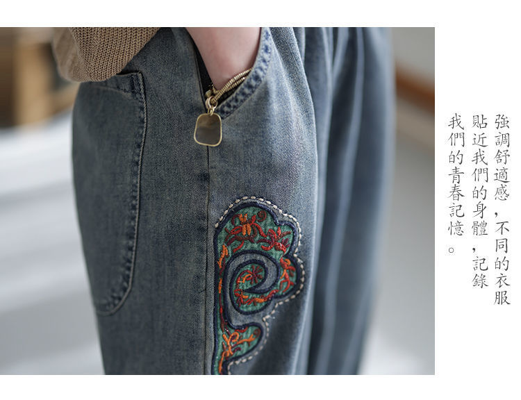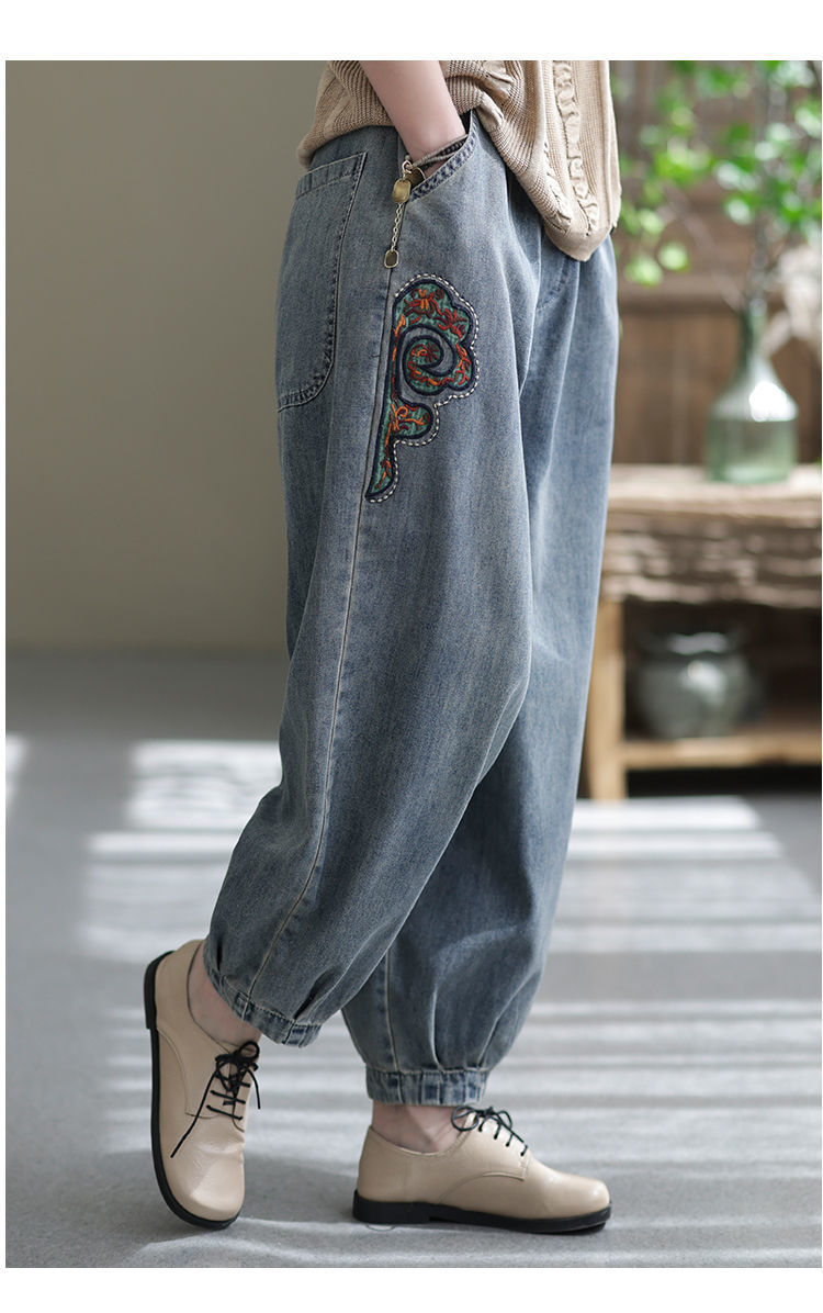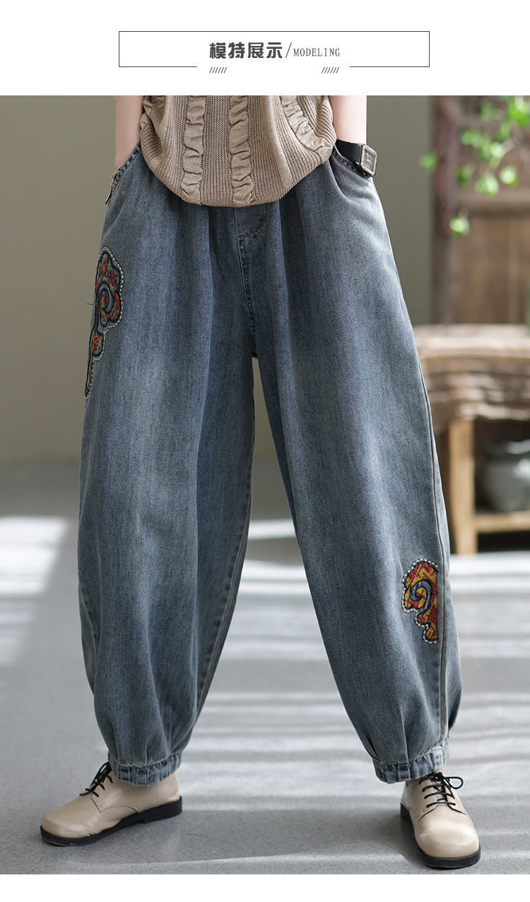 2022 청바지 여성 봄 스티치 자수 9 포인트 워시 와이드 레그 팬츠 캐주얼 레트로 루즈 여성 하렘 바지