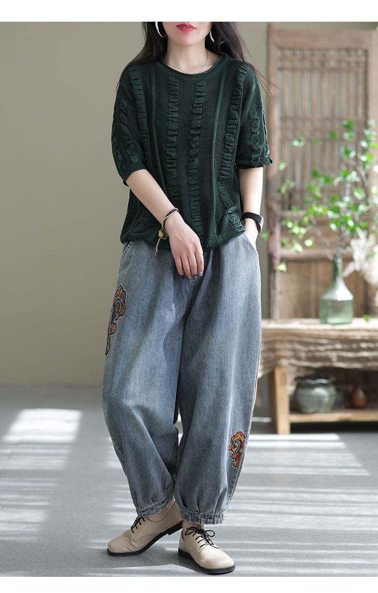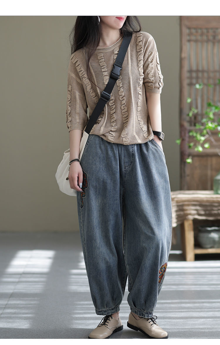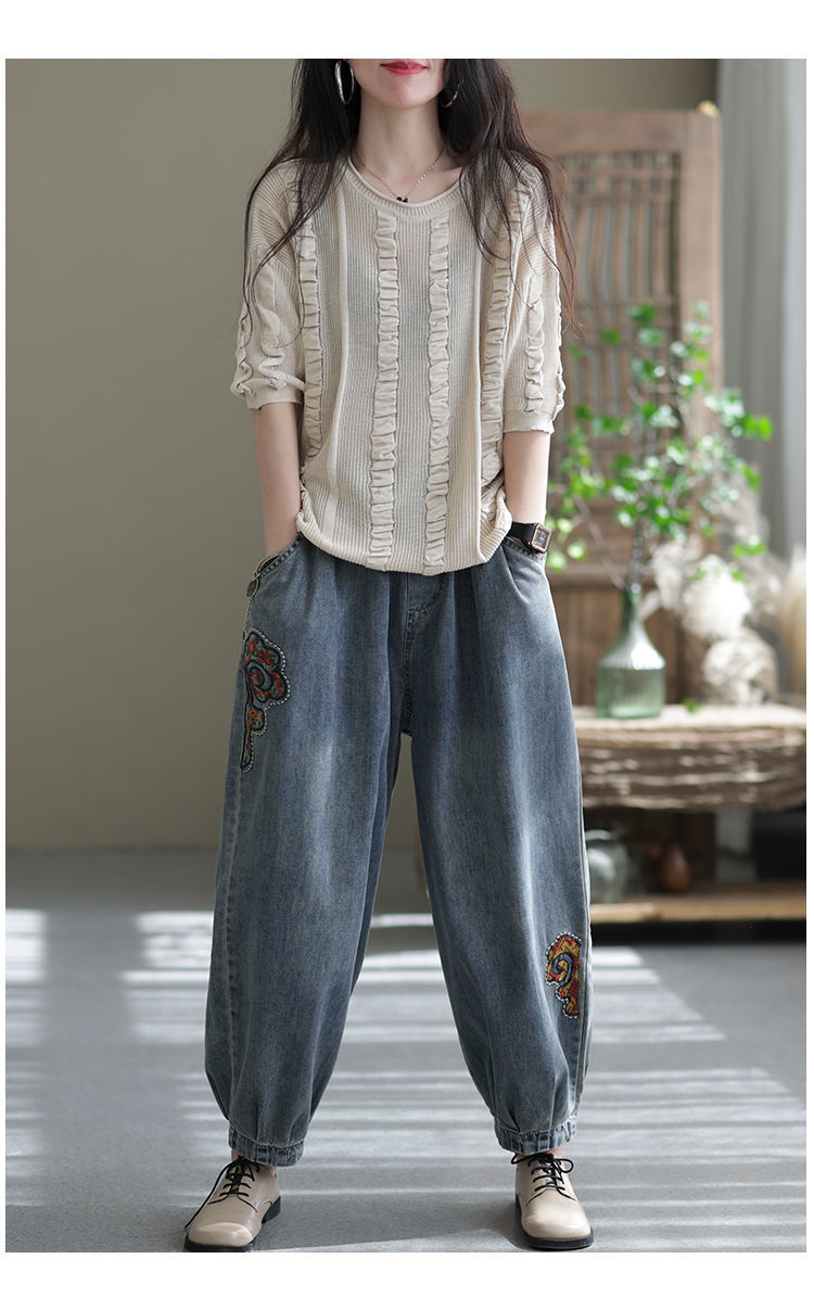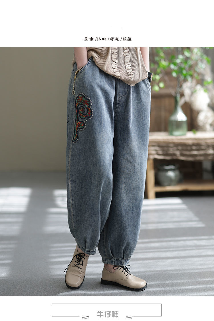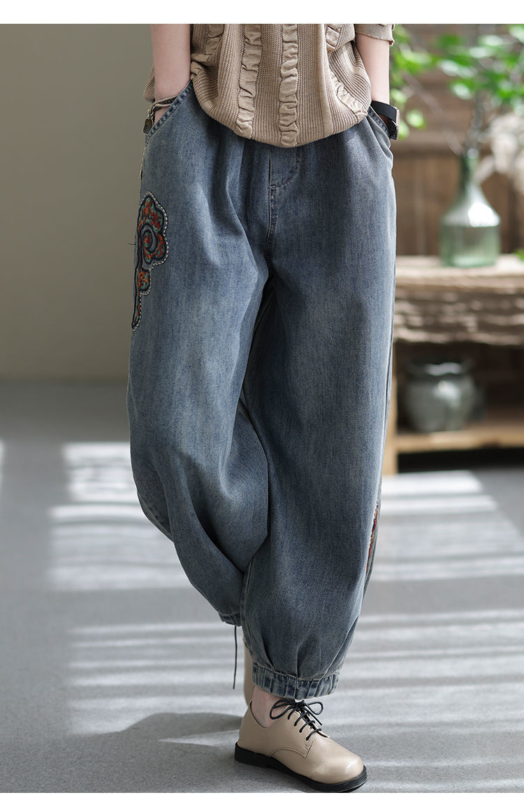 2022 청바지 여성 봄 스티치 자수 9 포인트 워시 와이드 레그 팬츠 캐주얼 레트로 루즈 여성 하렘 바지