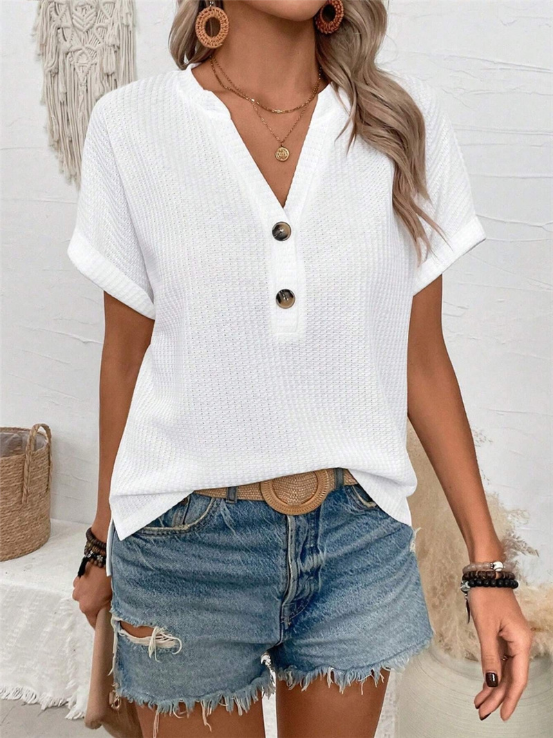 유럽과 미국의 국경 간 Amazon 2025 봄 여름 신제품 AliExpress 느슨한 V 넥 버튼 장식 캐주얼 여성 티셔츠스토어 가기