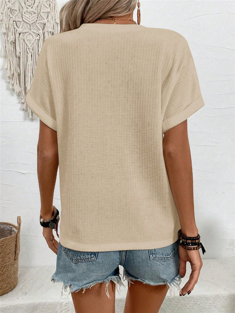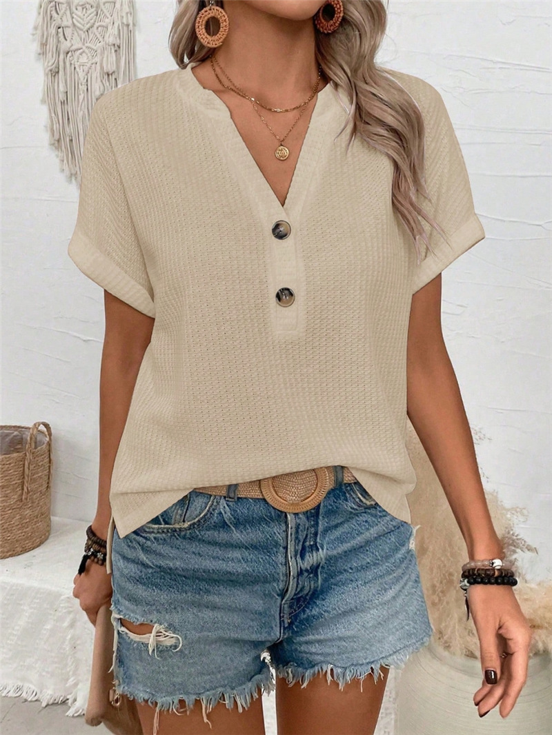 유럽과 미국의 국경 간 Amazon 2025 봄 여름 신제품 AliExpress 느슨한 V 넥 버튼 장식 캐주얼 여성 티셔츠