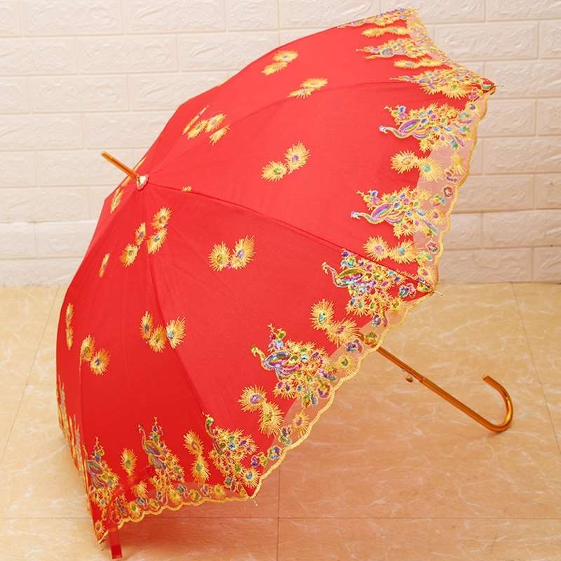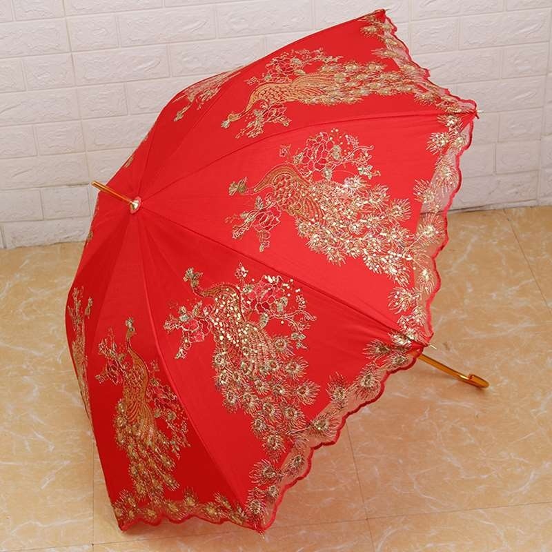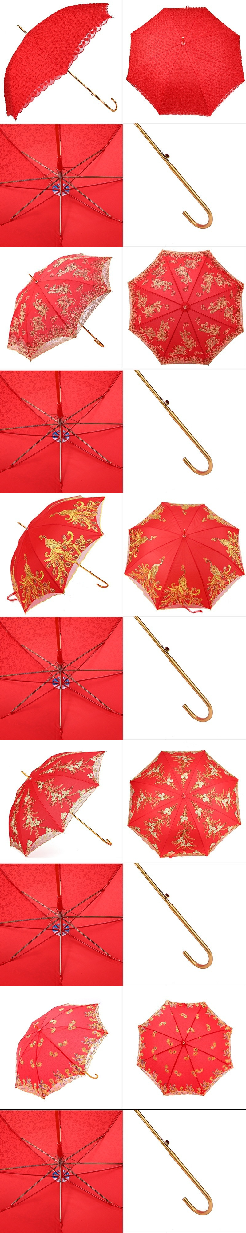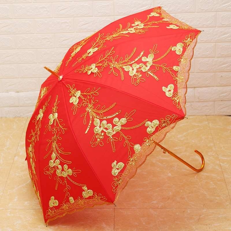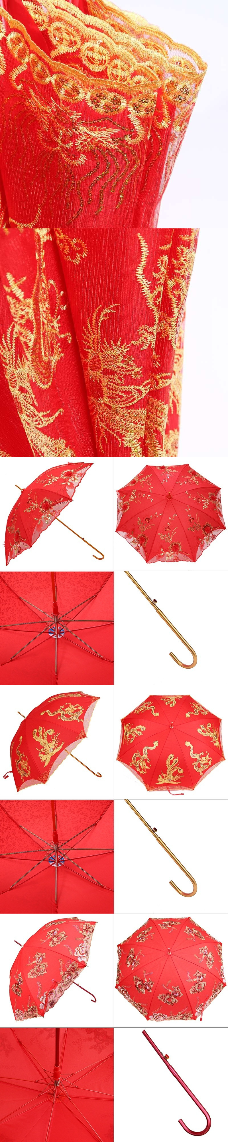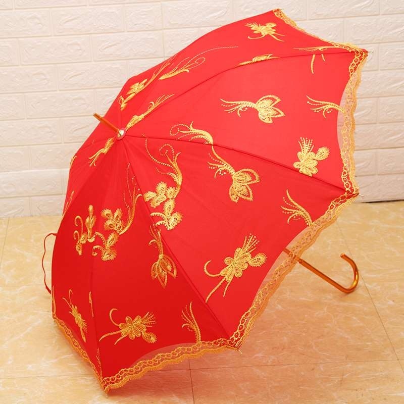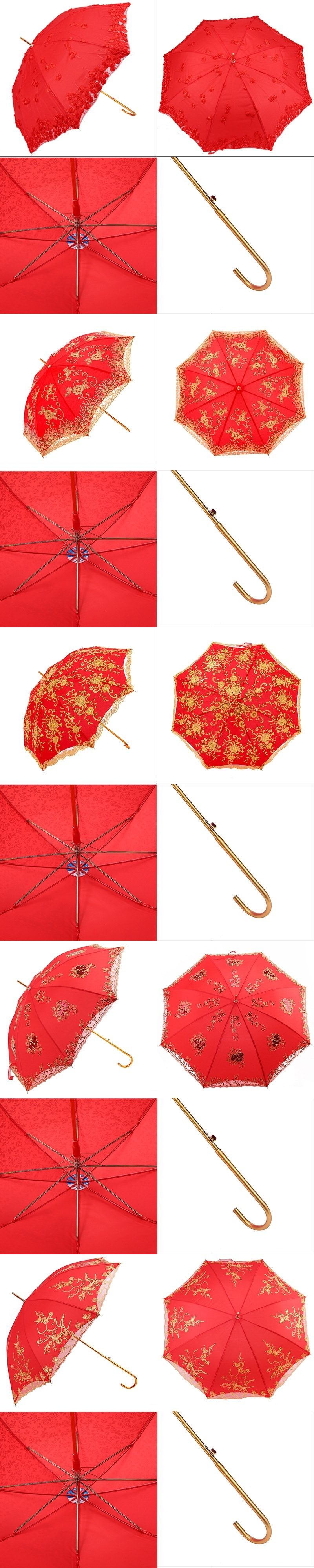 웨딩 용품 빨간 우산 매듭 중국 스타일 선물 레이스 긴 손잡이 비 복고풍 결혼식 신부 빨간색 자수 가장자리 스트레이트 스틱스토어 가기