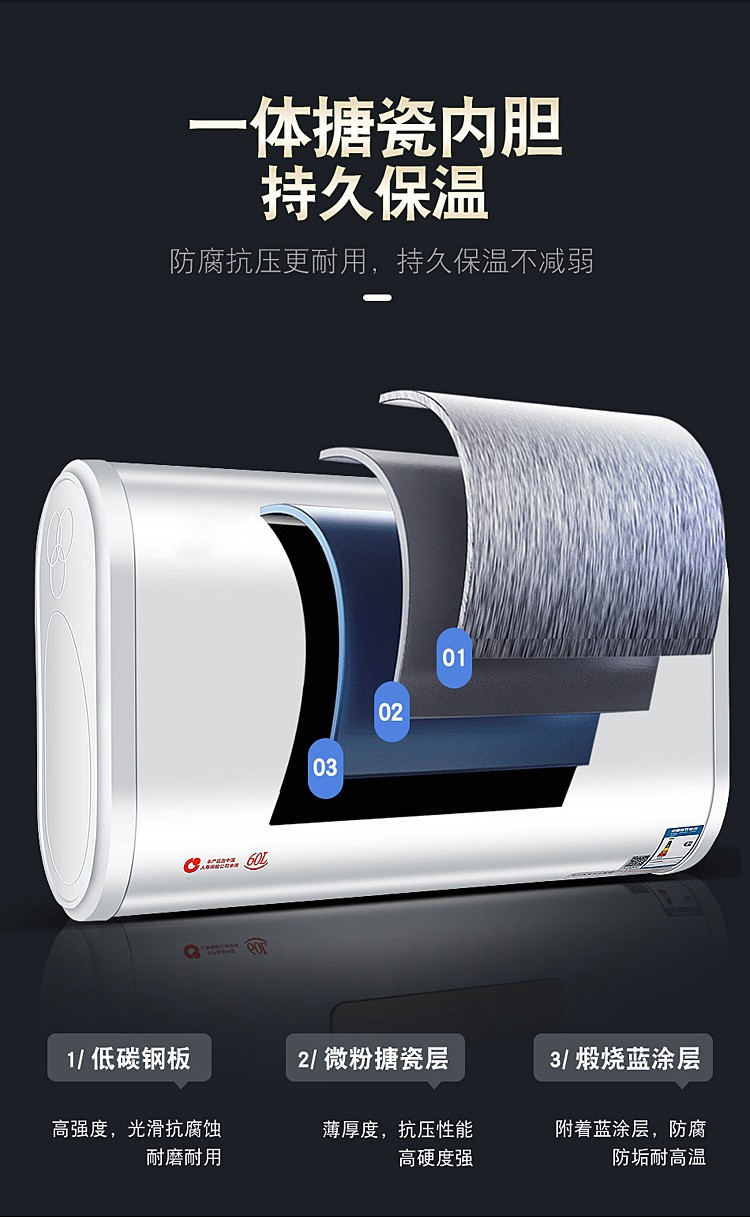 • 플랫 배럴 60리터 디지털 디스플레이 모델 + 높은 구성 + 물 배출구 및 전원 차단 기능, 정전 방지 벽 + 안전 배터리 수명을 직접 설치하세요.
