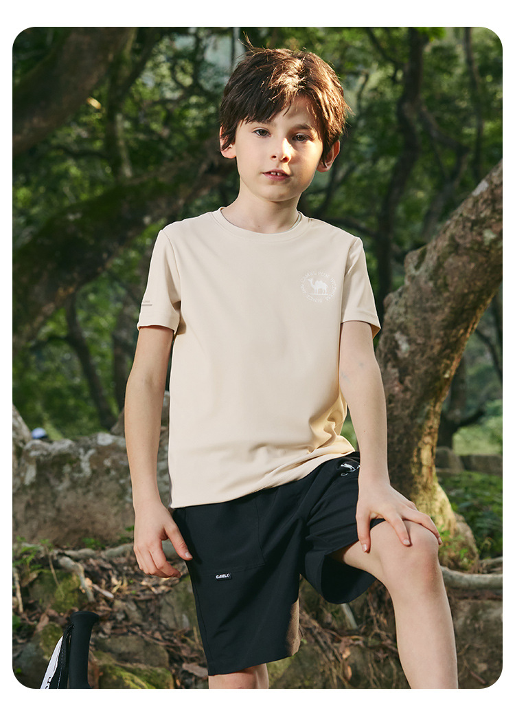 낙타 아동 의류 반팔 티셔츠 얇은 소녀 여름 2025 새로운 라운드 넥 중대형 아동 속건 의류 소년 아동상의