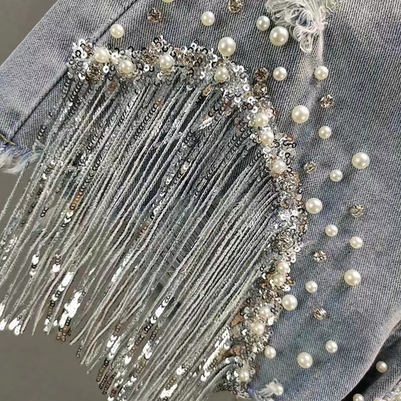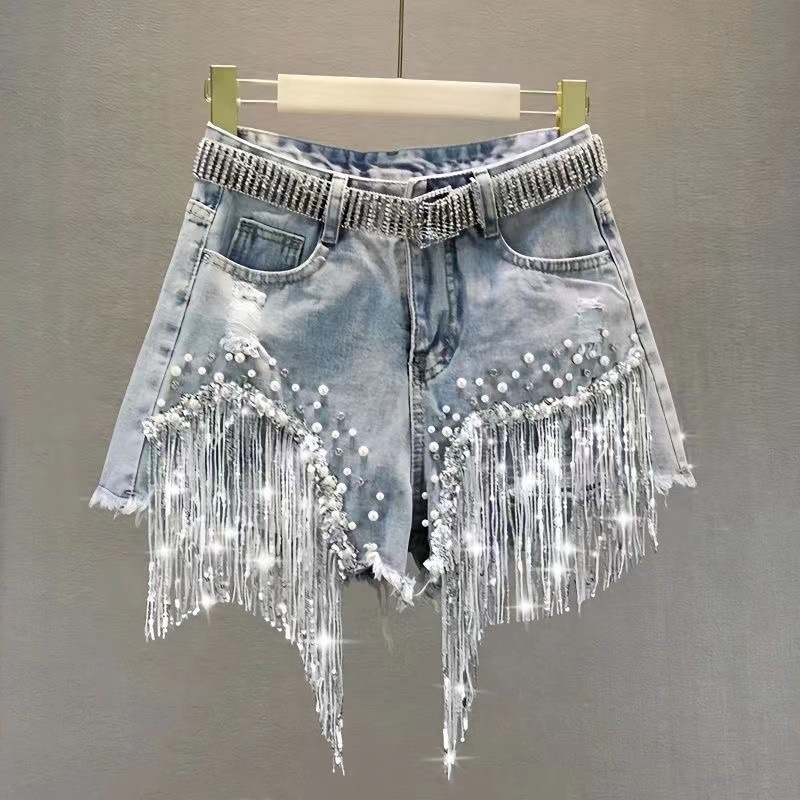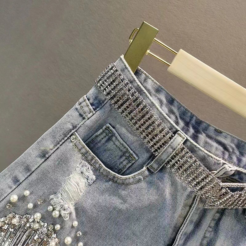 여성을위한 미국 중공업 구슬 다이아몬드 반바지 2025 여름 새로운 하이 웨이스트 스팽글 태슬 찢어진 와이드 레그 핫 팬츠 트렌디