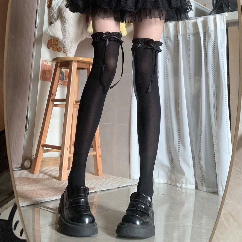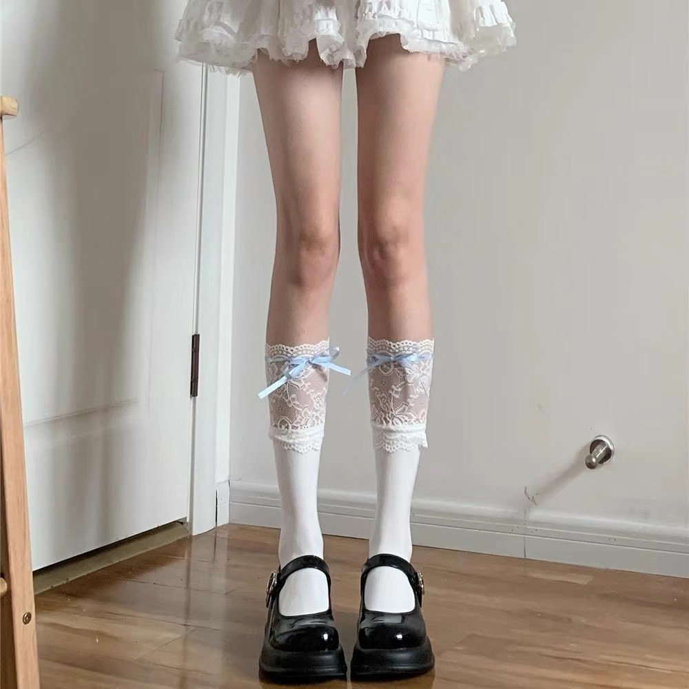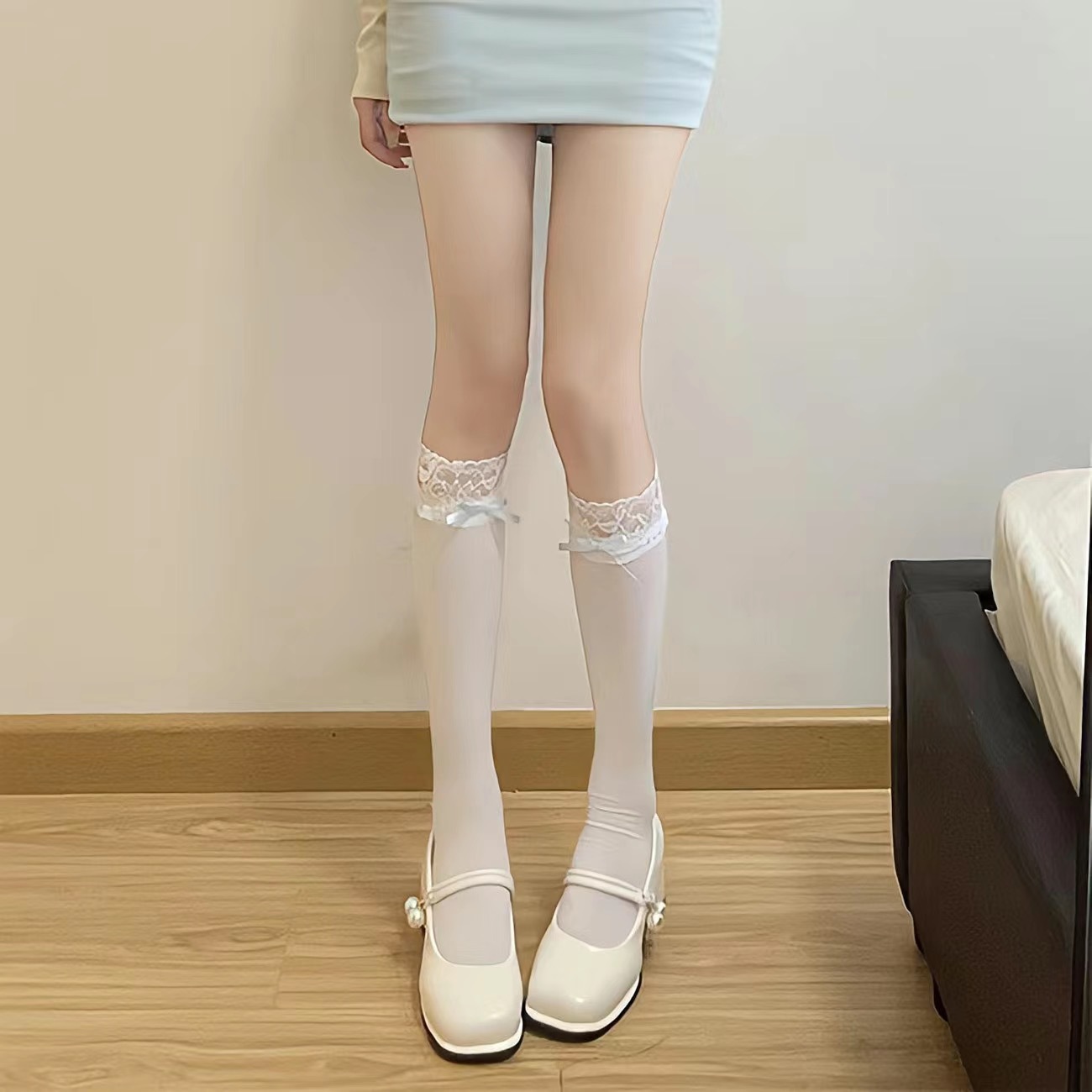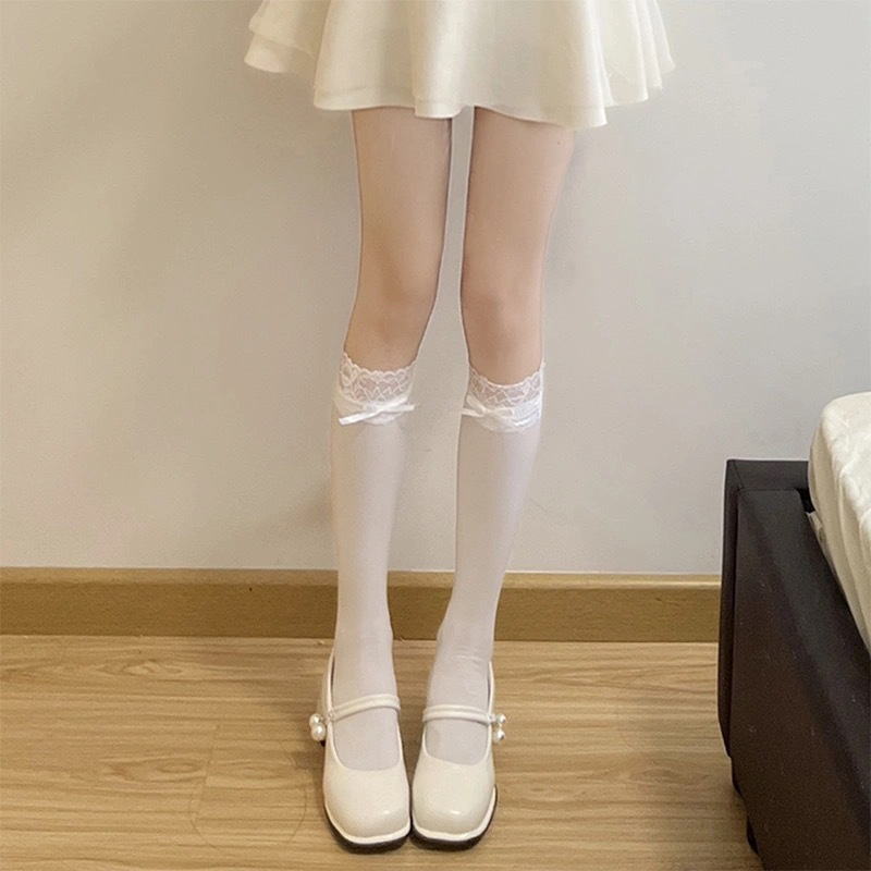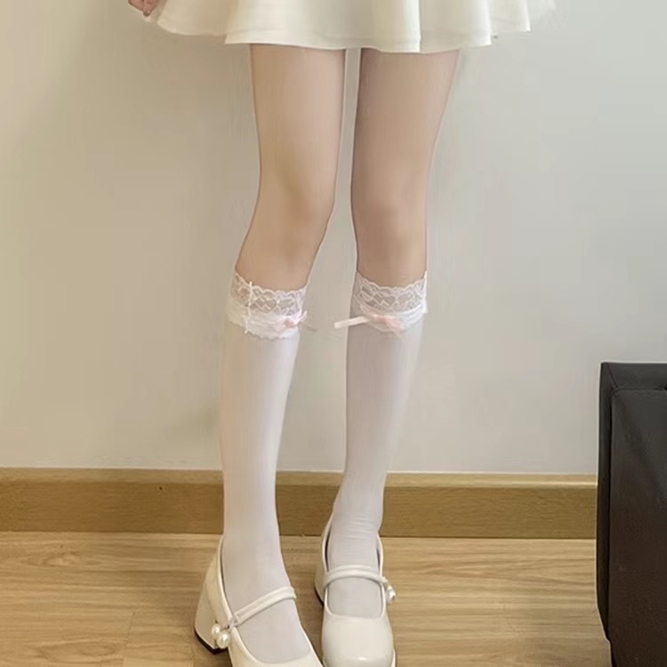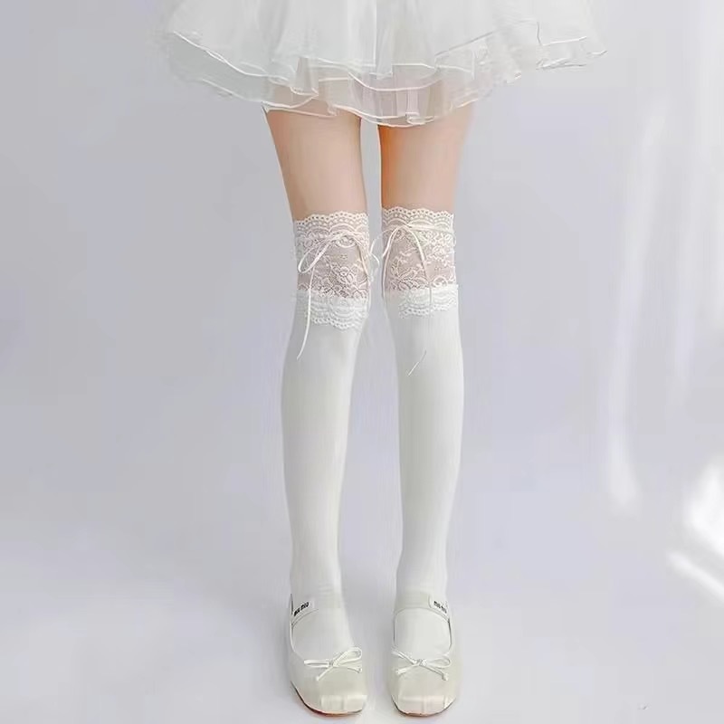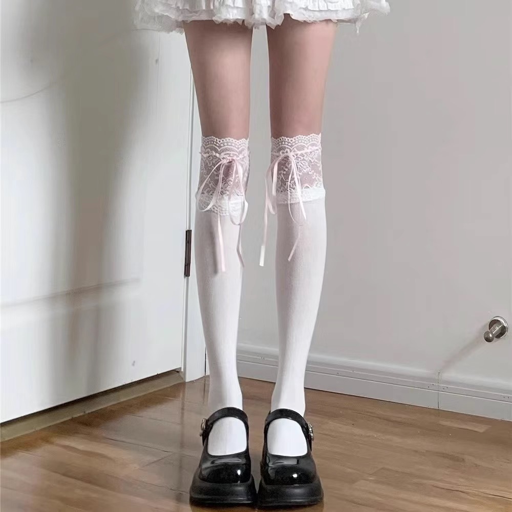 로리타 화이트 무릎 위 양말 여름 얇은 벨벳 하이 허벅지 양말 순수한 욕망 레이스 보우 스타킹