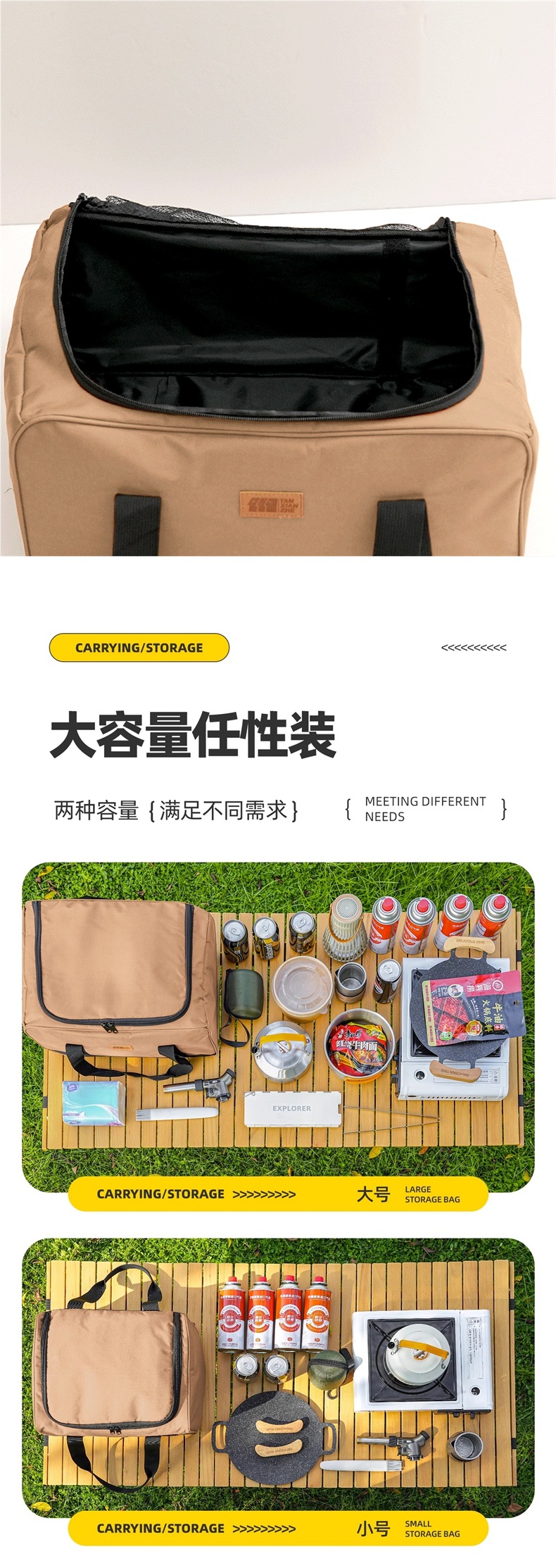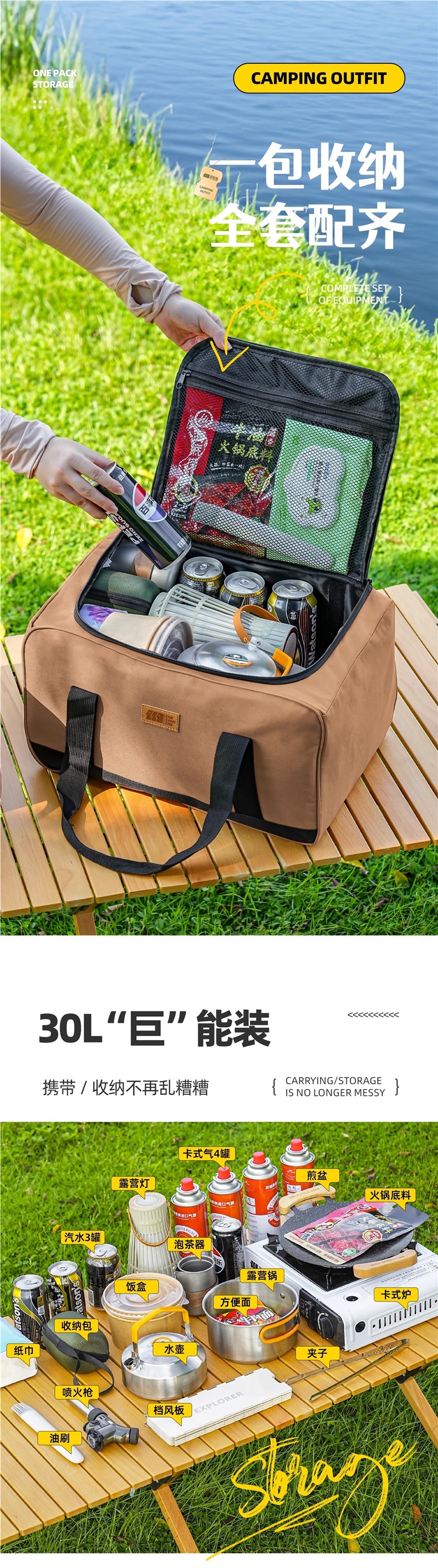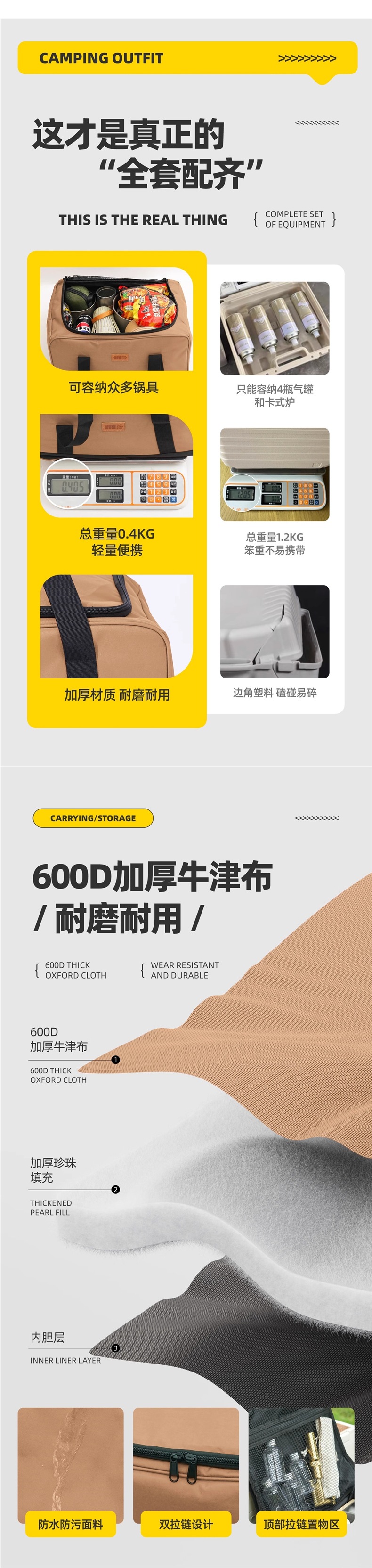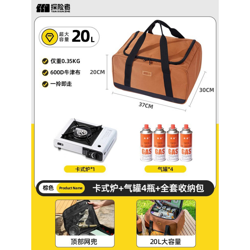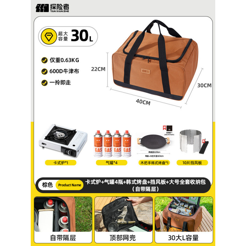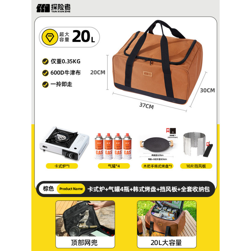 • 카세트 스토브 + 가스통 4개 + 냄비 및 팬 풀 세트 + 앞유리 + 대형 수납 가방 풀 세트(수납 공간 포함)