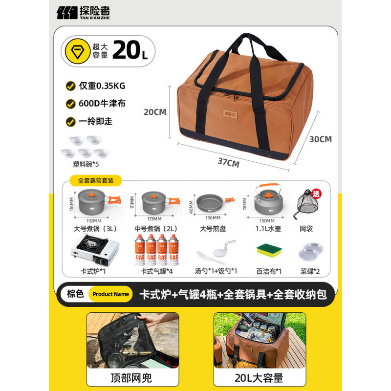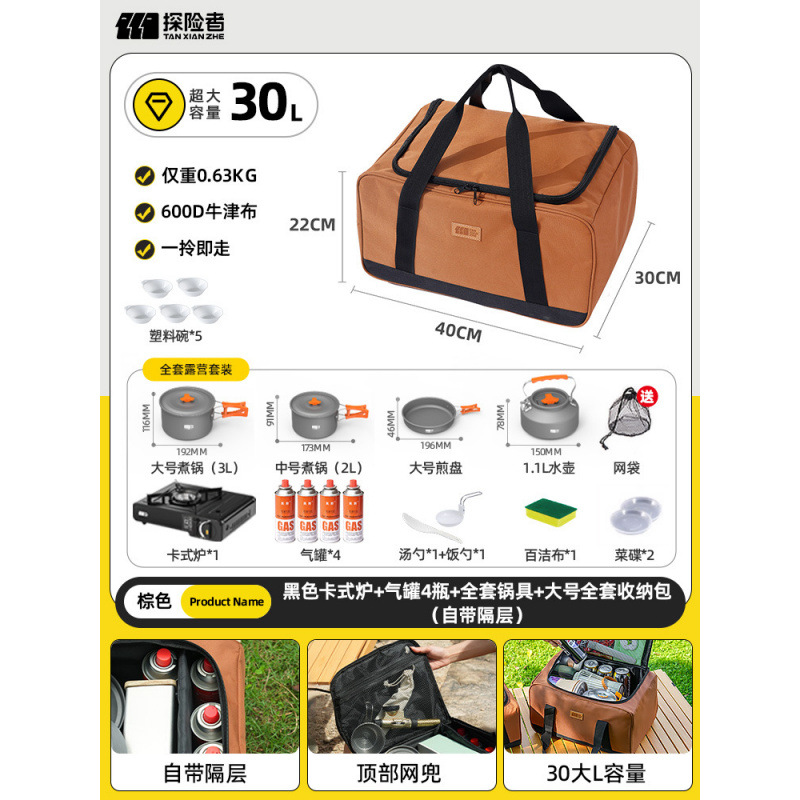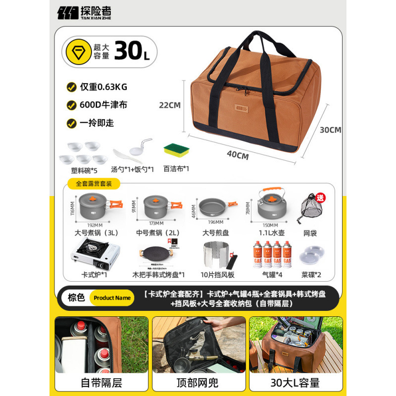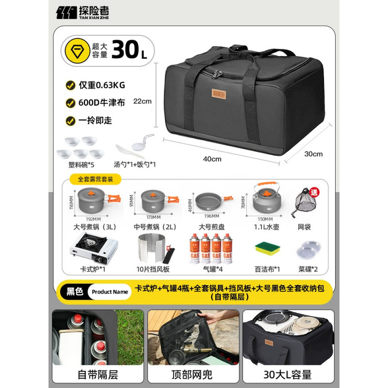 • 카세트 스토브 + 가스 탱크 4개 + 냄비 및 프라이팬 풀 세트 + 앞 유리 + 대형 검정색 풀 세트 보관 가방(별도 수납 공간 포함)