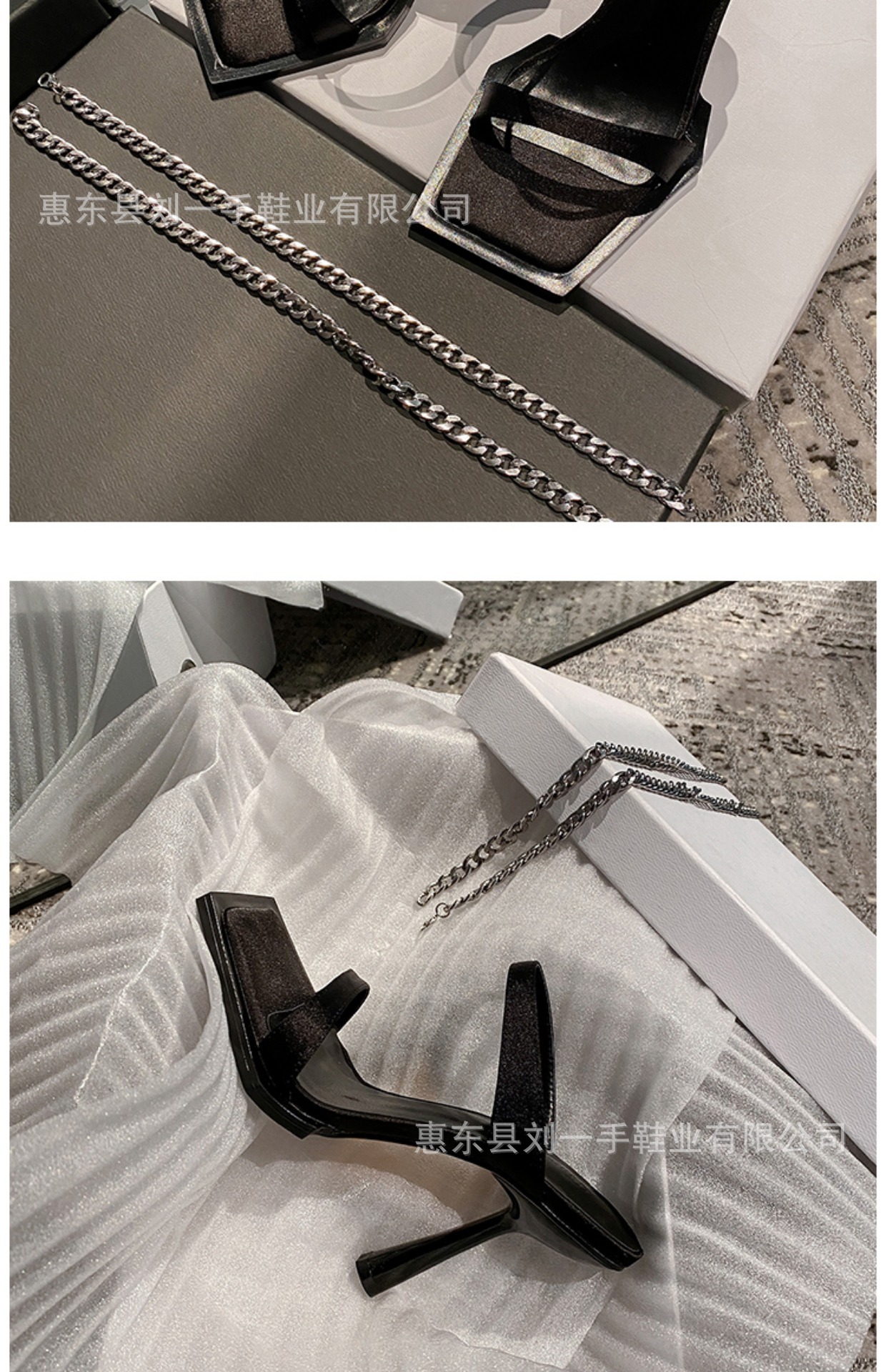 2025 새로운 여름 스퀘어 토 오픈 토우 하이힐 체인 정품 가죽 스틸레토 블랙 섹시한 샌들 여성용스토어 가기