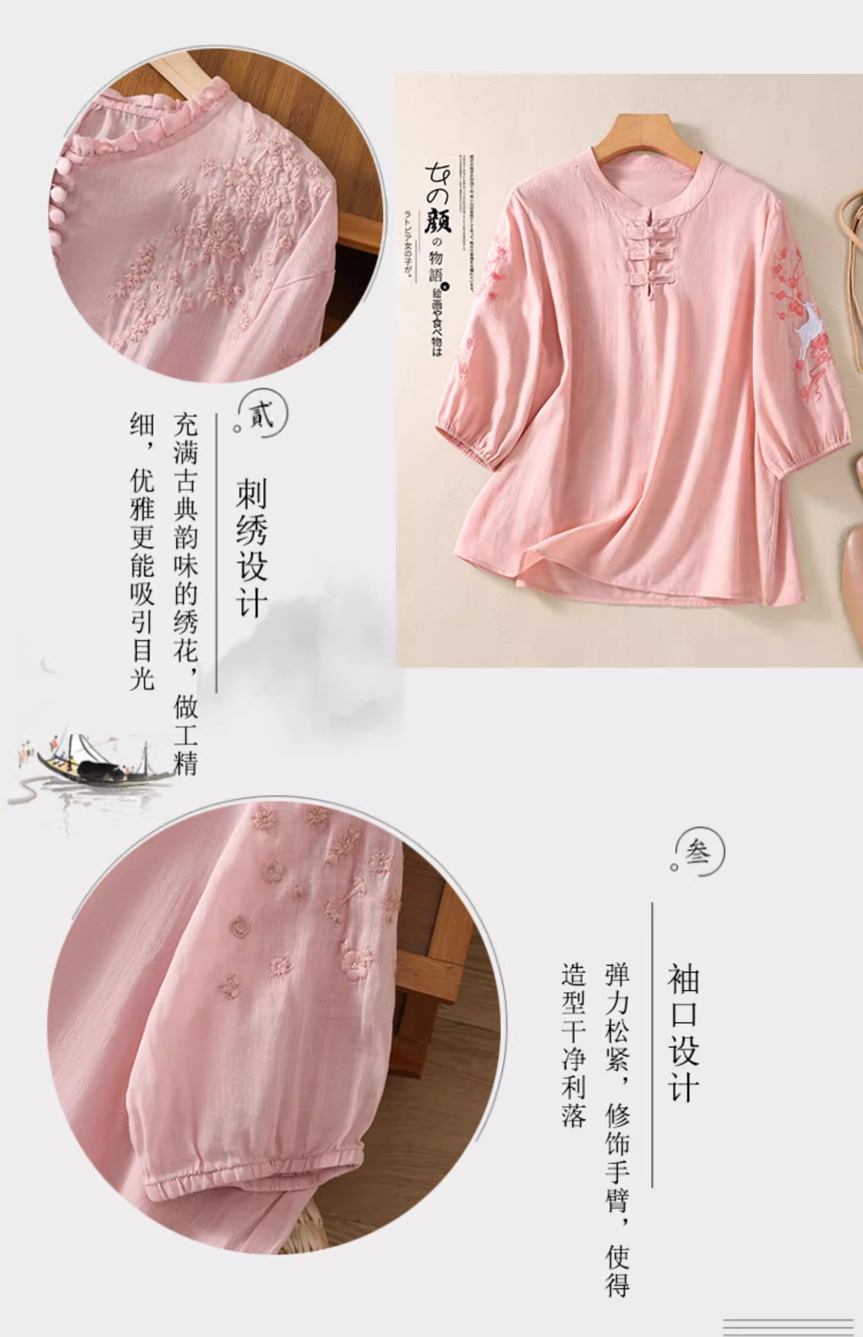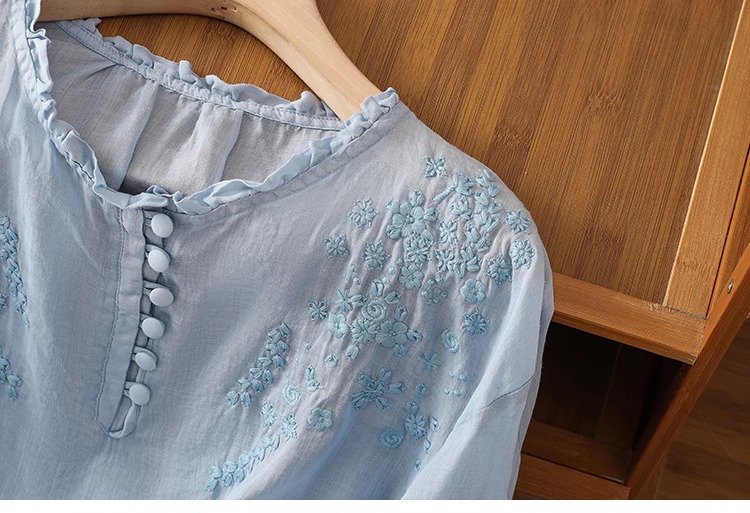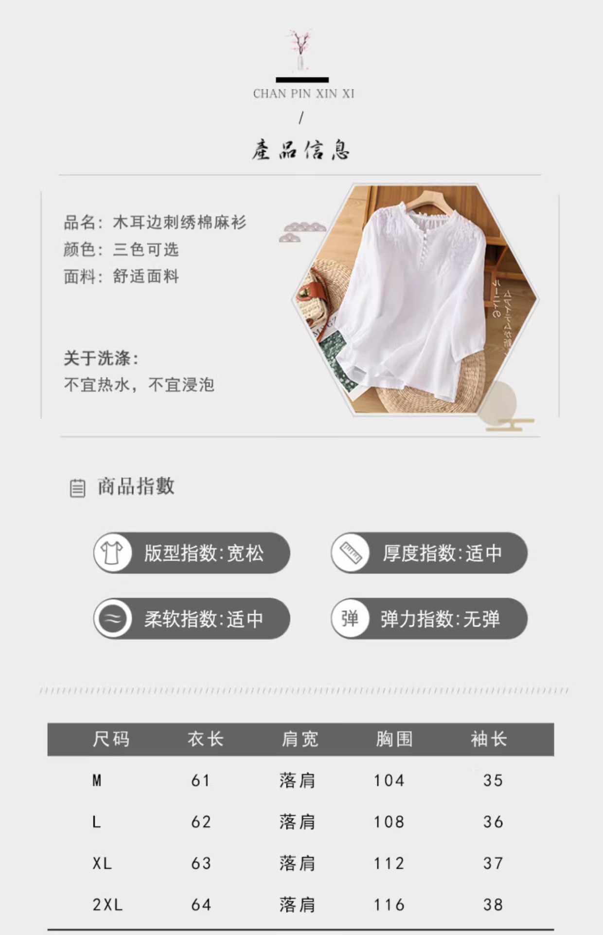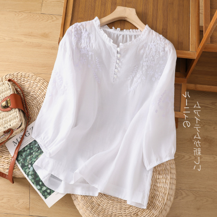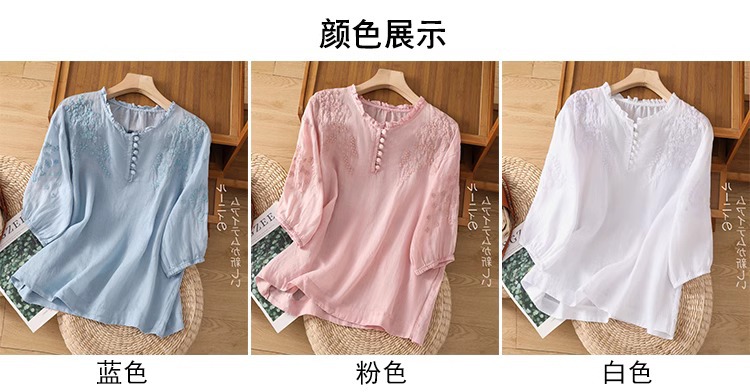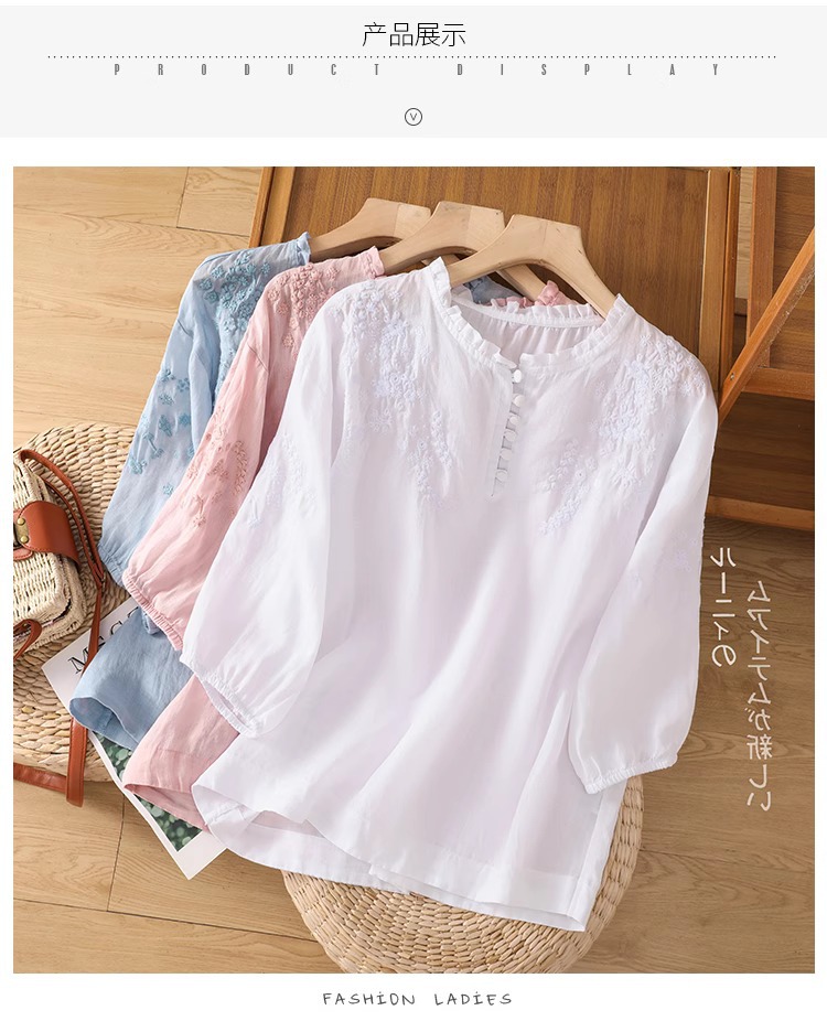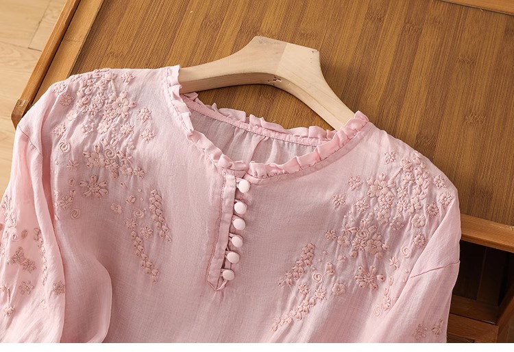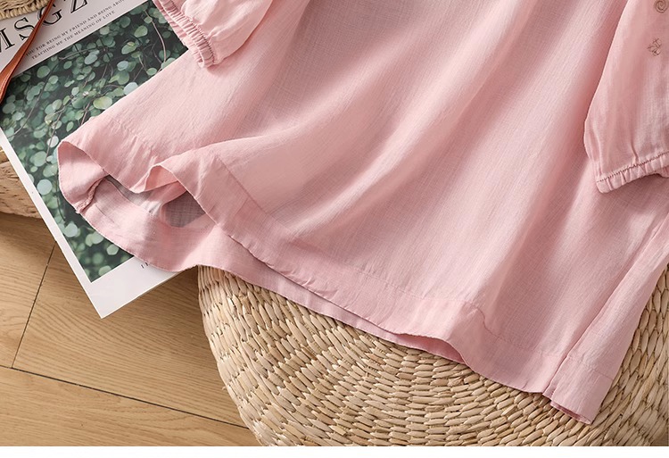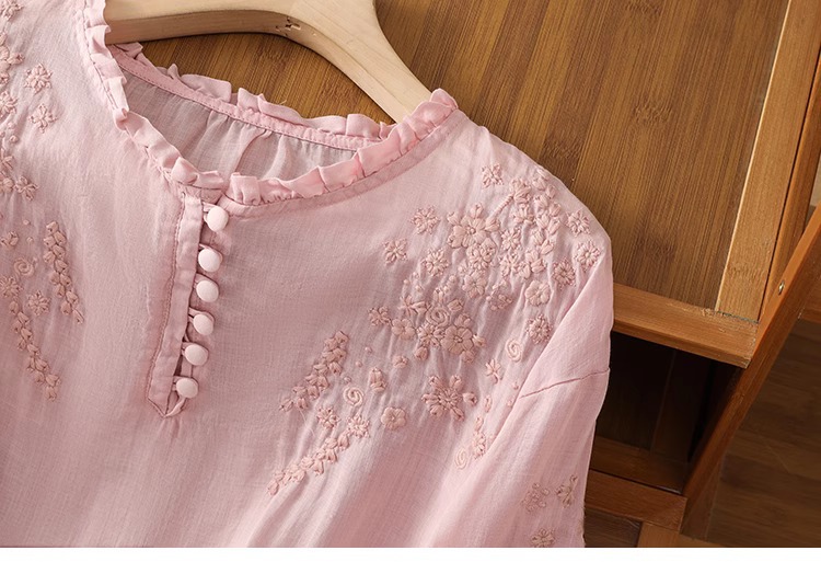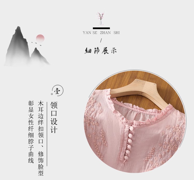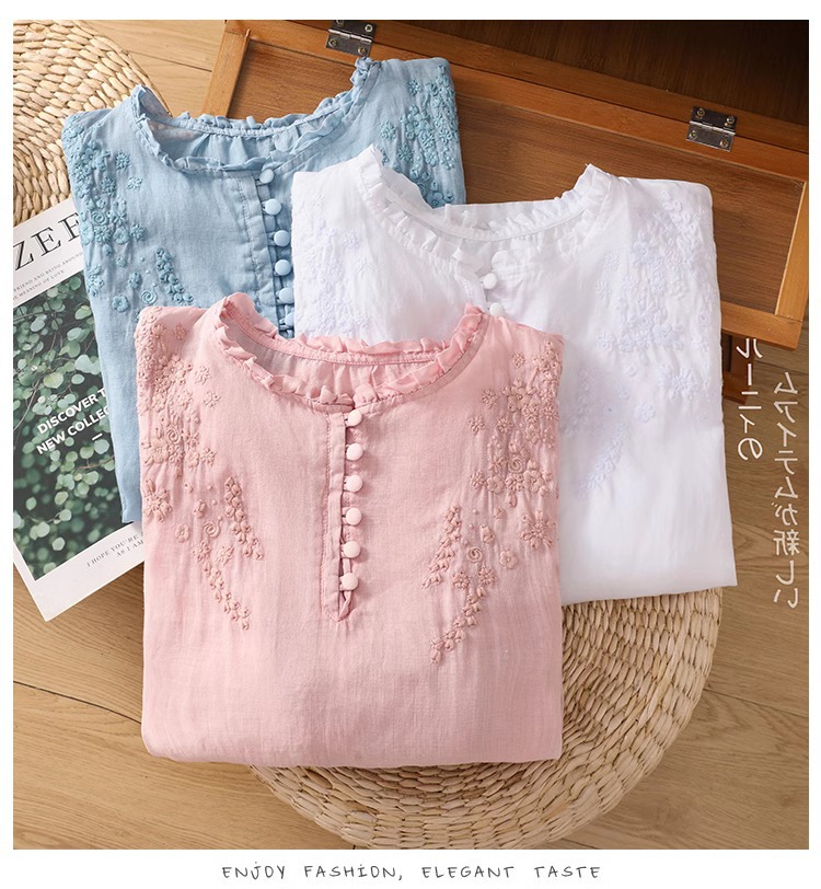 ***대형 브랜드 떨어진 상품 모시 반팔 티셔츠 여성 중공업 자수 레이스 얇은 면 및 린넨 셔츠 탑스토어 가기