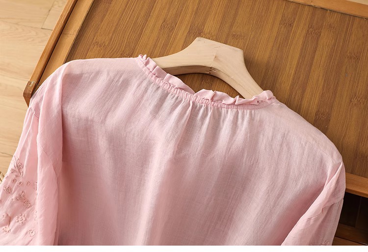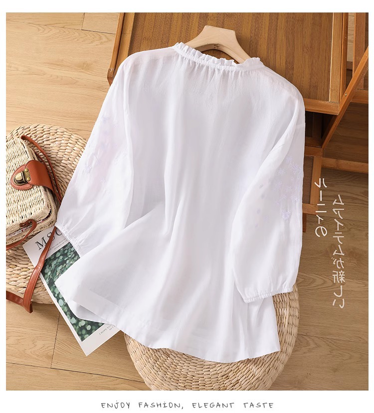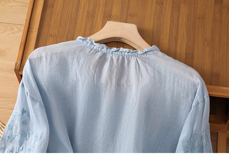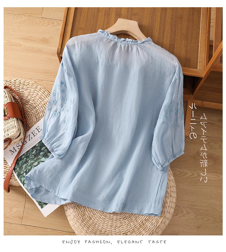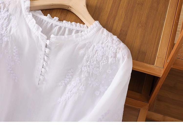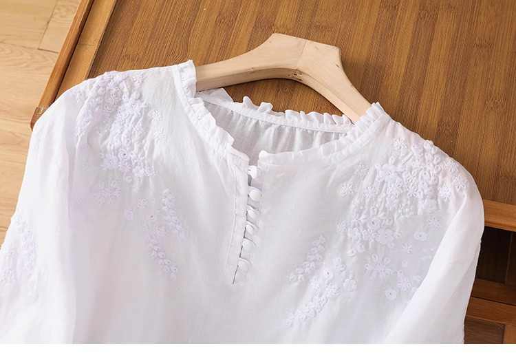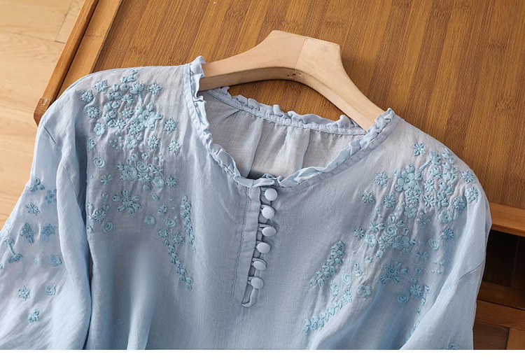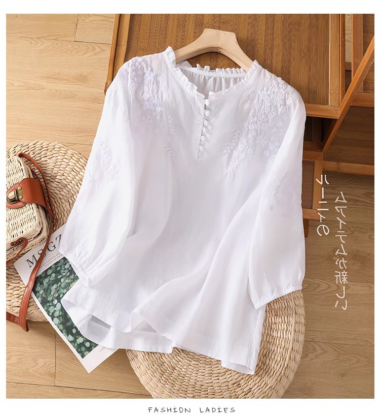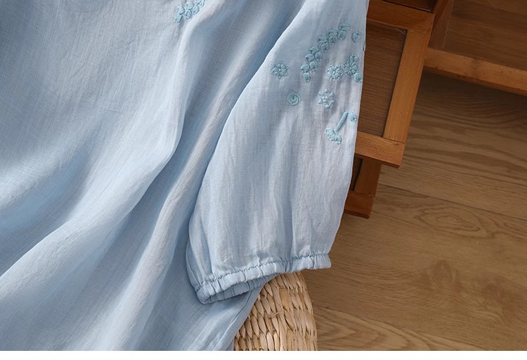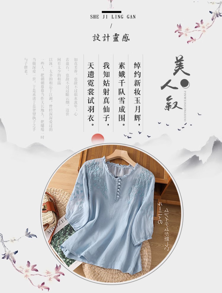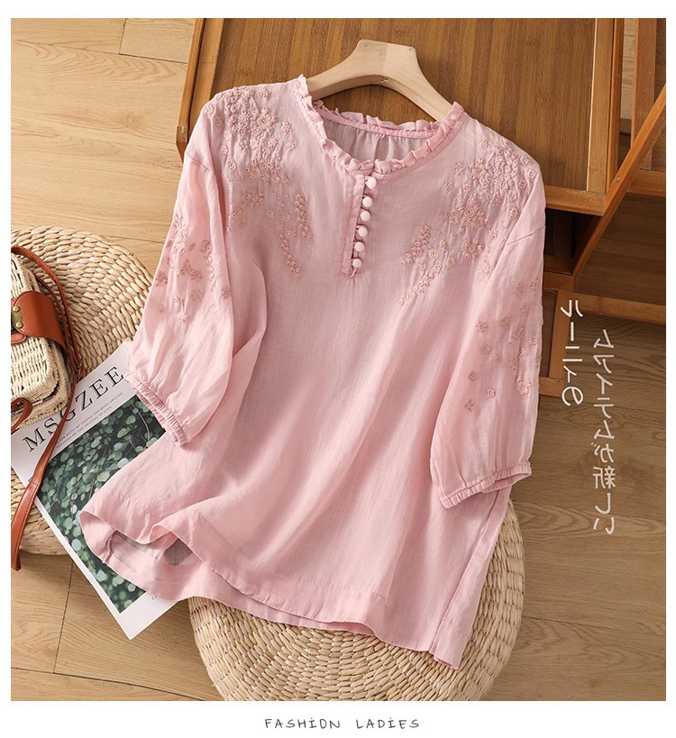 ***대형 브랜드 떨어진 상품 모시 반팔 티셔츠 여성 중공업 자수 레이스 얇은 면 및 린넨 셔츠 탑스토어 가기