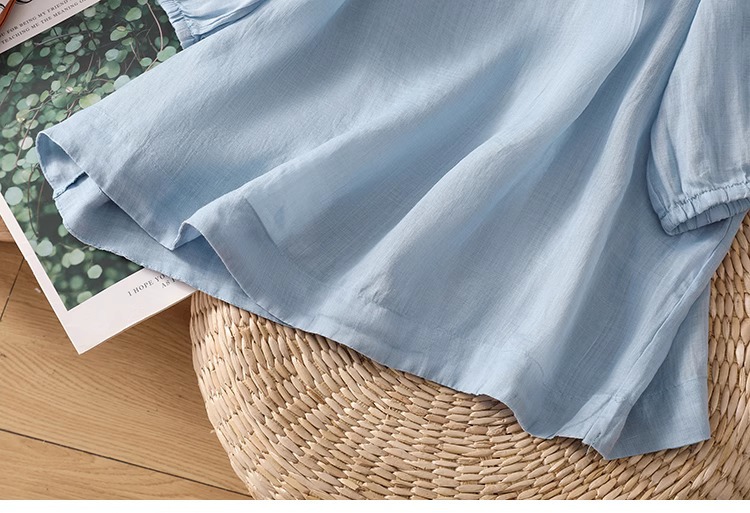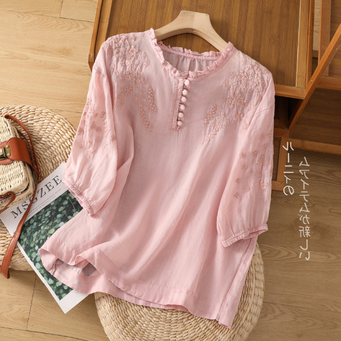 ***대형 브랜드 떨어진 상품 모시 반팔 티셔츠 여성 중공업 자수 레이스 얇은 면 및 린넨 셔츠 탑