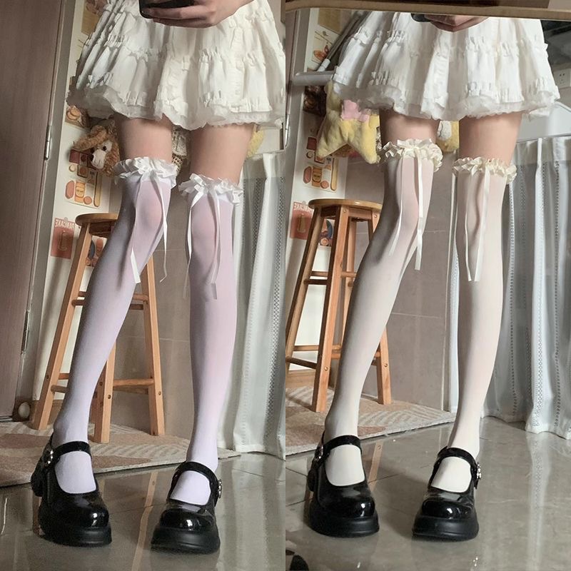 로리타 화이트 무릎 위 양말 여름 얇은 벨벳 하이 허벅지 양말 순수한 욕망 레이스 보우 스타킹