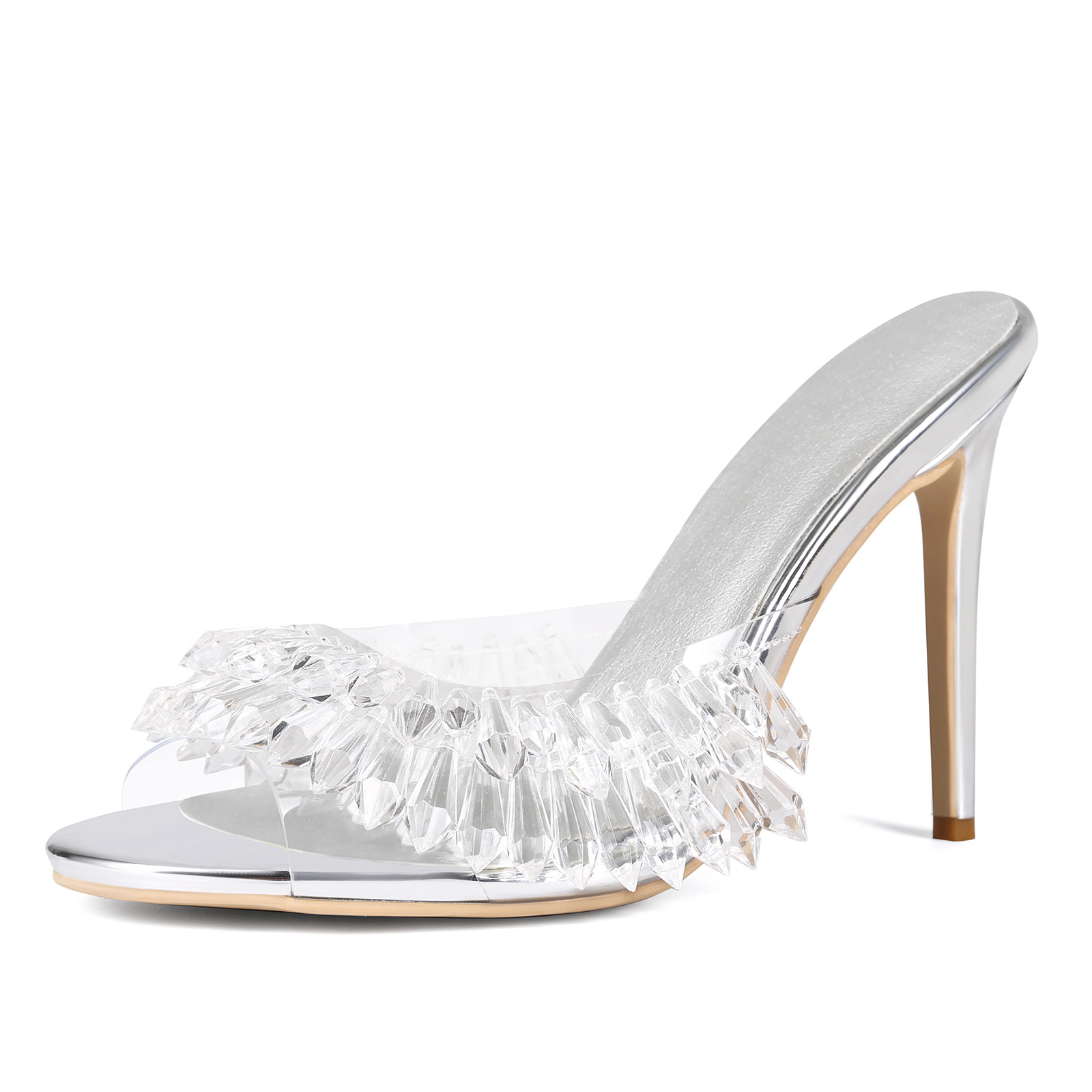 여름 유럽과 미국의 대외 무역 크로스 보더 실버 크리스탈 펜던트 수제 스틸레토 힐 연회 대형 여성 샌들 샌들