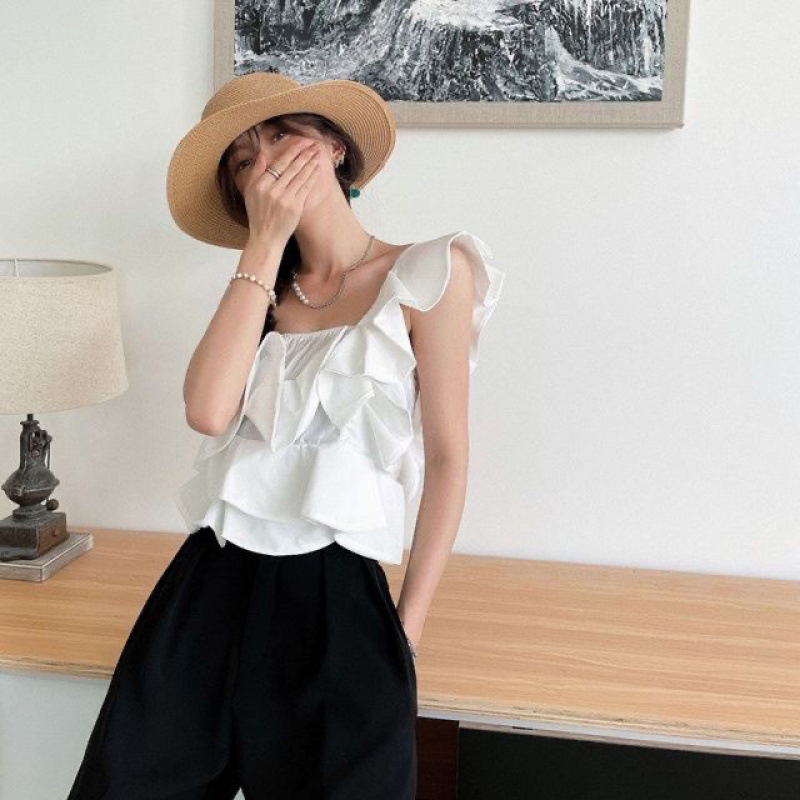 不规则露肩条纹衬衫女夏季设计感小众短款衬衣荷叶边减龄短袖上衣