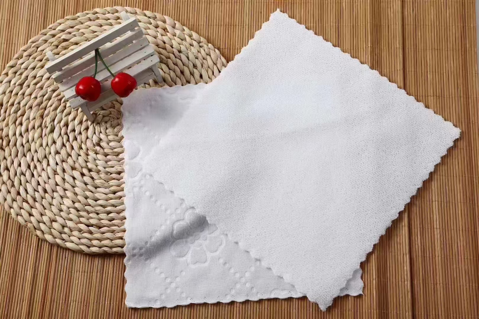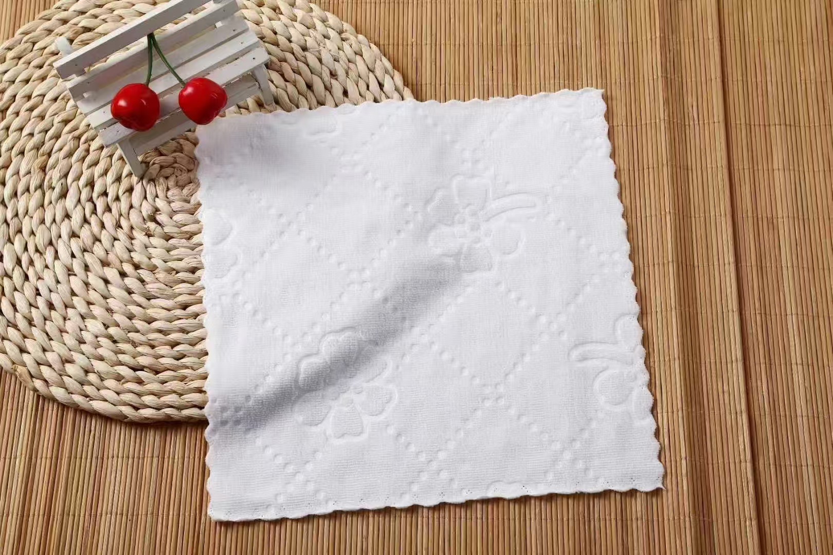 트리코타지 엠보싱 컷 에지 호텔 타월 작은 사각형 타월 흰색 사각형 타월 레이스 손수건 냅킨 도매 일회용스토어 가기