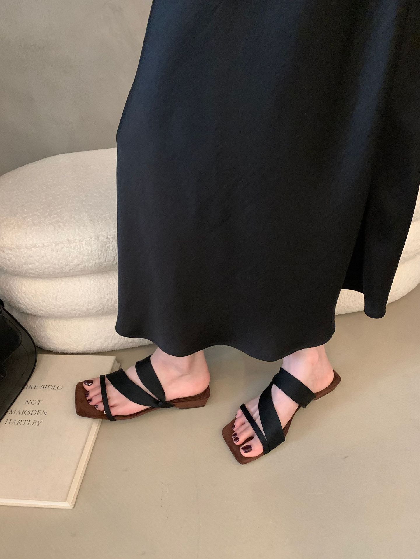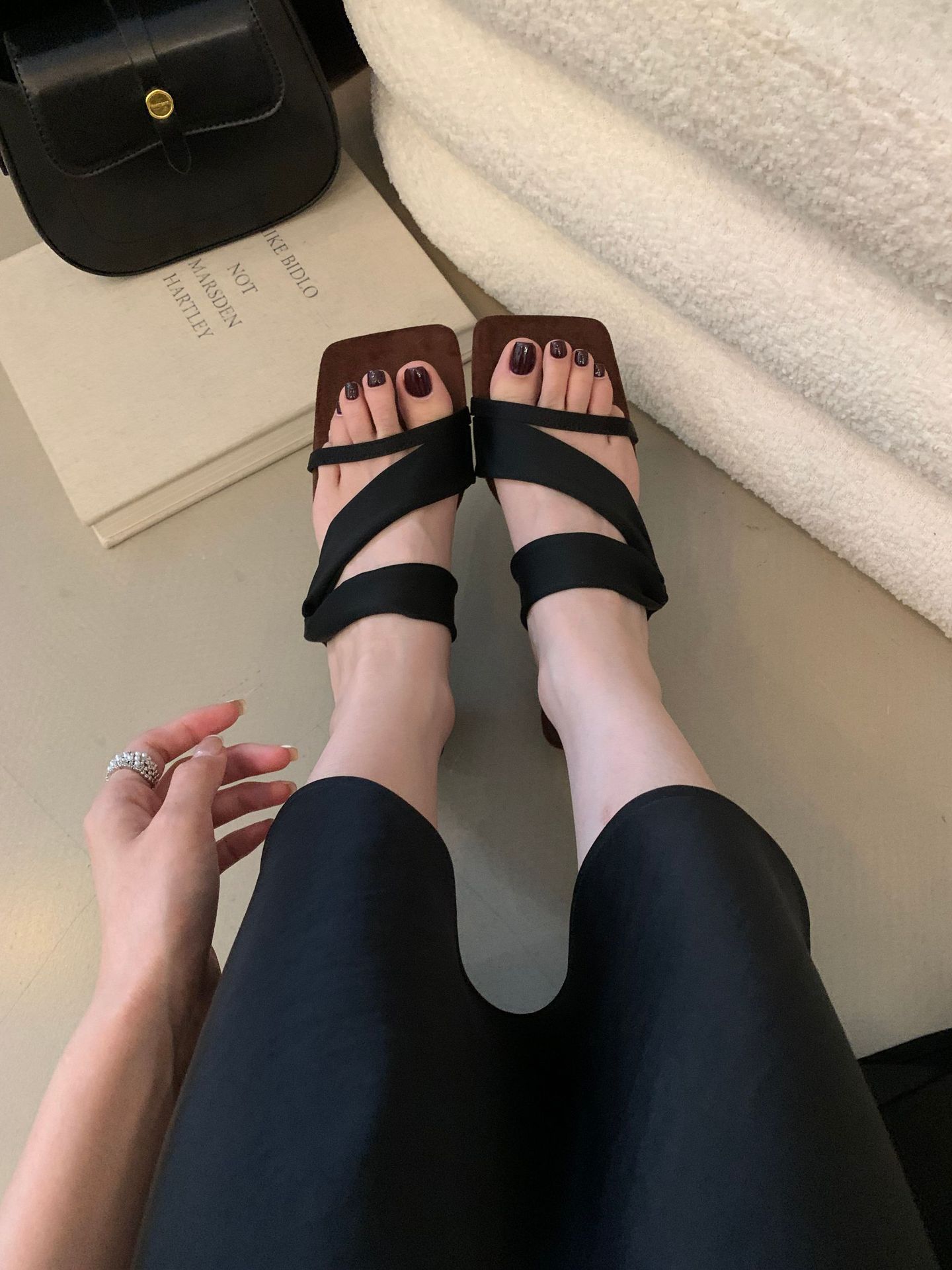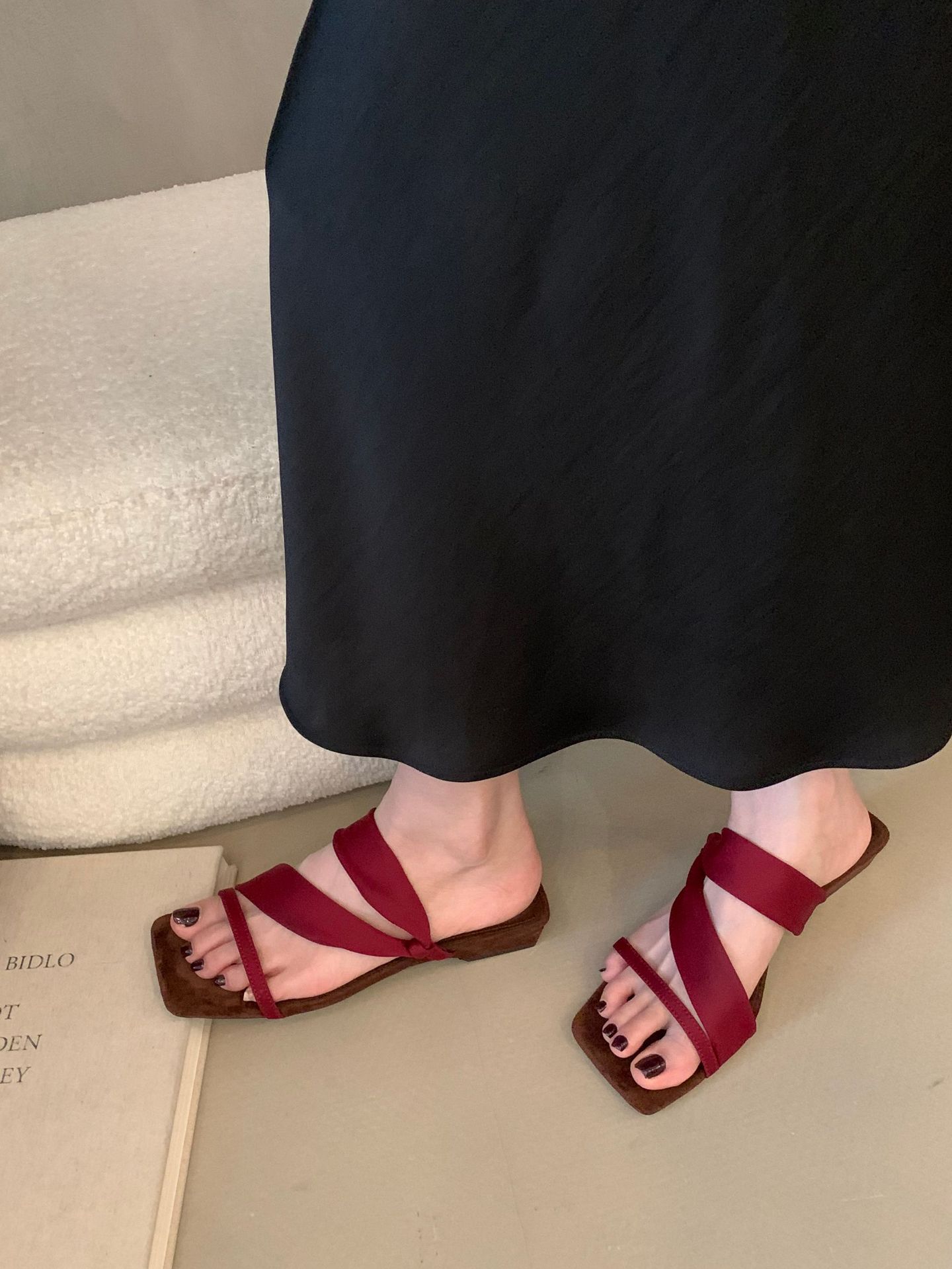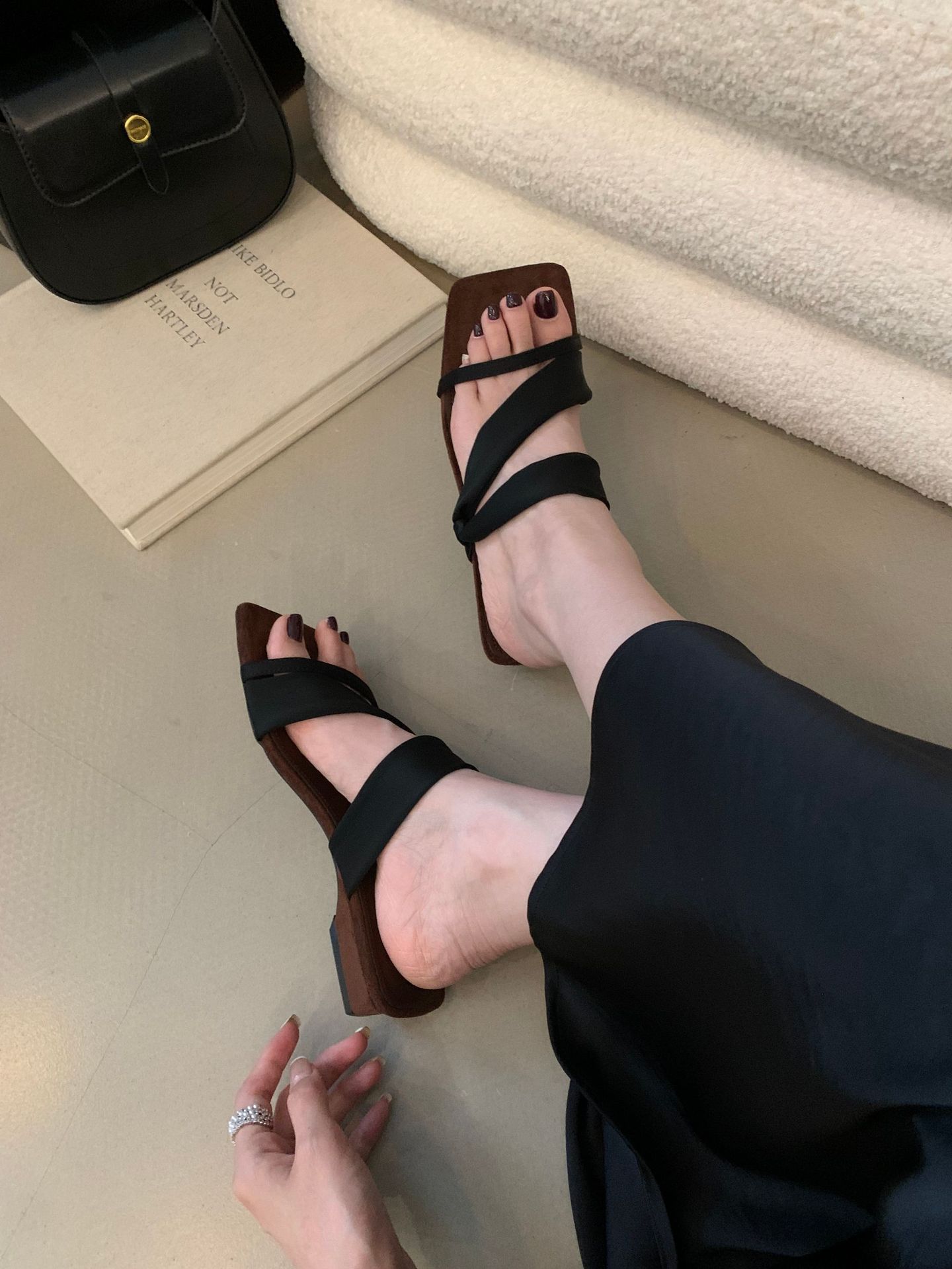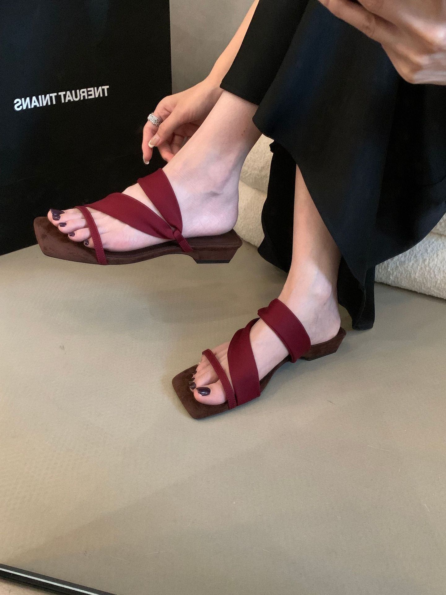 2025년 신상 여름 스타일 새틴 슬리퍼, 유럽과 미국 스타일의 웨지힐 슬리퍼, 여성용 패셔너블한 두꺼운 굽 샌들