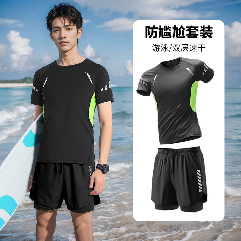 • 검정색과 녹색 반팔 + 검정색 수영 트렁크